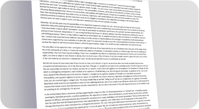 Paradox of Self-Amendment by Peter Suber E. Self-application No work of this kind is complete without inquiry into its self-referential consistency. If its conclusion is true, must it be false and vice versa? Does its existence subvert its claim to truth? The theory of direct acceptance is an empirical theory of law, falsifiable by empirical inquiry, but not falsifiable by any change of law. Changes of law may substitute another source of legal validity for acceptance, but only with contingent revocability — according to the direct acceptance theory. Acceptance cannot categorically dethrone itself or abdicate, so falsification should not be looked for from that direction. This should not be taken as an a priori part of the theory. For if direct acceptance is actually the alegal source of legal authority, then by its nature it will remain such with contingent immutability. An empirical theory may describe that characteristic without losing its empirical character. The Kadishes speculate that informing juries of their right to disregard judge's instructions on the law will "reduce the impact of judges' instructions...and invite jury nullification on a greater scale."[Note 55] One might argue that my very exposition may tend to reduce respect for positive law and invite "acceptable overruling" to a greater extent. Possibly —no one knows. I take the possibility seriously because some have blamed the American legal realists for the rise of fascism. The posited effect, however, seems just as likely whether my thesis is true or merely influential (falsely believed true). Hence, it is not my thesis that could be self-confirming but, if anything, its exposition. Moreover, if the theory is false, then becoming influential may make it true, as violations, departures, and transmutations are more and more accepted as valid. The authority would be acceptance, but the inspiration could be this (originally false) theory. One might find an analogy in the fact that Kelsen's theories were not cited in English courts until they were needed by former colonies to justify revolution. Naturally I do not rely upon any anticipated effect of my exposition to prove its content. Nor can I work up a genuine hope (or fear) that this exposition will justify anything that could not otherwise be justified from a more authoritative source (including those I cite on behalf of my thesis). I may have shown a way in which "immutable" rules may be approached by reformers. But if I have, this approach has been noticed before, for I learned it from historical interpretation. If I was wrong that these techniques are already valid law, then they may become valid law by a sort of self-fulfilling prophecy. There is a long tradition, especially in international law, of using the writing of jurists and scholars as an unofficial source of law. I cannot claim even that much authority. My claims as to the validity of transmutation or the contingent repealability of self-entrenchment clauses were supported by cases available to all plaintiffs, even if no cases exist directly on point for many hypothetical extensions of the theory. If I say that the repeal of self-entrenchment clauses is all for the good anyway, I begin a line of defense that I would rather not take to the end. The only effect of my exposition that I anticipate is a heightened sense of our responsibility for law. If we believe that even part of the origin of law lies in the commands of a deity, in innate and unalterable patterns of behavior, in immutable morality, or in formal logic, then we are masking our responsibility. The truth here may be terrifying. If law is too unwieldy for lay citizens to understand, too expensive for most to use to protect their rights, too slow to adapt to new threats to liberty, then the fault is ours. If the infinitude of untried concepts contains a gem, the job is ours to find it. No rule made by our ancestors is beyond our reach. Admitting that puts the burden of justification on our will. We did not choose to have every rule of law that we do have, and it distorts things to say we chose when we merely accepted. But we have accepted and tolerated every rule of law that we now have. Through our acceptance we exercise our sovereign power of authorizing law to be law. We are responsible not only for our choices, but also for our weaker, more hidden, thoughtless acts of acceptance. Our freedom to change the law, which is contingently omnipotent, need not lead us to a profusion of self-limiting rules, all contingently immutable, to quell our terror, nor to the mass repeal of the refined product of centuries. However, it should lead to a greater suspicion of formalist and naturalistic excuses for immutability, and a greater vigilance to arrest our lapses into bad faith. As citizens, advocates, legislators, and judges we are bound by existing rules, but not unremittingly or categorically. This essay should help us see that "being bound" by law is a complex idea, an organism of mutually dependent social practices and expectations with no immutable logical bones. We cannot simply throw off law as a fetter, for it is self-imposed for reasons that remain sound, but that deserve constant reexamination. But the form and content of this self-imposed structure of our freedom may be anything at all, contingently; it is up to us. In the United States there is immense case law supporting the proposition that the federal government is a "limited" one —limited by popular sovereignty, federalist principles, a written constitution, the separation of powers, checks and balances, judicial review, bicameralism, periodic election of officials, and supermajority requirements for many important events including constitutional amendment. This is another way to say that the rules that limit the federal government have repeatedly been respected, even while every rule of change down to the power of the Chicago City Council to make ordinances has contingent omnipoten