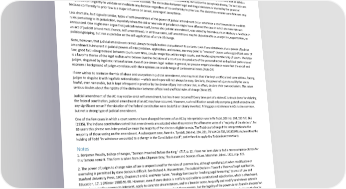 Paradox of Self-Amendment by Peter Suber crisis, then their self-serving decision will not have the desired effect. But we should not underestimate the ability of judges to make their acts of judicial amendment sound like inevitable consequences of universally acknowledged principles of existing law. This type of self-amendment may be clarified by a distinction. Judicial review may make the final decision of the highest court "legal" per se; but on the other hand, the rules that constitute the judiciary and the rules it interprets may allow us to consider some final decisions of the highest court "illegal". In the formal case, courts may always protect their prerogatives by throwing up legally valid rules superior to any that might repeal them, including formal amendments. In the latter case, courts might in some cases be protecting their prerogatives only by revolutionary acts that are subsequently accepted. Courts that have enjoyed respect in the past will not find it difficult to make their revolutionary decisions look as valid as their lawful decisions,[Note 23] which will contribute greatly to their subsequent acceptability. But under the acceptance theory, the best reasons may fail to win actual acceptance, while the flimsiest succeed. The distinction between legal and illegal decisions is blurred by the power of acceptance contingently to validate or invalidate any decision regardless of its conformity to prior law. The distinction retains some firmness only because conformity to prior law is a major influence on actual, contingent acceptance. Less dramatic, but logically similar, types of self-amendment of the power of judicial amendment occur whenever a court overrules or modifies rules pertaining to its jurisdiction, especially when the old or new rule of jurisdiction might have affected the case in which the new rule was announced. One might even argue that judicial review itself, hence also judicial amendment, was seized by federal courts in Marbury v. Madison in an act of judicial amendment (hence, self-amendment). In all these cases, self-amendment may be objectionable as usurpation, opportunism, or political grasping, but not as paradox or the self-application of a rule of change. Note, however, that judicial amendment cannot always be explained as usurpation or its variants. Even if one disbelieves that a power of judicial amendment is inherent in judicial powers of interpretation, application, and review, one may point to "innocent" causes such as good faith error of law, good faith disagreement between courts over time, circular majorities within single courts, and the changing membership of courts. The latter is a favorite theme of the legal realists who believe that the decisions of a court are the products of the personal moral and political preference of judges, disguised by legalistic rationalization. Even if one denies legal realism in general, impressive empirical evidence exists that the social and economic background of judges correlates with their opinions on a wide range of controversial cases.[Note 24] If one wishes to minimize the risk of abuse and usurpation in judicial amendment, one may insist that it be kept unofficial and surreptitious, forcing judges to disguise it with legalistic rationalization —which one hopes will not always be easy. Similarly, the power of a jury to nullify the law is lawful, even venerable, but is kept infrequent in practice by the device of jury instructions that, in effect, declare their own exclusivity. This raises serious doubts about the rigidity of the distinction between official and unofficial rules of change.[Note 25] Judicial amendment of the AC may not be strict self-amendment, but has it ever occurred? Every time part of a state AC is struck down for violating the federal constitution, judicial amendment of an AC may have occurred. However, such nullification would only comprise judicial amendment in any significant sense if the violation of the federal constitution were doubtful or clearly invented. Filling gaps and silences in ACs is also common, but not a strong type of judicial amendment. One of the few cases in which a court seems to have changed the terms of an AC by interpretation was In Re Todd, 208 Ind. 168, 193 N.E. 865 (1935). The Indiana constitution stated that amendments are adopted when they receive the affirmative votes of a "majority of the electors". For 83 years this phrase was interpreted by mean the majority of the electors eligible to vote. The Todd court changed the interpretation to the majority of those voting on the amendment. A subsequent case, Swank v. Tyndall, 266 Ind. 204, 221, 78 N.W.2d 535, 542 (1948) declared that the holding of Todd "in substance amounted to a change in the Constitution itself", and refused to apply the Todd rule retroactively. Notes 1. Benjamin Hoadly, Bishop of Bangor, "Sermon Preached Before the King," 1717, p. 12. I have not been able to find a more complete citation for this famous remark. This form is taken from John Chipman Gray, The Nature and Sources of Law, Macmillan, 2d ed., 1921, at p. 125. 2. The power of judges to change rules of law is unquestioned for the rules of common law, although specifying just when modification or overruling is permitted by stare decisis is difficult. See Richard A. Wasserstrom, The Judicial Decision: Toward a Theory of Legal Justification, Stanford University Press, 1961, Chapters 3 and 4; and Peter Suber, "Analogy Exercises for Teaching Legal Reasoning," Journal of Law and Education, 17, 1 (Winter 1988) 91-98. However, even if stare decisis is not fully applicable to constitutional adjudication, which is often heard, judges have similar powers to interpret, apply to concrete circumstances, and in a broader sense, to qualify and modify to whatever extent is acceptable or accepted. A theory of constitutional adjudication may limit these powers, but the legality of the powers is not found in theories but in the history of what