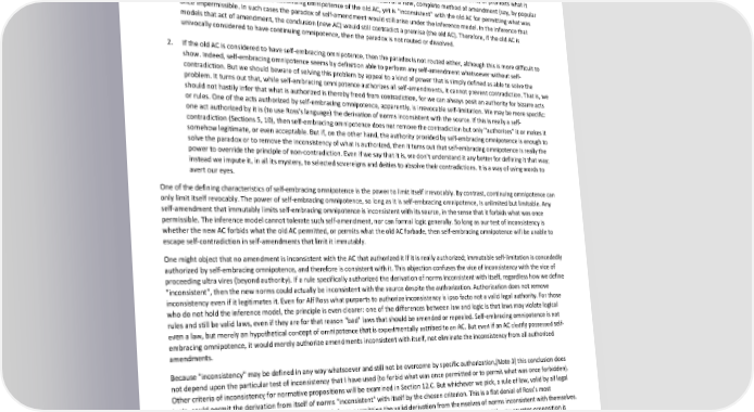 Paradox of Self-Amendment by Peter Suber from any magical propensities of law and theology to absorb and forgive contradiction. Therefore, the question is whether continuing and self- embracing omnipotence can each, when considered separately and without equivocation, give rise to the paradox of self-amendment. 1. If the AC is thought to have continuing omnipotence, then irrevocable self-limitation and self-repeal (but not revocable self-limitation or non-limiting self-amendment) are precluded as ultra vires. However, self-amendment that does not limit either the omnipotence or the continuing character of the omnipotence of the AC would still be possible. We must ask whether such self-amendment can give us a new, amended AC that is inconsistent with the present AC; if so, then under the inference model the paradox will still arise. The answer to the question is yes, if by "inconsistent" we mean that the new AC permits what was impermissible under the old AC, or prohibits what it permitted (see Section 12.C). For example, self-amendment by the addition of a new, complete method of amendment (say, by popular referendum) would not limit the continuing omnipotence of the old AC, yet is "inconsistent" with the old AC for permitting what was once impermissible. In such cases the paradox of self-amendment would still arise under the inference model. In the inference that models that act of amendment, the conclusion (new AC) would still contradict a premise (the old AC). Therefore, if the old AC is univocally considered to have continuing omnipotence, then the paradox is not routed or dissolved. 2. If the old AC is considered to have self-embracing omnipotence, then the paradox is not routed either, although this is more difficult to show. Indeed, self-embracing omnipotence seems by definition able to perform any self-amendment whatsoever without self- contradiction. But we should beware of solving this problem by appeal to a kind of power that is simply defined as able to solve the problem. It turns out that, while self-embracing omnipotence authorizes all self-amendments, it cannot prevent contradiction. That is, we should not hastily infer that what is authorized is thereby freed from contradiction, for we can always posit an authority for bizarre acts or rules. One of the acts authorized by self-embracing omnipotence, apparently, is irrevocable self-limitation. We may be more specific: one act authorized by it is (to use Ross's language) the derivation of norms inconsistent with the source. If this is really a self- contradiction (Sections 5, 10), then self-embracing omnipotence does not remove the contradiction but only "authorizes" it or makes it somehow legitimate, or even acceptable. But if, on the other hand, the authority provided by self-embracing omnipotence is enough to solve the paradox or to remove the inconsistency of what is authorized, then it turns out that self-embracing omnipotence is really the power to override the principle of non-contradiction. Even if we say that it is, we don't understand it any better for defining it that way; instead we impute it, in all its mystery, to selected sovereigns and deities to absolve their contradictions. It is a way of using words to avert our eyes. One of the defining characteristics of self-embracing omnipotence is the power to limit itself irrevocably. By contrast, continuing omnipotence can only limit itself revocably. The power of self-embracing omnipotence, so long as it is self-embracing omnipotence, is unlimited but limitable. Any self-amendment that immutably limits self-embracing omnipotence is inconsistent with its source, in the sense that it forbids what was once permissible. The inference model cannot tolerate such self-amendment, nor can formal logic generally. So long as our test of inconsistency is whether the new AC forbids what the old AC permitted, or permits what the old AC forbade, then self-embracing omnipotence will be unable to escape self-contradiction in self-amendments that limit it immutably. One might object that no amendment is inconsistent with the AC that authorized it if it is really authorized; immutable self-limitation is concededly authorized by self-embracing omnipotence, and therefore is consistent with it. This objection confuses the vice of inconsistency with the vice of proceeding ultra vires (beyond authority). If a rule specifically authorized the derivation of norms inconsistent with itself, regardless how we define "inconsistent", then the new norms could actually be inconsistent with the source despite the authorization. Authorization does not remove inconsistency even if it legitimates it. Even for Alf Ross what purports to authorize inconsistency is ipso facto not a valid legal authority. For those who do not hold the inference model, the principle is even clearer: one of the differences between law and logic is that laws may violate logical rules and still be valid laws, even if they are for that reason "bad" laws that should be amended or repealed. Self-embracing omnipotence is not even a law, but merely an hypothetical concept of omnipotence that is experimentally ascribed to an AC. But even if an AC clearly possessed self- embracing omnipotence, it would merely authorize amendments inconsistent with itself, not eliminate the inconsistency from all authorized amendments. Because "inconsistency" may be defined in any way whatsoever and still not be overcome by specific authorization,[Note 3] this conclusion does not depend upon the particular test of inconsistency that I have used (to forbid what was once permitted or to permit what was once forbidden). Other criteria of inconsistency for normative propositions will be examined in Section 12.C. But whichever we pick, a rule of law, valid by all legal tests, could permit the derivation from itself of norms "inconsistent" with itself by the chosen criterion. This is a flat denial of Ross's most fundamental premise, that forbids all rules o