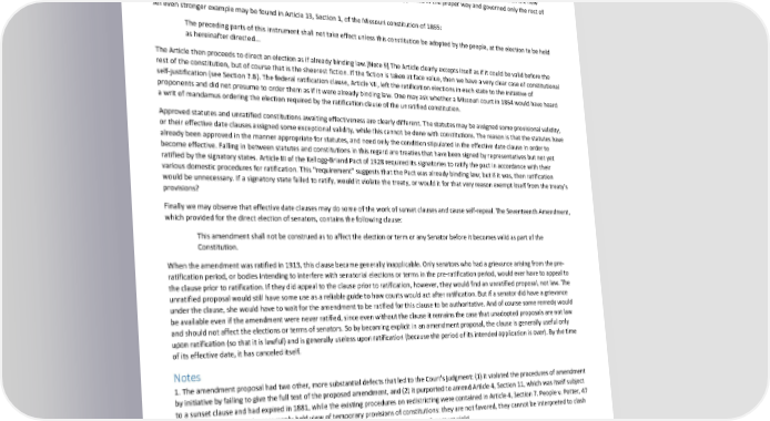 Paradox of Self-Amendment by Peter Suber that, like totally self-repealing sunset clauses, effective date clauses frequently occur in the very sections they control. And as with sunset clauses, we can tighten this language in order to examine the logic of the problem: This section, including this very sentence, shall become effective to all intents and purposes only at... But even if the solution can be made applicable to statutes, it cannot apply to effective date clauses, or ratification clauses, in constitutions.[Note 8] Article VII of the federal constitution states that the document of which it is a part shall become effective when ratified in a certain way. In the two years between its drafting in 1787 and its ratification in 1789, Article VII authoritatively told courts and all interested parties that the new constitution was not yet effective. One cannot argue that Article VII had already been approved in the proper way and governed only the rest of the constitution. An even stronger example may be found in Article 13, Section 1, of the Missouri constitution of 1865: The preceding parts of this instrument shall not take effect unless this constitution be adopted by the people, at the election to be held as hereinafter directed... The Article then proceeds to direct an election as if already binding law.[Note 9] The Article clearly excepts itself as if it could be valid before the rest of the constitution, but of course that is the sheerest fiction. If the fiction is taken at face value, then we have a very clear case of constitutional self-justification (see Section 7.B). The federal ratification clause, Article VII, left the ratification elections in each state to the initiative of proponents and did not presume to order them as if it were already binding law. One may ask whether a Missouri court in 1864 would have heard a writ of mandamus ordering the election required by the ratification clause of the unratified constitution. Approved statutes and unratified constitutions awaiting effectiveness are clearly different. The statutes may be assigned some provisional validity, or their effective date clauses assigned some exceptional validity, while this cannot be done with constitutions. The reason is that the statutes have already been approved in the manner appropriate for statutes, and need only the condition stipulated in the effective date clause in order to become effective. Falling in between statutes and constitutions in this regard are treaties that have been signed by representatives but not yet ratified by the signatory states. Article III of the Kellogg-Briand Pact of 1928 required its signatories to ratify the pact in accordance with their various domestic procedures for ratification. This "requirement" suggests that the Pact was already binding law; but if it was, then ratification would be unnecessary. If a signatory state failed to ratify, would it violate the treaty, or would it for that very reason exempt itself from the treaty's provisions? Finally we may observe that effective date clauses may do some of the work of sunset clauses and cause self-repeal. The Seventeenth Amendment, which provided for the direct election of senators, contains the following clause: This amendment shall not be construed as to affect the election or term or any Senator before it becomes valid as part of the Constitution. When the amendment was ratified in 1913, this clause became generally inapplicable. Only senators who had a grievance arising from the pre- ratification period, or bodies intending to interfere with senatorial elections or terms in the pre-ratification period, would ever have to appeal to the clause prior to ratification. If they did appeal to the clause prior to ratification, however, they would find an unratified proposal, not law. The unratified proposal would still have some use as a reliable guide to how courts would act after ratification. But if a senator did have a grievance under the clause, she would have to wait for the amendment to be ratified for this clause to be authoritative. And of course some remedy would be available even if the amendment were never ratified, since even without the clause it remains the case that unadopted proposals are not law and should not affect the elections or terms of senators. So by becoming explicit in an amendment proposal, the clause is generally useful only upon ratification (so that it is lawful) and is generally useless upon ratification (because the period of its intended application is over). By the time of its effective date, it has canceled itself. Notes 1. The amendment proposal had two other, more substantial defects that led to the Court's judgment: (1) it violated the procedures of amendment by initiative by failing to give the full text of the proposed amendment, and (2) it purported to amend Article 4, Section 11, which was itself subject to a sunset clause and had expired in 1881, while the existing procedures on redistricting were contained in Article 4, Section 7. People v. Potter, 47 N.Y. 375 (1872) asserted a commonly held view of temporary provisions of constitutions: they are not favored, they cannot be interpreted to clash with the "general design" of the constitutions, and in conflicts with other provisions they must yield. 2. On the issue of particularity the court said at id. 694 that a proper constitutional rule on redistricting simply points out a plan or method for such redistricting, and prescribes permanent rules and principles for carrying out such method or plan. On the other hand, the matter of actually redistricting is a matter of very temporary character. On the need for changing the provision the court said at id. 694 that senatorial districts depend on population, which changes, and that it was never contemplated under our present constitutional scheme to incorporate as a part of the permanent and fundamental law of the state a provision which must of necessity demand frequent alterati