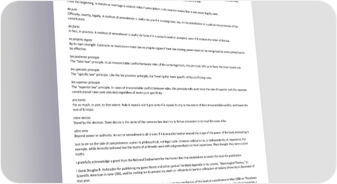 Paradox of Self-Amendment by Peter Suber I follow the practice of American philosophers and Britons generally in using exact quotation. Except in bibliographic citations, commas and periods are included inside quotation marks only when they are part of the quoted source. I would like to use sex-neutral language. But I find "she or he" and "his/her" to be barbaric constructions, and I cannot always arrange to use plurals and hide behind "they" and "them". My solution is to use "she" and "her" as generic pronouns; this is not sex-neutral, but it is compensatory. If we do this for a few centuries, then we can switch back. Or perhaps by then English will have acquired an elegant set of neutral personal pronouns. I have tried to use legal Latin as little as possible. But when a Latin phrase, once learned, frees one from long, awkward, or imprecise paraphrase, then I use it. Phrases used just once are defined in context. Here is a quick glossary of those used more often: ab initio From the beginning. A statute or marriage is void ab initio if some defect in its creation means that it was never legally valid. de jure Officially, overtly, legally. A method of amendment is lawful de jure if it is recognized, say, in the constitution or a judicial interpretation of the constitution. de facto In fact, in practice. A method of amendment is lawful de facto if it is actually used or accepted, even if it violates the letter of the law. ex proprio vigore By its own strength. Contracts or revolutions make law ex proprio vigore if their law-making power need not be recognized by some (other) law to be effective. lex posterior principle The "later law" principle. In an irreconcilable conflict between rules of the same legal rank, this principle tells us to favor the most recent rule. lex specialis principle The "specific law" principle. Like the lex posterior principle, but favoring the more specific of the conflicting rules. lex superior principle The "superior law" principle. In cases of irreconcilable conflict between rules, this principle tells us to favor the rule of superior rank (for example, constitutional rules over statutes) regardless of recency or specificity. pro tanto For so much, in part, to that extent. Rule A repeals rule B pro tanto if A repeals B only to the extent of their irreconcilable conflict, and leaves the rest of B intact. stare decisis Stand by the decision. Stare decisis is the name of the common law doctrine to follow precedent or to treat like cases alike. ultra vires Beyond power or authority. An act or amendment is ultra vires if it is unauthorized or beyond the scope of the power of the body attempting it. Just to err on the side of completeness: a priori is philosophical, not legal, Latin. It means valid prior to, or independently of, experience. For example, while Aristotle believed that the truths of arithmetic were refined generalizations from experience, Plato thought they were a priori truths. I gratefully acknowledge a grant from the National Endowment for the Humanities that enabled me to revise this book for publication. I thank Douglas R. Hofstadter for publishing my game Nomic and other parts of the third Appendix in his column, "Metamagical Themas," in Scientific American in June 1982, and for inviting me to present my work on reflexivity in law in a colloquium at Indiana University in December of that year. I thank Jean-Pierre Dupuy and Gunther Teubner for inviting me to present the conclusions of this book at a conference in May 1988 on "Paradoxes of Self-Reference in the Humanities, Law, and the Social Sciences" sponsored by the Program of Interdisciplinary Research at Stanford University. I thank the sponsors for permission to use portions of my talk in this Preface and in the Conclusion (Section 21.A). The entire talk is forthcoming in the proceedings of the conference. [It has since appeared and is now available in a web version.] I thank Anthony Davenport and Bill Polansky for research assistance, and Andrew Roazen and Nathan Treadway for help with laser printing. I have profited from the comments made on all or part of this manuscript by Robert Bennett, Anthony D'Amato, Howard DeLong, Michael Dorward, Douglas R. Hofstadter, Michael Retter, Harvey Schweitzer, Gunther Teubner, A.L.P. Thorpe, and Subbarao Visweswaraiah. vii
