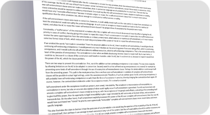 Paradox of Self-Amendment by Peter Suber Could such a clause empower an AC to repeal a complete self-entrenchment clause? By its words and evident intent, certainly. But those words squarely contradict the words of a complete self-entrenchment clause, which might say, "nothing in this section may be amended by any means whatsoever". (They also contradict themselves, for which see below.) The fact that the AC may be worded to make it an irresistible force does not at all prevent us from wording a subsequent complete self-entrenchment clause to make it an immovable object. If the amended AC does not suffice by its words to negate the words of the self-entrenchment clause, because it does not conceptually outflank the entrenchment clause, pierce a loophole in it, or supersede it as the more specific, then it may still control by the lex posterior principle if it is the later in time (see Section 16). If the self-entrenchment clause is original or self-imposed, but older than the AC, then it will lose by the rule of change that allows amendments to amend and by the rule of priority that favors recent law. If a self-entrenchment clause is self-imposed after the AC is amended to include the new provision, then the entrenchment is the most recent voice of the sovereign. But the AC still says of itself that its power cannot be limited even by future amendment, except those made in convention. If the new self-entrenchment clause were not made in convention, then its protective language would probably fail in a court test. The rule that the clause entrenches would be exposed to ordinary amendment. One could say that the self-entrenchment clause, despite its lawfulness or validity, would have only "revocable effectiveness" because it remains subject to repeal. For a self-entrenchment clause that is a much more serious qualification than for other provisions law, almost enough to constitute its ineffectiveness or nullity. If the self-entrenchment clause were made in convention, however, it could validly shield itself and the rules within its scope from amendment. At least the amended AC could not nullify the protective language. In such a case an acceptance theorist would turn back to the first method of repeal, and allow the AC to repeal the newer self-entrenchment clause if the proper show of acceptance by the people were made. Conceivably, a "reaffirmation" of the amended AC sometime after the complete self-entrenchment clause would have the effect of giving the AC priority in cases of conflict, thereby giving it the power to repeal the clause. If such a course were to be lawful, it seems that the reaffirmation must receive the same supermajorities from the same bodies as ordinary amendment, which reduces to repetitious self-amendment, or it must receive some less formal show of faith, which reduces to overriding acceptance of the power of the AC to repeal the self-entrenched rule. If we omitted the words "not made in convention" from the proposed addition to the AC, then it would be self-contradictory. It would give the AC continuing self-embracing omnipotence. It would prevent any new limitation on the amending power from ever taking effect, which is continuing omnipotence, and it would authorize all self-amendments without exception, which is self-embracing omnipotence. This is the contradiction at the heart of the paradox of omnipotence. The contradiction is clear when we think about using the new clause to repeal itself. By its own terms, it could do so, because it is a clause of the constitution and therefore mutable under the AC, but it could not do so, because to repeal it would limit the power of the AC, which the clause prohibits. There are two ways to prevent this contradiction. First, word the addition so that continuing omnipotence is not created. This was done originally by allowing limitations on the AC to be adopted in convention. Second, word it so that self-embracing omnipotence is not created, for example by preventing some kinds of self-amendment through the use of a complete self-entrenchment clause. Perhaps the whole addition could except itself from the amending power. This path is the most precarious, for as we have seen self-amendment in violation of complete self-entrenchment clauses will be possible in actual legal settings, under the acceptance model. Therefore, if such an addition gives the AC continuing omnipotence, it will probably have self-embracing omnipotence as well, from the force of acceptance in practice, thereby bringing the contradiction back again. Of course, however, the contradiction is tolerable under the acceptance model, if it is actually accepted. Self-amendment under the acceptance model can prevent, even annul, immutability. The annulment or transmutation of immutability is a contradiction in terms, but also an accurate description of what could legally occur if self-amendment is permitted. If an AC can transmute and amend a complete self-entrenchment clause simply by doing so, with the acceptance of the people and officials, and without first amending itself to give itself the power, then its superiority to legal immutability is plain. Legal immutability still exists only at the level of law, and acceptance transcends law. On the other hand, if self-amendment explicitly increased the power of the AC over complete self-entrenchment, then the new AC would have purchased two "tickets" to priority over a previously "immutable" complete self-entrenchment clause: more recent status and more specific language. This also illustrates the claim in Section 3 that the postulate of any immutable rules would beg the question of the mutability of the AC. If the AC can amend itself, then perhaps it can arrange to reach and amend any rule of the system. But the self-applicability of an AC is neither necessary nor sufficient to achieve transmutation of immutable rules. If an AC can simply amend a complete self-entrenchment clause with the direct authorization of a