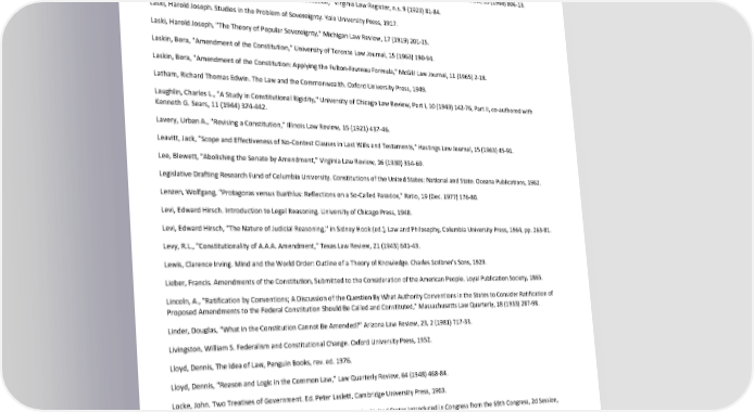 Paradox of Self-Amendment by Peter Suber Kyvig, David E., "Amending the U.S. Constitution: Ratification Controversies, 1917-1971," Ohio History, 83 (Summer 1974) 156-69. Kyvig, David E. Repealing National Prohibition. University of Chicago Press, 1980. Laertius, Diogenes. Lives of the Eminent Philosophers. Trans. R.D. Hicks, Loeb Classical Library, G.P. Putnam's Sons, 1925. Landau, Jack, "Logic for Lawyers," Pacific Law Journal, 13 (1981) 59-98. Langbein, John H., "Modern Jurisprudence and the House of Lords: The Passing of London Tramways," Cornell Law Review, 53 (1968) 806-13. Lanier, Alexander Sidney, "Amending the Federal Constitution," Virginia Law Register, n.s. 9 (1923) 81-84. Laski, Harold Joseph. Studies in the Problem of Sovereignty. Yale University Press, 1917. Laski, Harold Joseph, "The Theory of Popular Sovereignty," Michigan Law Review, 17 (1919) 201-15. Laskin, Bora, "Amendment of the Constitution," University of Toronto Law Journal, 15 (1963) 190-94. Laskin, Bora, "Amendment of the Constitution: Applying the Fulton-Favreau Formula," McGill Law Journal, 11 (1965) 2-18. Latham, Richard Thomas Edwin. The Law and the Commonwealth. Oxford University Press, 1949. Laughlin, Charles L., "A Study in Constitutional Rigidity," University of Chicago Law Review, Part I, 10 (1943) 142-76, Part II, co-authored with Kenneth G. Sears, 11 (1944) 374-442. Lavery, Urban A., "Revising a Constitution," Illinois Law Review, 15 (1921) 437-46. Leavitt, Jack, "Scope and Effectiveness of No-Contest Clauses in Last Wills and Testaments," Hastings Law Journal, 15 (1963) 45-91. Lee, Blewett, "Abolishing the Senate by Amendment," Virginia Law Review, 16 (1930) 354-69. Legislative Drafting Research Fund of Columbia University. Constitutions of the United States: National and State. Oceana Publications, 1962. Lenzen, Wolfgang, "Protagoras versus Euathlus: Reflections on a So-Called Paradox," Ratio, 19 (Dec. 1977) 176-80. Levi, Edward Hirsch. Introduction to Legal Reasoning. University of Chicago Press, 1948. Levi, Edward Hirsch, "The Nature of Judicial Reasoning," in Sidney Hook (ed.), Law and Philosophy, Columbia University Press, 1964, pp. 263-81. Levy, R.L., "Constitutionality of A.A.A. Amendment," Texas Law Review, 21 (1943) 641-43. Lewis, Clarence Irving. Mind and the World Order: Outline of a Theory of Knowledge. Charles Scribner's Sons, 1929. Lieber, Francis. Amendments of the Constitution, Submitted to the Consideration of the American People. Loyal Publication Society, 1865. Lincoln, A., "Ratification by Conventions; A Discussion of the Question By What Authority Conventions in the States to Consider Ratification of Proposed Amendments to the Federal Constitution Should Be Called and Constituted," Massachusetts Law Quarterly, 18 (1933) 287-98. Linder, Douglas, "What in the Constitution Cannot Be Amended?" Arizona Law Review, 23, 2 (1981) 717-33. Livingston, William S. Federalism and Constitutional Change. Oxford University Press, 1952. Lloyd, Dennis, The Idea of Law, Penguin Books, rev. ed. 1976. Lloyd, Dennis, "Reason and Logic in the Common Law," Law Quarterly Review, 64 (1948) 468-84. Locke, John. Two Treatises of Government. Ed. Peter Laslett, Cambridge University Press, 1963. Loeffler, Carl A. Proposed Amendments to the Constitution of the United States Introduced in Congress from the 69th Congress, 2d Session, through the 79th Congress. Government Printing Office, 1947. Loevinger, Lee, "Introduction to Legal Logic," Indiana Law Journal, 27 (1952) 471-522. Long, Breckinridge. Genesis of the Constitution of the United States of America. Macmillan, 1926. Long, Joseph R., "Tinkering With The Constitution," Yale Law Journal, 24 (1915) 573-89. Luhmann, Niklas, "The Self-Reproduction of the Law and its Limits," in D. Trubek (ed.), Conference on Reflexive Law and the Regulatory Crisis, University of Wisconsin, 1983. 206