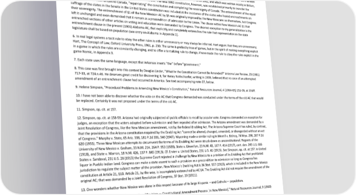 Paradox of Self-Amendment by Peter Suber 3. In these terms, Ross objected to statutes that were self-referential per se, but eventually narrowed his criticism to those that were immediately self-referential. Hart countered by showing that mediate and eccentric self-reference can be meaningful by avoiding the "asymptotic stutter" or incompleteable series of references comprising the subject of the sentence. 4. This choice may be defended by noting that a reference that referred directly and solely to itself is immediately self-referential, even though it may be said to refer to the class of which it is the only member. 5. In support I can cite the entrenched sections in the Australian and South African constitutions, discussed in Section 8, both of which were written by the British parliament. The British North America Act, which served as Canada's constitution until 1982, and which was written mostly in Britain, had no amending power that Canadians themselves could use. The new 1982 constitution, however, was established primarily to transfer the amending power from Britain to Canada, "repatriating" the constitution and completing the sovereignty of Canada. The entrenchment of the equal suffrage of the states in the Senate in the United States constitution was included at the insistence of the states who feared encroachments on their sovereignty. The entrenchment of §1 of the New Mexican AC by §5 was originally imposed by the New Mexicans on themselves, but Congress left it unchanged and even demanded that it remain as a precondition of admission to the Union. The clause within New Mexico's AC §1 that entrenched sections of other articles on voting and education were demanded by Congress. The clearest exception to my generalization is the entrenchment clause in the present (1901) Alabama AC, that explicitly and completely entrenches the rule that representation in the state legislature shall be based on population (see entry on Alabama in Appendix 2). 6. In real legal systems a tacit rule to obey the other rules is either unnecessary or may always be inferred. Hart argues that they are unnecessary; Hart, The Concept of Law, Oxford University Press, 1961, p. 230. The same is probably true of games, but in the spirit of making everything explicit in a game in which the rules are constantly changing, and to offer a tantalizing rule to change, I have made the rule to obey the rules explicit in the game Nomic, in Appendix 3. 7. Each state uses the same language, except that Arkansas inserts "the" before "government." 8. This case was first brought into this context by Douglas Linder, "What In the Constitution Cannot Be Amended?" Arizona Law Review, 23 (1981) 717-33, at 724.n.46. He deserves great credit for discovering it, for Henry Rottschaefer, writing in 1939, believed that no case of an attempted amendment of an entrenchment clause had occurred in America. See text accompanying note 27, below. 9. Helene Simpson, "Procedural Problems in Amending New Mexico's Constitution," Natural Resources Journal, 4 (1964-65) 151-59, at 156ff. 10. I have not been able to discover whether the vote on the AC that Congress demanded was conducted under the terms of the old AC that would be replaced. Certainly it was not proposed under the terms of the old AC. 11. Simpson, op. cit. at 157. 12. Simpson, op. cit. at 158-59. Arizona had originally subjected all public officials to recall by popular vote. Congress demanded an exception for judges, an exception that the voters adopted before submission and then repealed after admission. The Arizona amendment was demanded by a Joint Resolution of Congress, like the New Mexican amendment, not by the federal Enabling Act. The Arizona Supreme Court has ruled, by contrast, that the provisions in the Arizona constitution required by the Enabling Act "cannot be altered, changed, amended, or disregarded without an act of Congress." Murphy v. State, 65 Ariz. 338, 181 P.2d 336, 340 (1947). Wyoming made a similar ruling in Merrill v. Bishop, 74 Wyo. 298, 287 P.2d 620 (1955). Three New Mexican attempts to circumvent the terms of its Enabling Act were struck down as unconstitutional. Regents of the University of New Mexico v. Graham, 33 N.M. 214, 264 P. 953 (1928), State v. Llewellyn, 23 N.M. 43, 167 P. 414 (1917), cert. den. 245 U.S. 666 (1918), and State v. Marron, 18 N.M. 426, 137 P. 845 (1913). Cf. Ervien v. United States, 251 U.S. 41 (1919). See Simpson, op. cit. at 157. In United States v. Sandoval, 231 U.S. 28 (1913) the Supreme Court rejected a challenge by New Mexico to a provision of its Enabling Act that prohibited liquor in Pueblo Indian land. Congress can make a state assent to such a provision as a precondition to admission so long as Congress has jurisdiction to regulate the subject matter of the provision. New Mexico's Enabling Act is 36 Stat. 557 (1910), which is included in the New Mexico constitution at Article 21, §10. Article 21, by the way, is incompletely entrenched by AC §4. The Enabling Act did not require the amendment of the original AC; that was demanded by a Joint Resolution of Congress, 37 Stat. 39 (1911). 13. One wonders whether New Mexico was alone in this respect because of its large Hispanic —and Catholic— population. 14. See Arthur O'Neal Beach, "Constitutional Revision — Constitutional Amendment Process [in New Mexico]," Natural Resources Journal, 9 (1969) 422-29 at 425f. 15. Linder, op. cit. at 729. 16. Linder gets out of this problem, partially, by denying entrenchment clauses any effect at all, apparently because democratic values take precedence over the intent of the makers: "no principled decision could depend upon whether the amendment [to be repealed] did or did not include a clause expressly declaring the amendment not to be subject to repeal." Linder, op. cit. at 730. Therefore, Linder's single amendment need not and would not repeal both the entrenchment clause and the protected rule. Because the former is a nullity, on