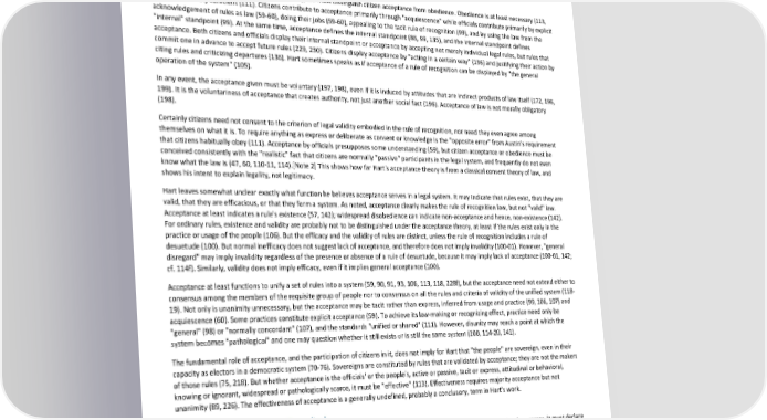 Paradox of Self-Amendment by Peter Suber consider it a meter (106). The rule of recognition, then, is law only by acceptance, it seems, and not also by self-application. Acceptance itself, however, is not law but only the authority for law. Whether acceptance is the proper or "authoritative" authority for law only because it is accepted, in self-application, that is, whether we should take a reflexive or irreflexive view of acceptance itself will be discussed below (Section 7.B). Sometimes Hart suggests that acceptance in the sense intended is performed only by the officials of the system (106, 107, 108, 111, 113, 114, 118), sometimes by ordinary citizens (114, 121, 142), and sometimes he insists that citizens and officials are both needed (59, 98). Once he says that the practice of a "social group" suffices (106). To the extent that citizen participation is necessary, we must distinguish citizen acceptance from obedience. Obedience is at least necessary (113, 197), and possibly sufficient (111). Citizens contribute to acceptance primarily through "acquiescence" while officials contribute primarily by explicit acknowledgement of rules as law (59-60), doing their jobs (59-60), appealing to the tacit rule of recognition (99), and by using the law from the "internal" standpoint (99). At the same time, acceptance defines the internal standpoint (86, 99, 135), and the internal standpoint defines acceptance. Both citizens and officials display their internal standpoint or acceptance by accepting not merely individual legal rules, but rules that commit one in advance to accept future rules (229, 230). Citizens display acceptance by "acting in a certain way" (136) and justifying their action by citing rules and criticizing departures (136). Hart sometimes speaks as if acceptance of a rule of recognition can be displayed by "the general operation of the system" (105). In any event, the acceptance given must be voluntary (197, 198), even if it is induced by attitudes that are indirect products of law itself (172, 196, 199). It is the voluntariness of acceptance that creates authority, not just another social fact (196). Acceptance of law is not morally obligatory (198). Certainly citizens need not consent to the criterion of legal validity embodied in the rule of recognition, nor need they even agree among themselves on what it is. To require anything as express or deliberate as consent or knowledge is the "opposite error" from Austin's requirement that citizens habitually obey (111). Acceptance by officials presupposes some understanding (59), but citizen acceptance or obedience must be conceived consistently with the "realistic" fact that citizens are normally "passive" participants in the legal system, and frequently do not even know what the law is (47, 60, 110-11, 114).[Note 2] This shows how far Hart's acceptance theory is from a classical consent theory of law, and shows his intent to explain legality, not legitimacy. Hart leaves somewhat unclear exactly what function he believes acceptance serves in a legal system. It may indicate that rules exist, that they are valid, that they are efficacious, or that they form a system. As noted, acceptance clearly makes the rule of recognition law, but not "valid" law. Acceptance at least indicates a rule's existence (57, 142); widespread disobedience can indicate non-acceptance and hence, non-existence (142). For ordinary rules, existence and validity are probably not to be distinguished under the acceptance theory, at least if the rules exist only in the practice or usage of the people (106). But the efficacy and the validity of rules are distinct, unless the rule of recognition includes a rule of desuetude (100). But normal inefficacy does not suggest lack of acceptance, and therefore does not imply invalidity (100-01). However, "general disregard" may imply invalidity regardless of the presence or absence of a rule of desuetude, because it may imply lack of acceptance (100-01, 142; cf. 114f). Similarly, validity does not imply efficacy, even if it implies general acceptance (100). Acceptance at least functions to unify a set of rules into a system (59, 90, 91, 93, 106, 113, 118, 228f), but the acceptance need not extend either to consensus among the members of the requisite group of people nor to consensus on all the rules and criteria of validity of the unified system (118- 19). Not only is unanimity unnecessary, but the acceptance may be tacit rather than express, inferred from usage and practice (99, 106, 107) and acquiescence (60). Some practices constitute explicit acceptance (59). To achieve its law-making or recognizing effect, practice need only be "general" (98) or "normally concordant" (107), and the standards "unified or shared" (111). However, disunity may reach a point at which the system becomes "pathological" and one may question whether it still exists or is still the same system (100, 114-20, 141). The fundamental role of acceptance, and the participation of citizens in it, does not imply for Hart that "the people" are sovereign, even in their capacity as electors in a democratic system (70-76). Sovereigns are constituted by rules that are validated by acceptance; they are not the makers of those rules (75, 218). But whether acceptance is the officials' or the people's, active or passive, tacit or express, attitudinal or behavioral, knowing or ignorant, widespread or pathologically scarce, it must be "effective" (113). Effectiveness requires majority acceptance but not unanimity (89, 226). The effectiveness of acceptance is a generally undefined, probably a conclusory, term in Hart's work. B. Hartian acceptance self-applied One of the weaknesses of the inference model is that it cannot deal with the circularity and inconsistency of some legal processes. It must declare them invalid even when accepted by the people and the courts. The acceptance theory can cope with the self-contradiction and circularity of self- amendment, but it e