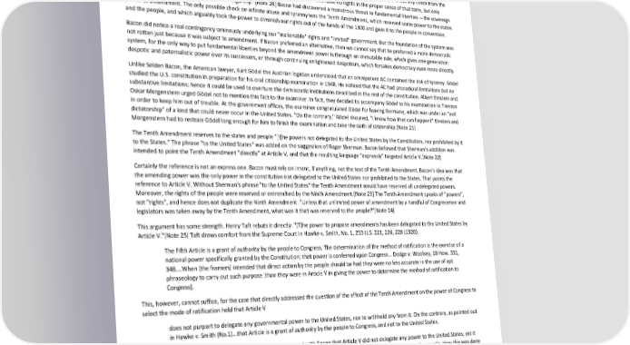 Paradox of Self-Amendment by Peter Suber [T]he function of a State legislature in ratifying a proposed amendment to the Federal Constitution, like the function of Congress in proposing the amendment, is a federal function derived from the Federal Constitution; and it transcends any limitations sought to be imposed by the people of a State. So, the people of the states cannot control the amendment process. Bacon wondered whether ours was still a government of the people. He calculated that the number of federal and state legislators needed (in 1930) to propose and adopt an amendment to the federal constitution was 1300.[Note 19] To Bacon, Leser in effect put all the rights of the people in the hands of 1300 officials beyond the control of the people of the states. Our boasted limited government and inalienable rights were shams so long as 1300 tyrants could amend them away without any check from the people. If the elite 1300 truly hold the reigns of an omnipotent AC, then "we citizens have no rights in the proper sense of that term, but only privileges extended at the pleasure of this oligarchy."[Note 20] Bacon had discovered a monstrous threat to fundamental liberties —the sovereign power of amendment. The only possible check on infinite abuse and tyranny was the Tenth Amendment, which reserved some power to the states and the people, and which arguably took the power to diminish our rights out of the hands of the 1300 and gave it to the people in convention. Bacon did notice a real contingency ominously underlying our "inalienable" rights and "limited" government. But the foundation of the system was not rotten just because it was subject to amendment. If Bacon preferred an alternative, then we cannot say that he preferred a more democratic system, for the only way to put fundamental liberties beyond the amendment power is through an immutable rule, which gives one generation despotic and paternalistic power over its successors, or through continuing enlightened despotism, which forsakes democracy even more directly. Unlike Selden Bacon, the American lawyer, Kurt Gödel the Austrian logician understood that an omnipotent AC contained the risk of tyranny. Gödel studied the U.S. constitution in preparation for his oral citizenship examination in 1948. He noticed that the AC had procedural limitations but no substantive limitations; hence it could be used to overturn the democratic institutions described in the rest of the constitution. Albert Einstein and Oskar Morgenstern urged Gödel not to mention this fact to the examiner. In fact, they decided to accompany Gödel to his examination in Trenton in order to keep him out of trouble. At the government offices, the examiner congratulated Gödel for leaving Germany, which was under an "evil dictatorship" of a kind that could never occur in the United States. "On the contrary," Gödel shouted, "I know how that can happen!" Einstein and Morgenstern had to restrain Gödel long enough for him to finish the examination and take the oath of citizenship.[Note 21] The Tenth Amendment reserves to the states and people "[t]he powers not delegated to the United States by the Constitution, nor prohibited by it to the States." The phrase "to the United States" was added on the suggestion of Roger Sherman. Bacon believed that Sherman's addition was intended to point the Tenth Amendment "directly" at Article V, and that the resulting language "expressly" targeted Article V.[Note 22] Certainly the reference is not an express one. Bacon must rely on intent, if anything, not the text of the Tenth Amendment. Bacon's idea was that the amending power was the only power in the constitution not delegated to the United States nor prohibited to the States. That points the reference to Article V. Without Sherman's phrase "to the United States" the Tenth Amendment would have reserved all undelegated powers. Moreover, the rights of the people were reserved or entrenched by the Ninth Amendment.[Note 23] The Tenth Amendment speaks of "powers", not "rights", and hence does not duplicate the Ninth Amendment. "Unless that unlimited power of amendment by a handful of Congressmen and legislators was taken away by the Tenth Amendment, what was it that was reserved to the people?"[Note 24] This argument has some strength. Henry Taft rebuts it directly. "[T]he power to propose amendments has been delegated to the United States by Article V."[Note 25] Taft draws comfort from the Supreme Court in Hawke v. Smith, No. 1, 253 U.S. 221, 226, 228 (1920): The Fifth Article is a grant of authority by the people to Congress. The determination of the method of ratification is the exercise of a national power specifically granted by the Constitution; that power is conferred upon Congress... Dodge v. Woolsey, 18 How. 331, 348....When [the framers] intended that direct action by the people should be had they were no less accurate in the use of apt phraseology to carry out such purpose [than they were in Article V in giving the power to determine the method of ratification to Congress]. This, however, cannot suffice, for the case that directly addressed the question of the effect of the Tenth Amendment on the power of Congress to select the mode of ratification held that Article V does not purport to delegate any governmental power to the United States, nor to withhold any from it. On the contrary, as pointed out in Hawke v. Smith (No.1)...that Article is a grant of authority by the people to Congress, and not to the United States. U.S. v. Sprague, 282 U.S. 716, 733 (1931). Sprague, then, agreed with Bacon that Article V did not delegate any power to the United States, yet it denied that the Tenth Amendment therefore reserved the power to deprive the people of their rights or powers to the people. How this was done was something of a cheat on Bacon and the others who relied on the historical analysis of Roger Sherman's intention. The Sprague court, in an opinion by Justice Roberts, did not