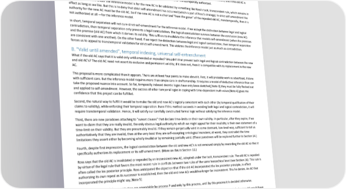 Paradox of Self-Amendment by Peter Suber is repealed, then it possesses what J.M. Finnis called "transtemporal validation". Ross rejects the possibility of transtemporal validation for reasons central to the inference model: it does not work in valid deductive inference, so it cannot work in valid legal change. When in a given inference, a conclusion relies on a certain premise, then if the premise is denied, the conclusion is no longer proved. The conclusion may be inferred anew from other premises, of course, but in any given inference the premises that authorize the conclusion must be affirmed, not denied. So in law, if a rule is repealed, everything it authorized (that is not authorized by something else) must cease to be authorized. So if an act of amendment requires transtemporal validation, then it violates the inference model. But temporal separation in the case of strict self- amendment requires transtemporal validation. If the new AC is authorized by the old AC so that strict self-amendment occurs, and if the old AC is invalidated just as the new AC is validated, then the new AC is either unauthorized or transtemporally authorized. The only alternative under the inference model is for the new AC to be validated by something like Ross's tacit, transcendent rule, which remains in effect as long as we like. But this is to deny that strict self-amendment has occurred (which is part of Ross's strategy). In strict self-amendment the authority for the new AC must be the old AC. So if the new AC is not authorized "from the grave" of the repealed old AC, transtemporally, then it is not authorized at all —for the inference model. In short, temporal separation will not cure strict self-amendment for the inference model. If we accept the distinction between legal and logical contradiction, then temporal separation only prevents a legal contradiction. The logical contradiction survives between the conclusion (new AC) and the premise (old AC) from which it derives its validity. This suffices to invalidate the inference that models self-amendment (when the premises are consistent with one another). On the other hand, if we reject the distinction between legal and logical contradiction, then temporal separation forces us to appeal to transtemporal validation for strict self-amendment. This violates the inference model just as much as contradiction. B. "Valid until amended", temporal indexing, universal self-entrenchment What if the old AC says that it is valid only until amended or repealed? Wouldn't that prevent both legal and logical contradiction between the new and old AC's? The old AC need not assert its exclusive and permanent validity; if it does not, then it is compatible with its replacement in the new AC. This proposal is more complicated than it appears. There are at least four points to make about it. First, it will probably work as advertised, if done with sufficient care. But the inference model requires more than simple care in draftsmanship. It requires a model of deductive inference than can take the proposed nuance into account. So far, temporally indexed deontic logics have only been sketched;[Note 3] they must be fully fleshed out and applied to self-amendment. However, the success of other temporal logics in coping with time-dependent truth values[Note 4] gives me confidence that this project can be fulfilled. Second, the natural way to fulfill it would be to make the old and new AC's logically consistent with each other (by temporal qualification of their claims to validity), while enforcing their temporal separation. Even if this method succeeds in avoiding both legal and logical contradiction, it will require transtemporal validation. Hence, it will satisfy our carefully constructed formal logic without satisfying the inference model. Third, there are new paradoxes attaching to "sunset clauses" that declare time-limits on their own validity. In particular, after they expire, if we want to claim that they are really invalid, the only obvious legal authority to which we might appeal for their invalidity is their own statement of a time-limit on their validity. But they are presumably invalid. If they remain perpetually valid in some dormant, low-level way, sufficient to tell us authoritatively that they are invalid, then at the very least they are self-excepting ontological monsters; at worst, they contradict the time limitations they assert either by becoming wholly invalid or by remaining partially valid. (These paradoxes will be explored further in Section 14.) Fourth, despite first impressions, the logical contradiction between the old and new AC's is not removed simply by rewording the old AC so that it specifically authorizes its replacement or its self-amendment. (More on this in Section 11.) Ross says that the old AC is invalidated or repealed by an inconsistent new AC, adopted under the tacit, transcendent rule. The old AC is repealed by virtue of the legal rule that favors the most recent rule in conflicts between two rules of the same hierarchical level (see Section 16). This rule is often called the lex posterior principle. Ross anticipated the objection that if the old AC incorporated the lex posterior principle, in effect authorizing its own repeal as its successor is established, then the old and new ACs would no longer be inconsistent. This he denies. An AC that incorporated the principle might say,[Note 5] The rules of the constitution are amendable by process P and only by this process, until by this process it is decided otherwise. If such an AC amended itself by changing P for Q, when P and Q were inconsistent in content, then the inference by which the new AC would have come into being would still contradict one premise, the old AC, which would still create an insurmountable invalidity in the inference. Would the incorporation of the lex posterior principle still fail to dissolve the paradox if the old AC said it was to expire at time T (a dimension