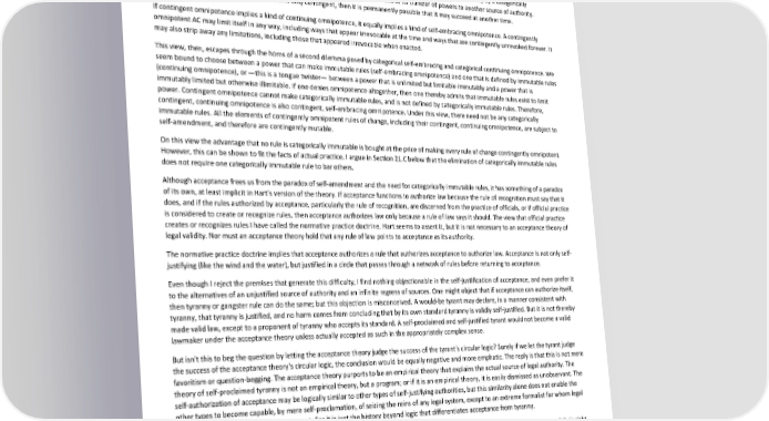 Paradox of Self-Amendment by Peter Suber This view has the merit of allowing continuing omnipotence without any immutable rule to guarantee its continuity. Until now it seemed that the paradox of self-amendment put us in a harsh dilemma in which we had to choose between paradox and immutability. The direct acceptance theory eliminates immutability and softens paradox to a literally acceptable form. The effect is not only theoretically elegant; by eliminating the need for immutable rules, the direct acceptance theory eliminates an ancient ground for bad faith in recognizing our responsibility for law. No law inherited from our ancestors or "arising from the nature of things" is immutable; if unjust laws persist, we are responsible for them. The omnipotence of the AC may be abridged by self-imposed limitations, and these limitations may contingently last forever. But because they are always revocable, the AC has a kind of continuing omnipotence.[Note 17] Even acceptance is not guaranteed continuity by a categorically immutable rule, for it may contingently fail to overcome its self-imposed limitations or its transfer of powers to another source of authority. However, if its failure to shed its limitations is only contingent, then it is permanently possible that it may succeed at another time. If contingent omnipotence implies a kind of continuing omnipotence, it equally implies a kind of self-embracing omnipotence. A contingently omnipotent AC may limit itself in any way, including ways that appear irrevocable at the time and ways that are contingently unrevoked forever. It may also strip away any limitations, including those that appeared irrevocable when enacted. This view, then, escapes through the horns of a second dilemma posed by categorical self-embracing and categorical continuing omnipotence. We seem bound to choose between a power that can make immutable rules (self-embracing omnipotence) and one that is defined by immutable rules (continuing omnipotence), or —this is a tongue twister— between a power that is unlimited but limitable immutably and a power that is immutably limited but otherwise illimitable. If one denies omnipotence altogether, then one thereby admits that immutable rules exist to limit power. Contingent omnipotence cannot make categorically immutable rules, and is not defined by categorically immutable rules. Therefore, contingent, continuing omnipotence is also contingent, self-embracing omnipotence. Under this view, there need not be any categorically immutable rules. All the elements of contingently omnipotent rules of change, including their contingent, continuing omnipotence, are subject to self-amendment, and therefore are contingently mutable. On this view the advantage that no rule is categorically immutable is bought at the price of making every rule of change contingently omnipotent. However, this can be shown to fit the facts of actual practice. I argue in Section 21.C below that the elimination of categorically immutable rules does not require one categorically immutable rule to bar others. Although acceptance frees us from the paradox of self-amendment and the need for categorically immutable rules, it has something of a paradox of its own, at least implicit in Hart's version of the theory. If acceptance functions to authorize law because the rule of recognition must say that it does, and if the rules authorized by acceptance, particularly the rule of recognition, are discerned from the practice of officials, or if official practice is considered to create or recognize rules, then acceptance authorizes law only because a rule of law says it should. The view that official practice creates or recognizes rules I have called the normative practice doctrine. Hart seems to assert it, but it is not necessary to an acceptance theory of legal validity. Nor must an acceptance theory hold that any rule of law points to acceptance as its authority. The normative practice doctrine implies that acceptance authorizes a rule that authorizes acceptance to authorize law. Acceptance is not only self- justifying (like the wind and the water), but justified in a circle that passes through a network of rules before returning to acceptance. Even though I reject the premises that generate this difficulty, I find nothing objectionable in the self-justification of acceptance, and even prefer it to the alternatives of an unjustified source of authority and an infinite regress of sources. One might object that if acceptance can authorize itself, then tyranny or gangster rule can do the same; but this objection is misconceived. A would-be tyrant may declare, in a manner consistent with tyranny, that tyranny is justified, and no harm comes from concluding that by its own standard tyranny is validly self-justified. But it is not thereby made valid law, except to a proponent of tyranny who accepts its standard. A self-proclaimed and self-justified tyrant would not become a valid lawmaker under the acceptance theory unless actually accepted as such in the appropriately complex sense. But isn't this to beg the question by letting the acceptance theory judge the success of the tyrant's circular logic? Surely if we let the tyrant judge the success of the acceptance theory's circular logic, the conclusion would be equally negative and more emphatic. The reply is that this is not mere favoritism or question-begging. The acceptance theory purports to be an empirical theory that explains the actual source of legal authority. The theory of self-proclaimed tyranny is not an empirical theory, but a program; or if it is an empirical theory, it is easily dismissed as unobservant. The self-authorization of acceptance may be logically similar to other types of self-justifying authorities, but this similarity alone does not enable the other types to become capable, by mere self-proclamation, of seizing the reins of any legal system, except to an extreme formalist for whom legal and logical cri