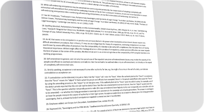 Paradox of Self-Amendment by Peter Suber 11. See the many cases collected in Corpus Juris Secundum, "Statutes", Section 279.n.80. 12. Ibid., Section 279.n.81. 13. This was a favorite observation of William Earle, professor of philosophy at Northwestern University. 14. However, for cases of self-amendment invalidated on other grounds, see the comments on self-amendment in Arkansas and Nevada in Appendix 2. 15. Therefore, anyone who objects to self-limiting self-amendment must also object to self-imposed limitations, at least to self-imposed complete self-entrenchment clauses, even if they do not directly entrench or limit the AC. This just one way to say that adding an immutable provision to the constitution would limit the AC irrevocably just as much as a direct attempt at irrevocable self-limitation. 16. While self-embracing omnipotence may be converted into continuing omnipotence by the simple means of adopting a completely self- entrenched self-amendment that protected the continuing character of the AC from subsequent limitation, it turns out to be impossible to convert self-embracing omnipotence into a continuing self-embracing omnipotence, or one that is immutably self-embracing. See Section 11. 17. See W. Friedmann, "Trethowan's Case, Parliamentary Sovereignty and the Limits of Legal Change," Australian Law Review, 24 (1950) 103-08; Zelman Cowen, "Parliamentary Sovereignty and the Limits of Legal Change," Australian Law Review, 26 (1952) 237-40; H.W.R. Wade, "The Basis of Legal Sovereignty," Cambridge Law Journal, no vol. (1955) 172-97. 18. Geoffrey Marshall, Parliamentary Sovereignty and the Commonwealth, Oxford University Press, 1957, Chapter XI; H.L.A. Hart, "Self-Referring Laws," Festskrift Tillagnäd Karl Olivecrona, Stockholm: Kungl. Boktryckeriet, P.A. Norstedt & Söner, 1964, pp. 307-16, at pp. 311-12, and The Concept of Law, Oxford University Press, 1961, at pp. 70-72; D.V. Cowen, op. cit. note 5 above, passim; H.W.R. Wade, op. cit. note 17 above, passim. 19. An AC that seems to be omnipotent is in practice very seriously limited in its power when incomplete entrenchment clauses require very difficult amendment procedures. But in theory, if I may use an analogy from the theory of computation, continuing omnipotence is no more overthrown by severe difficulties of procedure than the computability of a function is denied by NP-completeness. But this latter fact is of merely theoretical importance. While it might affect the theological version of the paradox of omnipotence, where practical difficulties can never impede the kind of power at the center of the paradox, this theoretical point is as uninteresting in law as the computability of NP-complete functions is to working programmers. 20. Self-amendment in general, and not only the special case of the repeal of complete self-entrenchment clauses, may involve the capacity of the people and officials to overlook and tolerate contradiction. But the method to be outlined relies only on self-amendment, not directly on the repeal of completely self-entrenched rules. 21. Strictly speaking, acceptance is not necessary if some other authority for law, e.g. the might of an army or the will of a deity, can tolerate contradiction as acceptance can. 22. If contradiction can be tolerated, it is just as likely that the "object" will resist the "force". When the authority behind the "force" is acceptance, then the "force" moves the "object" if that is what the people and officials have accepted. Since it is the people and officials who apply the "force" by using the amending procedure, the "object" or old law gives way. If the authority behind the "force" were the will of a deity, for example, and if the deity's priests reported that the old rule had the deity's favor but the new amendment movement did not, then the "object" would resist the "force". This is the question whether temporally posterior rules (the new amendment) have logical priority over temporally prior rules (the old rule to be amended) —or whether the living generation is sovereign and can overrule the sovereign acts of prior generations. The answer is contingent on how the people interpret the source of authority in their legal system. Acceptance understood as acceptance always gives the living generation sovereignty, that is, at least the kind of omnipotence required to amend any law it has inherited. 23. Emphases added; see Corpus Juris Secundum, Constitutional Law, section 39.n.42. 24. Raymond Uhl, "Sovereignty and the Fifth Article," Southwestern Social Science Quarterly, 16 (1936) 1-20. 25. Uhl, ibid. at p. 15. Uhl cites Austin and Dicey at p. 19.n.40. For a good collection of Austinian statements that every legal system must have an unlimited law-maker, see Lester Bernhardt Orfield, The Amending of the Federal Constitution, University of Michigan Press, 1942, at p. 137.n.20. Orfield himself denies this proposition, ibid., p. 138. Orfield's own discussion of the sovereignty of the amending power, ibid., pp. 130ff, is more sophisticated than Uhl's, but also too loose on the question of the omnipotence of the AC and the power of the sovereign to determine the limits of its own competency; see ibid., pp. 130, 133. 26. Orfield falls into the same trap with this formulation, ibid., p. 157: Sovereignty, viewed in the broadest sense, may be regarded as the power to make a law on any subject binding for all time in all places. This capacity theoretically exists in the amending body. 55