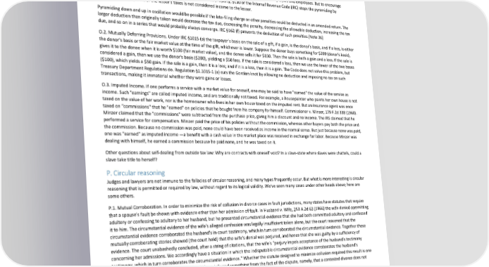 Paradox of Self-Amendment by Peter Suber O. Tax reflexivities O.1. Pyramiding Taxes. If an employer pays an employee's income tax as an extra benefit, then the amount of the tax paid is considered to be extra income to the employee. Because it is income, it is taxable. If the employer pays the tax due on that extra increment of income, and then on the next increment due on her second payment, and so on, then an infinite series is created. However, the series converges and the exact amount of tax due can be calculated, which is always more than the employee would have to pay if she paid her own taxes directly. Hence this perquisite is rarely used. Whether taxes pyramid in this way is a matter of policy. They are allowed to do so in the case of employers and employees. But to encourage leases in which the lessee pays the lessor's taxes on the leased property, §110 of the Internal Revenue Code (IRC) stops the pyramiding by stipulating that payment of the lessor's taxes is not considered income to the lessor. Pyramiding down and up in oscillation would be possible if the late-filing charge or other penalties could be deducted in an amended return. The larger deduction than originally taken would decrease the tax due, decreasing the penalty, decreasing the allowable deduction, increasing the tax due, and so on in a series that would probably always converge. IRC §162 (f) prevents the deduction of such penalties.[Note 36] O.2. Mutually Deferring Provisions. Under IRC §1015 (a) the taxpayer's basis on the sale of a gift, if a gain, is the donor's basis, and if a loss, is either the donor's basis or the fair market value at the time of the gift, whichever is lower. Suppose the donor buys something for $200 (donor's basis), gives it to the donee when it is worth $100 (fair market value), and the donee sells it for $150. Then the sale is both a gain and a loss. If the sale is considered a gain, then we use the donor's basis ($200), yielding a $50 loss. If the sale is considered a loss, then we use the lower of the two bases ($100), which yields a $50 gain. If the sale is a gain, then it is a loss; and if it is a loss, then it is a gain. The Code does not solve this problem, but Treasury Department Regulations do. Regulation §1.1015-1 (a) cuts the Gordian knot by allowing no deduction and imposing no tax on such transactions, making it immaterial whether they were gains or losses. O.3. Imputed Income. If one performs a service with a market value for oneself, one may be said to have "earned" the value of the service as income. Such "earnings" are called imputed income, and are traditionally not taxed. For example, a housepainter who paints her own house is not taxed on the value of her work, nor is the homeowner who lives in her own house taxed on the imputed rent. But an insurance agent was once taxed on "commissions" that he "earned" on policies that he bought from his company for himself. Commissioner v. Minzer, 179 F.2d 338 (1960). Minzer claimed that the "commissions" were subtracted from the purchase price, giving him a discount and no income. The IRS claimed that he performed a service for compensation. Minzer paid the price of his policies without the commission, whereas other buyers pay both the price and the commission. Because no commission was paid, none could have been received as income in the normal sense. But just because none was paid, one was "earned" as imputed income —a benefit with a cash value in the market place was received in exchange for labor. Because Minzer was dealing with himself, he earned a commission because he paid none, and he was taxed on it. Other questions about self-dealing from outside tax law: Why are contracts with oneself void? In a slave-state where slaves were chattels, could a slave take title to herself? P. Circular reasoning Judges and lawyers are not immune to the fallacies of circular reasoning, and many types frequently occur. But what is more interesting is circular reasoning that is permitted or required by law, without regard to its logical validity. We've seen many cases under other heads above; here are some others. P.1. Mutual Corroboration. In order to minimize the risk of collusion in divorce cases in fault jurisdictions, many states have statutes that require that a spouse's fault be shown with evidence other than her admission of fault. In Husband v. Wife, 253 A.2d 63 (1966) the wife denied committing adultery or confessing to adultery to her husband, but he presented circumstantial evidence that she had both committed adultery and confessed it to him. The circumstantial evidence of the wife's alleged confession was legally insufficient taken alone, but the court reasoned that the circumstantial evidence corroborated the husband's in-court testimony, which in turn corroborated the circumstantial evidence. Together these mutually corroborating stories showed (the court held) that the wife's denial was perjured, and hence that she was guilty by a sufficiency of evidence. The court unabashedly concluded, after a string of citations, that the wife's "perjury impels acceptance of the husband's testimony concerning her admissions. We accordingly have a situation in which the indisputable circumstantial evidence corroborates the husband's testimony, which in turn corroborates the circumstantial evidence." Whether the statute designed to minimize collusion required this result is one question; another is whether the court should have inferred something from the fact of the dispute, namely, that a contested divorce does not present a large risk of collusion. A generalized version of the problem above occurs whenever a mass of evidence is found sufficient when the bits comprising the mass are separately insufficient as a matter of law. The support that each bit provides for and receives from the others, by completing a coherent picture, is commonly and probably harmlessly found to be persuasive. But logically it is difficult to distinguish fr