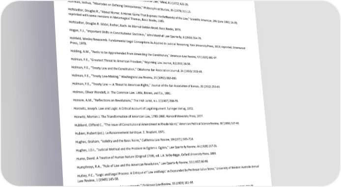 Paradox of Self-Amendment by Peter Suber Hintikka, Jaakko, "Remarks on a Paradox," Archiv für Rechts- und Sozialphilosophie, 44 (1958) 514-16. A reply to I. Tammelo, 1958, q.v. Hintikka, Jaakko, "The Ross Paradox as Evidence for the Reality of Semantical Games," Monist, 60 (1977) 370-79. Hoadly, G.W., "Was the Eighteenth Amendment Legally Adopted?" Virginia Law Register, n.s. 13 (1927) 381-83. Hoar, Roger Sherman. Constitutional Conventions, Their Nature, Powers, and Limitations. Little, Brown and Co., 1917. Hobbes, Thomas. Leviathan. Collier Books, 1962 (original 1651). Hoerster, Norbert, "On Alf Ross's Alleged Puzzle in Constitutional Law," Mind, 81 (1972) 422-26. Hoffman, Joshua, "Mavrodes on Defining Omnipotence," Philosophical Studies, 35 (1979) 311-13. Hofstadter, Douglas R., "About Nomic: A Heroic Game That Explores the Reflexivity of the Law," Scientific American, 246 (June 1982) 16-28; reprinted with some revisions in Metamagical Themas, Basic Books, 1985. Hofstadter, Douglas R. Gödel, Escher, Bach: An Eternal Golden Braid. Basic Books, 1979. Hogan, F.J., "Important Shifts in Constitutional Doctrines," John Marshall Law Quarterly, 4 (1939) 554-79. Hohfeld, Wesley Newcomb. Fundamental Legal Conceptions As Applied to Judicial Reasoning. Yale University Press, 1919; reprinted, Greenwood Press, 1978. Holding, A.M., "Perils to be Apprehended from Amending the Constitution," American Law Review, 57 (1923) 481-97. Holman, F.E., "Greatest Threat to American Freedom," Wyoming Law Journal, 8 (1953) 24-38. Holman, F.E., "Treaty Law and the Constitution," Oklahoma Bar Association Journal, 24 (1953) 1333-48. Holman, F.E., "Treaty Law-Making," Washington Law Review, 25 (1950) 382-400. Holman, F.E., "Treaty Law — A Threat to American Rights," Journal of the Bar Association of Kansas, 20 (1952) 253-63. Holmes, Oliver Wendell, Jr. The Common Law. Little, Brown, and Co., 1881. Honore, A.M., "Reflections on Revolutions," The Irish Jurist, n.s. 2 (1967) 268-78. Horovitz, Joseph. Law and Logic: A Critical Account of Legal Argument. Springer Verlag, 1972. Horwitz, Morton J. The Transformation of American Law, 1780-1860. Harvard University Press, 1977. Hubbard, Clifford C., "The Issue of Constitutional Amendment in Rhode Island," American Political Science Review, 30 (1936) 537-40. Hubien, Hubert (ed.). Le Raisonnement Juridique. E. Bruylant, 1971. Hughes, Graham, "Validity and the Basic Norm," California Law Review, 59 (1971) 695-714. Hughes, J.D.I., "Judicial Method and the Problem in Ogden v. Ogden," Law Quarterly Review, 44 (1928) 217-26. Hume, David. A Treatise of Human Nature (Original 1739), ed. L.A. Selby-Bigge, Oxford University Press, 1888. Humphreys, R.A., "Rule of Law and the American Revolution," Law Quarterly Review, 53 (1937) 80-98. Hutley, F.C., "Logic and Legal Process: A Critique of 'Law and Logic' as Expounded by Professor Julius Stone," University of Western Australia Annual Law Review, 1 (1949) 145-58. Ingham, J.F., "Unconstitutional Amendments," Dickinson Law Review, 33 (1929) 161-68. Jack, W. Harvy, "No-Contest or In Terrorem Clauses in Wills — Construction and Enforcement," Southwestern Law Journal, 19 (1965) 722-39. Jackson, S.W., "Treaty Powers Amendment Unnecessary," Journal of the Bar Association of Kansas, 22 (1953) 74-77. Jameson, John Alexander. A Treatise on Constitutional Conventions: Their History, Powers, and Modes of Proceeding. Callaghan and Co., 4th ed., enlarged, revised, and corrected, 1887. Jenner, Albert E., "Observations on the Proposed Alteration of the Constitutional Amendatory Procedure," Notre Dame Lawyer, 39 (1964) 625-27. Jennings, William Ivor. The Law and the Constitution. University of London Press, 3d. ed., 1943. 204