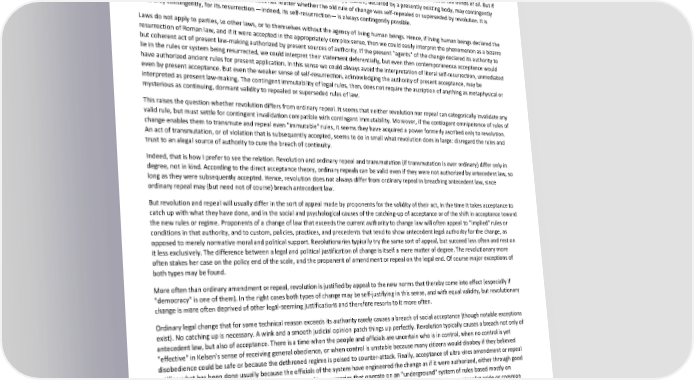 Paradox of Self-Amendment by Peter Suber The same conclusion may be seen from another perspective. Just as immutable rules are immutable only contingently, so mutable rules are mutable only contingently. Any rule may be immutable if it is contingently never repealed or if a prohibition of its repeal is contingently respected forever. This is the mirror image of the principle that any rule may be mutable if a prohibition of its repeal is contingently violated or repealed. Direct acceptance, in short, implies that all rules have contingent mutability and immutability (they are the same thing), just as it implies that all rules of change have contingent omnipotence. If every rule has contingent mutability or immutability, then repeals are effective only as long as they are accepted as valid. After a certain point, however, a repealed law is invalid by default, not only by acceptance, as its repeal and even its former existence pass out of the minds of all. But if an anciently repealed law was a rule of change, then its sudden, present self-application, declared by a presently existing body, may contingently be accepted as valid. For these purposes it does not matter whether the old rule of change was self-repealed or superseded by revolution. It is dead only contingently, for its resurrection —indeed, its self-resurrection— is always contingently possible. Laws do not apply to parties, to other laws, or to themselves without the agency of living human beings. Hence, if living human beings declared the resurrection of Roman law, and if it were accepted in the appropriately complex sense, then we could easily interpret the phenomenon as a bizarre but coherent act of present law-making authorized by present sources of authority. If the present "agents" of the change declared its authority to lie in the rules or system being resurrected, we could interpret their statement deferentially, but even then contemporaneous acceptance would have authorized ancient rules for present application. In this sense we could always avoid the interpretation of literal self-resurrection, unmediated even by present acceptance. But even the weaker sense of self-resurrection, acknowledging the authority of present acceptance, may be interpreted as present law-making. The contingent immutability of legal rules, then, does not require the ascription of anything as metaphysical or mysterious as continuing, dormant validity to repealed or superseded rules of law. This raises the question whether revolution differs from ordinary repeal. It seems that neither revolution nor repeal can categorically invalidate any valid rule, but must settle for contingent invalidation compatible with contingent immutability. Moreover, if the contingent omnipotence of rules of change enables them to transmute and repeal even "immutable" rules, it seems they have acquired a power formerly ascribed only to revolution. An act of transmutation, or of violation that is subsequently accepted, seems to do in small what revolution does in large: disregard the rules and trust to an alegal source of authority to cure the breach of continuity. Indeed, that is how I prefer to see the relation. Revolution and ordinary repeal and transmutation (if transmutation is ever ordinary) differ only in degree, not in kind. According to the direct acceptance theory, ordinary repeals can be valid even if they were not authorized by antecedent law, so long as they were subsequently accepted. Hence, revolution does not always differ from ordinary repeal in breaching antecedent law, since ordinary repeal may (but need not of course) breach antecedent law. But revolution and repeal will usually differ in the sort of appeal made by proponents for the validity of their act, in the time it takes acceptance to catch up with what they have done, and in the social and psychological causes of the catching-up of acceptance or of the shift in acceptance toward the new rules or regime. Proponents of a change of law that exceeds the current authority to change law will often appeal to "implied" rules or conditions in that authority, and to custom, policies, practices, and precedents that tend to show antecedent legal authority for the change, as opposed to merely normative moral and political support. Revolutionaries typically try the same sort of appeal, but succeed less often and rest on it less exclusively. The difference between a legal and political justification of change is itself a mere matter of degree. The revolutionary more often stakes her case on the policy end of the scale, and the proponent of amendment or repeal on the legal end. Of course major exceptions of both types may be found. More often than ordinary amendment or repeal, revolution is justified by appeal to the new norms that thereby come into effect (especially if "democracy" is one of them). In the right cases both types of change may be self-justifying in this sense, and with equal validity, but revolutionary change is more often deprived of other legal-seeming justifications and therefore resorts to it more often. Ordinary legal change that for some technical reason exceeds its authority rarely causes a breach of social acceptance (though notable exceptions exist). No catching up is necessary. A wink and a smooth judicial opinion patch things up perfectly. Revolution typically causes a breach not only of antecedent law, but also of acceptance. There is a time when the people and officials are uncertain who is in control, when no control is yet "effective" in Kelsen's sense of receiving general obedience, or when control is unstable because many citizens would disobey if they believed disobedience could be safe or because the dethroned regime is poised to counter-attack. Finally, acceptance of ultra vires amendment or repeal ratifies what has been done usually because the officials of the system have engineered the change as if it were authorized, either through good faith belief in its legality o