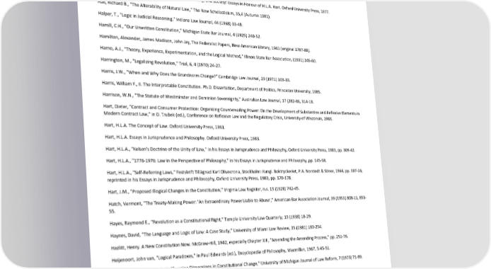 Paradox of Self-Amendment by Peter Suber Guest, Anthony Gordon (ed.). Oxford Essays in Jurisprudence, A Collaborative Work. Oxford University Press, 1961. Guest, S.F.D., "Hart's Primary and Secondary Rules," Otago Law Review, 2 (1972) 417. H., S.H., "Missouri Provision for Periodic Constitutional Revision," Washington University Law Quarterly, 27 (1942) 432-39. Haack, Susan. Deviant Logic: Some Philosophical Issues. Cambridge University Press, 1974. Haack, Susan. Philosophy of Logics. Cambridge University Press, 1978. Hacker, Peter M.S., and Joseph Raz (eds.). Law, Morality, and Society: Essays in Honour of H.L.A. Hart. Oxford University Press, 1977. Hall, Richard B., "The Alterability of Natural Law," The New Scholasticism, 55,4 (Autumn 1981). Halper, T., "Logic in Judicial Reasoning," Indiana Law Journal, 44 (1968) 33-48. Hamill, C.H., "Our Unwritten Constitution," Michigan State Bar Journal, 4 (1925) 240-52. Hamilton, Alexander, James Madison, John Jay, The Federalist Papers, New American Library, 1961 (original 1787-88). Harno, A.J., "Theory, Experience, Experimentation, and the Logical Method," Illinois State Bar Association, (1931) 245-60. Harrington, M., "Legalizing Revolution," Trial, 6, 4 (1970) 24-27. Harris, J.W., "When and Why Does the Grundnorm Change?" Cambridge Law Journal, 29 (1971) 103-33. Harris, William F., II. The Interpretable Constitution. Ph.D. Dissertation, Department of Politics, Princeton University, 1985. Harrison, W.N., "The Statute of Westminster and Dominion Sovereignty," Australian Law Journal, 17 (282-86, 314-18. Hart, Dieter, "Contract and Consumer Protection: Organizing Countervailing Power: On the Development of Substantive and Reflexive Elements in Modern Contract Law," in D. Trubek (ed.), Conference on Reflexive Law and the Regulatory Crisis, University of Wisconsin, 1983. Hart, H.L.A. The Concept of Law. Oxford University Press, 1961. Hart, H.L.A. Essays in Jurisprudence and Philosophy. Oxford University Press, 1983. Hart, H.L.A., "Kelsen's Doctrine of the Unity of Law," in his Essays in Jurisprudence and Philosophy, Oxford University Press, 1983, pp. 309-42. Hart, H.L.A., "1776-1976: Law in the Perspective of Philosophy," in his Essays in Jurisprudence and Philosophy, pp. 145-58. Hart, H.L.A., "Self-Referring Laws," Festskrift Tillägnad Karl Olivecrona, Stockholm: Kungl. Boktryckeriet, P.A. Norstedt & Söner, 1964, pp. 307-16; reprinted in his Essays in Jurisprudence and Philosophy, Oxford University Press, 1983, pp. 170-178. Hart, J.M., "Proposed Illogical Changes in the Constitution," Virginia Law Register, n.s. 13 (1928) 742-45. Hatch, Vermont, "The Treaty-Making Power: 'An Extraordinary Power Liable to Abuse'," American Bar Association Journal, 39 (1953) 808-11, 853- 55. Hayes, Raymond E., "Revolution as a Constitutional Right," Temple University Law Quarterly, 13 (1938) 18-29. Haynes, David, "The Language and Logic of Law: A Case Study," University of Miami Law Review, 35 (1981) 183-254. Hazlitt, Henry. A New Constitution Now. McGraw-Hill, 1942, especially Chapter XIII, "Amending the Amending Process," pp. 251-76. Heijenoort, John van, "Logical Paradoxes," in Paul Edwards (ed.), Encyclopedia of Philosophy, Macmillan, 1967, 5:45-51. Heller, Francis H., "Article V: Changing Dimensions in Constitutional Change," University of Michigan Journal of Law Reform, 7 (1973) 71-89. Heller, Joseph. Catch-22. Dell Publishing Co., 1962. Helm, Paul, "Omnipotence and Change," Philosophy, 51 (1976) 454-61. Hermann, D.H.J., "Structuralist Approach to Legal Reasoning," Southern California Law Review, 48 (1975) 1131-94. Heuston, R.F.V., "Sovereignty," in A.G. Guest (ed.), Oxford Essays in Jurisprudence: A Collaborative Work, Oxford University Press, 1961, pp. 198- 222. Hicks, J.C., "The Liar Paradox in Legal Reasoning," Cambridge Law Journal, 29 (1971) 275-91. 203