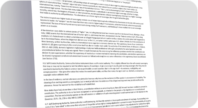 Paradox of Self-Amendment by Peter Suber Moreover, if we reject the model of lawful power that requires it to be authorized or dispensed by another lawful power, it seems we are equally driven to postulate a self-legitimating power. Hence, some circularity in our concept of sovereignty seems unavoidable, just as metaphysicians have never been able to avoid concepts of self-caused causes and self-justifying first principles as the price of avoiding causal and logical infinite regresses. I believe the United States embodies the third type of sovereignty above, unless "the consent of the people" is taken as a nonfictitious source of power and legitimacy. Sovereignty in the United States is not monolithic, but plural and systematically divided. While the parts may not positively "grant" power to the others, the parts do negatively "review" or "check" and limit the power of the others. To follow the chain of reviewing bodies, starting anywhere, one will be led either in a circle (of greater or smaller size depending on where one began) or to "the people". H.5. Sovereignty by default. The persistent, self-positing nature of sovereignty is seen in cases of what might be called sovereignty by default. In the sphere of international law, "monists" argue that when there is apparently no international law on a certain subject, then there really is an international law, namely, "leave it to the domestic law of the individual nations." That is, national sovereignty is itself a dispensation of the international legal system. The idea that every visible form of government is subordinate to an invisible higher sovereign, whether it is logic, morality, natural law, the kingdom of heaven, or international law, explains problematic national sovereignty by referring it to a higher sovereign that holds its authority by self-justification. The alternative is an infinite regress of sovereigns, like the gods behind the gods. The instinct to posit ever higher levels of sovereignty reminds one of Adam Weishaupt who infiltrated the Freemasons in the late 18th century and became its leader. His "weapon" was the hoax that there was a secret, higher body of Freemansons, called the Illuminati, which he supposedly represented. The love of hierarchy and secrecy were both strong among the Freemasons, and Weishaupt's hoax enabled him to win sovereign power as an invader. A few American cases defer to various species of "higher" law, including international law. A recent case from the Second Circuit, (Filartiga v. Pena- Irala, 1980) asserts that the international law of human rights is, and always has been, incorporated into the "federal common law". (This ruling enabled a U.S. federal court to obtain jurisdiction over an alleged Paraguayan torturer sued in tort by a relative of a victim when both happened to be in the United States, when the alleged tort did not occur in the U.S., and when neither party was a U.S. citizen.) Article 25 of the constitution of West Germany, written by the allies, defers to international law as superior to domestic German law. The supremacy clause of our constitution (Article VI, §2) gives supremacy to the constitution itself but also to treaties made under the authority of the United States. In Missouri v. Holland, 252 U.S. 416 (1920), domestic legislation implementing a treaty was held constitutional although substantially the same legislation was held unconstitutional before the treaty was signed. There is much literature on this case raising the reflexivity questions whether the constitution can declare its own supersession, whether the supremacy of treaties is an indirect method of amending the constitution, and whether supremacy can be shared. A proposed constitutional amendment to overrule Holland and straighten out some reflexivities in the supremacy clause was defeated (see Section 17.B). H.6. Self-Created Authority. Some authoritative instruments have a self-created authority. This is slightly different from the self-created sovereignty that may or may not be required to halt the infinite regress of sovereigns. A sign at an airport security point warning passengers that they may be searched is backed by the federal common law on permissible consent searches. But it is the sign itself —its existence, intelligibility, and conspicuousness— that gives the notice that makes the search permissible, and thus that makes the sign's text true. Similarly, a conspicuous copyright notice validates itself. In the law of evidence, excited utterances are admissible hearsay only because the excitement of the speaker is an assurance of reliability. The showing of an exciting event is a prerequisite, but in most jurisdictions the existence of the alleged exciting event may be inferred from the utterance. Hence the warrant for the reliability is self-established. Nine states have had, at one time in their history, a constitution without an amending clause.[Note 20] Yet each has been enabled to amend its constitution. The authority to do so has been recognized on various grounds, as inherent in the people or the legislature or a constitutional convention. The law and scholarly opinion on the self-creation or validation of such amending power is well-summarized in In Re Opinion to the Governor, 55 R.I. 56, 178 A. 433, 449-51 (1935). H.7. Self-Destroying Authority. Some authority is self-destroying. My favorite example is the ex parte annulment of marriage. A proceeding is ex parte if it is "one-sided" in the sense that only one of the parties whose rights is being adjudicated is present in court. The permissibility of ex parte divorce is an exception to the normal rule that courts must have personal jurisdiction over a party before it may adjudicate her substantive rights. The fiction that marriage is a thing (res) that travels with each spouse is used to justify the ex parte divorce. The court granting the divorce has jurisdiction in rem over the thing, marriage, not jurisdiction in personam over t