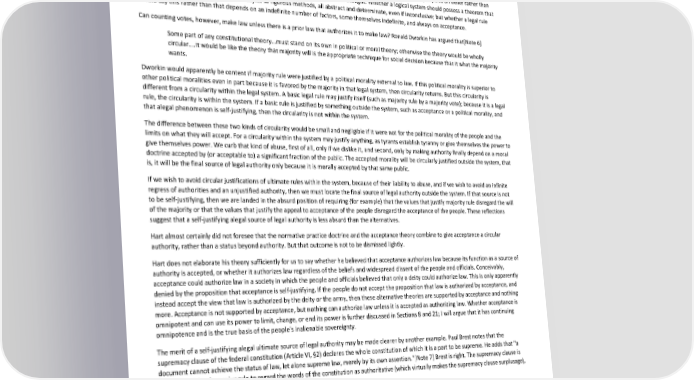 Paradox of Self-Amendment by Peter Suber with an unjustified or arbitrary ultimate rule. The acceptance model, however, allows lesser rules to be validated by higher rules and allows an escape for the ultimate rule: it is not justified or validated by another rule within the system, but by the acceptance of the people. Such a move anchors the artificial system of rules in empirical, historical actuality, a side effect of the theory that Hart is very concerned to preserve. Logicians would be horrified to imagine that acceptance could provide anything like validity or authority to a rule, let alone validity or authority to itself. Acceptance provides no logical support, neither deductive nor inductive, and is as irrelevant to a rule's validity as personal opinion. But here is the crucial difference between legal and logical rules. Logical rules cannot be created, changed, or invalidated by counting votes or heeding the expressions of human will. Legal rules can be. The reason is not that legal rules use a different logic, or irrelevantly depend on belief rather than truth, but that legal rules are products of human history and not merely human thought. Whether a logical system should possess a theorem that says this rather than that is a question subject to rigorous methods, all abstract and determinate, even if inconclusive; but whether a legal rule should say this rather than that depends on an indefinite number of factors, some themselves indefinite, and always on acceptance. Can counting votes, however, make law unless there is a prior law that authorizes it to make law? Ronald Dworkin has argued that[Note 6] Some part of any constitutional theory...must stand on its own in political or moral theory; otherwise the theory would be wholly circular....It would be like the theory that majority will is the appropriate technique for social decision because that it what the majority wants. Dworkin would apparently be content if majority rule were justified by a political morality external to law. If this political morality is superior to other political moralities even in part because it is favored by the majority in that legal system, then circularity returns. But this circularity is different from a circularity within the legal system. A basic legal rule may justify itself (such as majority rule by a majority vote); because it is a legal rule, the circularity is within the system. If a basic rule is justified by something outside the system, such as acceptance or a political morality, and that alegal phenomenon is self-justifying, then the circularity is not within the system. The difference between these two kinds of circularity would be small and negligible if it were not for the political morality of the people and the limits on what they will accept. For a circularity within the system may justify anything, as tyrants establish tyranny or give themselves the power to give themselves power. We curb that kind of abuse, first of all, only if we dislike it, and second, only by making authority finally depend on a moral doctrine accepted by (or acceptable to) a significant fraction of the public. The accepted morality will be circularly justified outside the system, that is, it will be the final source of legal authority only because it is morally accepted by that same public. If we wish to avoid circular justifications of ultimate rules within the system, because of their liability to abuse, and if we wish to avoid an infinite regress of authorities and an unjustified authority, then we must locate the final source of legal authority outside the system. If that source is not to be self-justifying, then we are landed in the absurd position of requiring (for example) that the values that justify majority rule disregard the will of the majority or that the values that justify the appeal to acceptance of the people disregard the acceptance of the people. These reflections suggest that a self-justifying alegal source of legal authority is less absurd than the alternatives. Hart almost certainly did not foresee that the normative practice doctrine and the acceptance theory combine to give acceptance a circular authority, rather than a status beyond authority. But that outcome is not to be dismissed lightly. Hart does not elaborate his theory sufficiently for us to say whether he believed that acceptance authorizes law because its function as a source of authority is accepted, or whether it authorizes law regardless of the beliefs and widespread dissent of the people and officials. Conceivably, acceptance could authorize law in a society in which the people and officials believed that only a deity could authorize law. This is only apparently denied by the proposition that acceptance is self-justifying. If the people do not accept the proposition that law is authorized by acceptance, and instead accept the view that law is authorized by the deity or the army, then these alternative theories are supported by acceptance and nothing more. Acceptance is not supported by acceptance, but nothing can authorize law unless it is accepted as authorizing law. Whether acceptance is omnipotent and can use its power to limit, change, or end its power is further discussed in Sections 8 and 21; I will argue that it has continuing omnipotence and is the true basis of the people's inalienable sovereignty. The merit of a self-justifying alegal ultimate source of legal authority may be made clearer by another example. Paul Brest notes that the supremacy clause of the federal constitution (Article VI, ยง2) declares the whole constitution of which it is a part to be supreme. He adds that "a document cannot achieve the status of law, let alone supreme law, merely by its own assertion."[Note 7] Brest is right. The supremacy clause is made true either by a prior rule to regard the words of the constitution as authoritative (which virtually makes the supremacy clause surplusage), or by direct acceptance of the terms of 