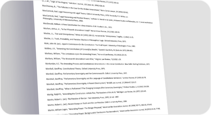Paradox of Self-Amendment by Peter Suber Luhmann, Niklas, "Some Problems with Reflexive Law," in G. Teubner (ed.), Reflexive Law: Autonomy and Regulation, Walter de Gruyter, 1986. Lumb, R.D., "Fundamental Law and the Processes of Constitutional Change in Australia," Federal Law Review, 9 (1978) 148-84. Lumb, R.D., "Natural Law —An Unchanging Standard?" Catholic Lawyer, 6 (1960) 224. Lunt, Dudley C., "Amending the Constitution," Lawyer and Banker, 23 (1930) 252-54. Lyons, D., "On Formal Justice," Cornell Law Review, 58 (1973) 833-61. Lyons, D., "Logic and Coercion in Bentham's Theory of Law," Cornell Law Review, 57 (1972) 335-62. M., L.W., "Logic of the Illogical," Solicitors' Journal, 102 (June 14, 1958) 428-29. MacChesney, B., "The Fallacies in the Case for the Bricker Amendment," Notre Dame Lawyer, 29 (1954) 529-82. MacCormick, Neil. Legal Reasoning and Legal Theory. Oxford University Press, 1978. Review by P.D. White, q.v. MacCormick, Neil, "Legal Reasoning and Practical Reason," in Peter A. French et al. (eds.), Midwest Studies in Philosophy, vol. 7, Social and Political Philosophy, University of Minnesota Press, 1982. MacDonald, William. A New Constitution for a New America. B.W. Huebsch, Inc., 1921. Machen, Arthur, Jr., "Is the Fifteenth Amendment Void?" Harvard Law Review, 23 (1910) 169-93. Mackie, J.L., "Evil and Omnipotence," Mind, 64 (1955) 200-12, revised in his "Omnipotence," Sophia, 1 (1962) 13-25. Mackie, J.L. Truth, Probability, and Paradox: Studies in Philosophical Logic. Oxford University Press, 1973. Maki, John M. (ed.). Japan's Commission On the Constitution: The Final Report. University of Washington Press, 1980. Mallory, J.R., "Amending the Constitution [of Canada] by Stealth," Queen's Quarterly, 82 (Autumn 1975) 394-401. Marbury, William, "The Limitations Upon the Amending Power," Harvard Law Review, 33 (1919) 223-35. Marbury, William, "The Nineteenth Amendment and After," Virginia Law Review, 7 (1920) 1-29. Markandan, K.C. The Amending Process and Constitutional Amendments in the Indian Constitution. New Delhi: Sterling Publishers, 1972. Marshall, Geoffrey. Constitutional Theory. Oxford University Press, 1971. Marshall, Geoffrey. Parliamentary Sovereignty and the Commonwealth. Oxford University Press, 1957. Marshall, Geoffrey, "Parliamentary Sovereignty and the Language of Constitutional Limitation," Juridical Review, 67 (1955) 62-78. Marshall, Geoffrey, "Parliamentary Sovereignty: A Recent Development," McGill Law Journal, 12 (1966-67) 523-27. Marshall, Geoffrey, "What is Parliament? The Changing Concept of Parliamentary Sovereignty," Political Studies, 2, 3 (1954) 193-209. Martig, Ralph R., "Amending the Constitution. Article Five; The Keystone of the Arch," Michigan Law Review, 35 (1937) 1253-85. Martin, Robert L. (ed.). The Paradox of the Liar. Yale University Press, 1970; 2d ed. 1987. Martin, Robert L. (ed.). Recent Essays on Truth and the Liar Paradox. Oxford University Press, 1984. Martin, William Logan, "Amending Power: The Ebinger Proposal," American Bar Association Journal, 40 (1954) 767-71, 802-03, 974-45. Martin, William Logan, "Amending Power: Background of the Income Tax Amendment," American Bar Association Journal, 39 (1953) 21-24, 77-80, 124-27, 167-68. Mason, M.S., "Logical Structure of a Proposition of Law," Jurimetrics, 11 (1971) 99-122. Mavrodes, George I., "Some Puzzles Concerning Omnipotence," Philosophical Review, 72 (1963) 221-23. Maynez, Eduardo Garcia, "Some Considerations on the Problem of Antinomies in the Law," Archiv für Rechts- und Sozialphilosophie, 49, 1 (1963) 1- 14. Mayo, Bernard, "Mr. Keene on Omnipotence," Mind, 70 (1961) 249-50. 207