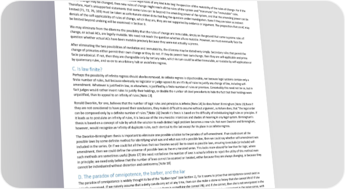 Paradox of Self-Amendment by Peter Suber Second, we should eliminate the possibility of the immutability of the secondary rules of change as empirically false and question begging. Even supreme rules of change are legally mutable, as evidenced by the history of the amendments to the ACs of the various state constitutions in the United States (see Appendix 2). Lesser rules of change are mutable under the higher rules of change and the ACs. One might argue that the existing (and mutable) ACs are only secondary rules of change, and that there exist rules of change at the tertiary level or above that are genuinely immutable. Alf Ross takes this position (see Section 5). But we are investigating actual ACs, which have historically often been amended. They at least are mutable, and we are only eliminating the assertion of their immutability from the dilemma. The option of affirming the immutability of higher level, but tacit, rules of change is preserved by the denial of the immutability of secondary rules, and will be examined on its merits (see Sections 8 and 9). It is important to note that to postulate immutable legal rules of any kind is to beg the question of the mutability of the rules of change. For if the rules of change may be changed, then new rules of change might reach all the rules of the system and "transmute" the "immutable" rules. Therefore, Hart's unsupported statements that some rules can lie beyond the amending power of the system, and that the amending power can be limited (71, 72, 76, 103) must be taken as unfortunate obiter dicta that beg the question under investigation. Even if they are taken as indirect denials of the self-applicability of rules of change, which they are, they are not supported by evidence or argument. The proposition that an AC may be limited beyond undoing will be examined in Section 9. We may eliminate from the dilemma the possibility that the rules of change are immutable, simply on the ground that some supreme rules of change, or actual ACs, are legally mutable. We need not reach the question whether all are mutable. However, we must eventually face the question whether actual ACs have been mutable precisely because they were not actually supreme. After eliminating the two possibilities of revolution and immutability, the dilemma may be stated very simply. Secondary rules that permit the change of primaries either permit their own change or they do not. If they do permit their own change, then they are self-applicable and prima facie paradoxical. If not, then they are changeable only by tertiary rules, which in turn could be either immutable, or mutable by self-application or by quaternary rules, and so on to an arbitrary halt or an infinite regress. C. Is law finite? Perhaps the possibility of infinite regress should also be removed. An infinite regress is objectionable, not because legal systems contain only a finite number of rules, but because obviously no legislator or judge appeals to an infinity of rules to justify any change of law, including self- amendment. Whatever is justified in law, as elsewhere, is justified by a finite number of rules or premises. Conceivably this need not be so, but in fact judges would rather invent rules to justify their holdings, or double the number of cited precedents to hide the fact that their holdings were unjustified, than to appeal to an infinity of rules.[Note 13] Ronald Dworkin, for one, believes that the number of legal rules and principles is infinite.[Note 14] So does Robert Birmingham.[Note 15] Even if they are not considered to have proved their conclusions, they make it difficult to assume without argument, as Kelsen does, that "the legal order can be composed only by a definite number of rules."[Note 16] Dworkin's thesis is based on the difficulty of individuating legal rules or principles. If it leads us to postulate an infinity of rules, it is because of the innumerable interstices and shades of meaning in any legal system. Birmingham's thesis is based on a concept of rule by which the solution to each distinct legal problem becomes a new rule. Not even Dworkin and Birmingham, however, would recognize an infinity of duplicate rules, each identical to the last except for its place in an infinite regress. The Dworkin-Birmingham thesis is important to eliminate one possible solution to the paradox of self-amendment. If we could count all the possible laws by some definite method for identifying what was and what was not a possible law, then we could say whether self-amendment was included in the series. Or if we could list all the laws that our theories would like to count as possible laws, ensuring to exclude (or include) self- amendment, then we could define the universe of possible laws as the enumerated series. This looks more absurd for law than for logic, where such methods are sometimes useful.[Note 17] We need not believe the number of laws is actually infinite to reject the utility of this method even in principle; we need only believe that the number of laws cannot be counted or iterated, either because they are always changing, or because they cannot be individuated without distortion and controversy.[Note 18] D. The paradox of omnipotence, the barber, and the liar The paradox of omnipotence is widely thought to be of the "Barber-type" (see Section 1), for it seems to prove that omnipotence cannot exist as naively conceived. If we naively assume that a deity can do any act at any time, then can she make a stone so heavy that she cannot lift it? If she can, then she is not omnipotent in the naive sense (because there is something she cannot lift); and if she cannot, then she is not omnipotent in the naive sense (because there is something she cannot create). The natural solution is to deny that there is a deity omnipotent in the naive sense, with the power to do any act at any time. Similarly, can a constitutional amending clause amend itself —especially, can it do so when it is the 
