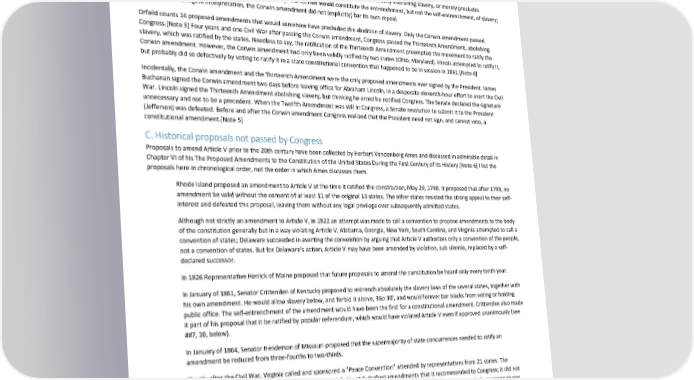 Paradox of Self-Amendment by Peter Suber No Amendment shall be made to the Constitution which will authorize or give to Congress the power to abolish or interfere, within any state, with the domestic institutions thereof, including that of persons held to labor or service by the laws of said State. Congress adopted this proposal on March 2, 1861. It is substantively, although somewhat covertly, concerned with slavery. It proposes to protect slave states from congressional interference. But it can rightly be considered an amendment to Article V because, if ratified, it would significantly and expressly have curtailed the federal amending power. Moreover, as originally adopted, Article V included an express limitation that prevented the abolition of slavery by amendment until 1808. The Corwin amendment would have renewed the limitation in perpetuity. The Corwin amendment is ambiguous on the question whether it precludes an amendment directly abolishing slavery, or merely precludes amendments that authorize Congress to abolish slavery. The former would constitute the entrenchment, but not the self-entrenchment, of slavery; even under its stringent interpretation, the Corwin amendment did not (explicitly) bar its own repeal. Orfield counts 14 proposed amendments that would somehow have precluded the abolition of slavery. Only the Corwin amendment passed Congress.[Note 3] Four years and one Civil War after passing the Corwin amendment, Congress passed the Thirteenth Amendment, abolishing slavery, which was ratified by the states. Needless to say, the ratification of the Thirteenth Amendment preempted the movement to ratify the Corwin amendment. However, the Corwin amendment had only been validly ratified by two states (Ohio, Maryland). Illinois attempted to ratify it, but probably did so defectively by voting to ratify it in a state constitutional convention that happened to be in session in 1861.[Note 4] Incidentally, the Corwin amendment and the Thirteenth Amendment were the only proposed amendments ever signed by the President. James Buchanan signed the Corwin amendment two days before leaving office for Abraham Lincoln, in a desperate eleventh-hour effort to avert the Civil War. Lincoln signed the Thirteenth Amendment abolishing slavery, but thinking he erred he notified Congress. The Senate declared the signature unnecessary and not to be a precedent. When the Twelfth Amendment was still in Congress, a Senate resolution to submit it to the President (Jefferson) was defeated. Before and after the Corwin amendment Congress realized that the President need not sign, and cannot veto, a constitutional amendment.[Note 5] C. Historical proposals not passed by Congress Proposals to amend Article V prior to the 20th century have been collected by Herbert Vandenberg Ames and discussed in admirable detail in Chapter VI of his The Proposed Amendments to the Constitution of the United States During the First Century of its History.[Note 6] I list the proposals here in chronological order, not the order in which Ames discusses them. Rhode Island proposed an amendment to Article V at the time it ratified the constitution, May 29, 1790. It proposed that after 1793, no amendment be valid without the consent of at least 11 of the original 13 states. The other states resisted the strong appeal to their self- interest and defeated this proposal, leaving them without any legal privilege over subsequently admitted states. Although not strictly an amendment to Article V, in 1822 an attempt was made to call a convention to propose amendments to the body of the constitution generally but in a way violating Article V. Alabama, Georgia, New York, South Carolina, and Virginia attempted to call a convention of states; Delaware succeeded in averting the convention by arguing that Article V authorizes only a convention of the people, not a convention of states. But for Delaware's action, Article V may have been amended by violation, sub silentio, replaced by a self- declared successor. In 1826 Representative Herrick of Maine proposed that future proposals to amend the constitution be heard only every tenth year. In January of 1861, Senator Crittenden of Kentucky proposed to entrench absolutely the slavery laws of the several states, together with his own amendment. He would allow slavery below, and forbid it above, 36o 30', and would forever bar blacks from voting or holding public office. The self-entrenchment of the amendment would have been the first for a constitutional amendment. Crittenden also made it part of his proposal that it be ratified by popular referendum, which would have violated Article V even if approved unanimously (see ##7, 10, below). In January of 1864, Senator Henderson of Missouri proposed that the supermajority of state concurrences needed to ratify an amendment be reduced from three-fourths to two-thirds. Shortly after the Civil War, Virginia called and sponsored a "Peace Convention" attended by representatives from 21 states. The convention was not called under the procedures of Article V, yet it drafted amendments that it recommended to Congress; it did not purport to ratify the amendments. One proposal by a Mr. Florence, representative from Pennsylvania, is particularly germane to our topic: The reserved power of the people in three-fourths of the states to call and form a national convention to alter, amend, or abolish this Constitution, according to its provisions, shall never be questioned, notwithstanding the direction in Article V of the Constitution. The amendment would in effect have made solid constitutional law out of the glorious but legally uncertain language of the Declaration of Independence (see Section 18). However, Mr. Florence did not appreciate that making the right to "alter, amend, or abolish" into an 173
