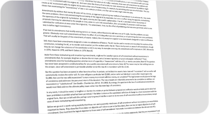 Paradox of Self-Amendment by Peter Suber which might seem the least troublesome examples; but in fact they create difficulties. If the original AC has been interpreted as the exclusive set of methods of amendment, then is amendment to provide another method a change to a form inconsistent with the original form? The answer must be yes, if we consider the meaning of constitutional language, even for purposes of deciding such "logical" questions as consistency, to be a function of the interpretation of the courts, especially the highest courts. The AC by its exclusivity "preempted the field", making all additions "inconsistent" with the original AC. However, this is a case in which specific authorization will prevent inconsistency (see Section 11.A and below in this sub-section). A specific authorization to add new methods of amendment will rebut the original presumption or refute the original interpretation of exclusivity. A federal statute that was intended to preempt the field, say, by specifically authorizing state additions or modifications, is not inconsistent with such state modifications, except by other tests of inconsistency. This shows that when an AC really is exclusive, then even self-amendment by addition will create an AC inconsistent with the original AC. And even when the theory of exclusivity has been abandoned, self-amendment by addition might create an AC inconsistent with the original AC by some other test of inconsistency, for example, by permitting what was once forbidden. This also shows that ascertaining the "inconsistency" of laws is not a simple problem, and that various tests might come into play. Amendments by addition that merely fill voids left by silence, as opposed to providing new methods of amendment to an exclusive AC, may create the same problems. One is not contradicting the exclusivity of the original AC by expansion, but one is in effect doing the opposite, contradicting the openness of the original AC by limitation. But again, one may do it by specific authorization. If an AC is amended to limit the number of proposals that may be submitted to the people at once, when no such limit existed before, then presumably 25 proposals could have been submitted for ratification at once under the original AC. The amendment, then, has the effect of prohibiting what was once permitted, which is one way to define legal inconsistency. If we look to amendments that modify existing sections or clauses, rather than merely add new ones or fill voids, then the problems are even greater. Obviously most such amendments will have the effect of prohibiting what was once permitted, or of permitting what was once prohibited. That will usually be the point of the amendment, of course. Indeed, the only exceptions appear to be amendments designed to make no difference. Still, there have been amendments designed to make no substantive difference. The AC may be used to reorder and renumber the sections of the constitution, including the AC, or to reorder and renumber just the sections within the AC. These clearly count as cases of self-amendment, though they do not change the substance of the constitution or AC in any way. As examples one may cite amendments in Pennsylvania in 1967, Minnesota in 1974, Hawaii in 1978, and North Dakota in 1979.[Note 8] Aside from these restructuring and renumbering amendments, might we find another species of self-amendment without inconsistency in amendments that, for example, lengthen or shorten the minimum period between legislative proposal and popular ratification? These amendments raise the fascinating question whether more of a quantity is "inconsistent" with less of it, or merely cumulative.[Note 9] The question has never been answered in constitutional law for any quantity associated with amendments.[Note 10] The reason may be that nothing turns on the answer, since self-amendment is permissible whether or not the new AC is inconsistent with the old AC. But the question has been answered in other branches of law. In probate, settled doctrine asserts that a later will "inconsistent" with an earlier will automatically revokes the earlier will. If a later will gives a particular heir $2,000, and an earlier will identical in every other respect gave only $1,000, then are the two wills inconsistent? Is more money inconsistent with less money, or cumulative? The legal answer mostly ignores the logic of consistency and addresses the presumed intent of the decedent. The two amounts are rebuttably presumed to be cumulative or additive, not inconsistent or "substitutional". See Gould v. Chamberlain, 68 N.E. 39 (1903). By analogy, the question in the law of constitutional amendments would most likely address the ultimate policy issues rather than the mere logic of consistency. In any event, it should be noted, to lengthen or shorten the minimum period between proposal and ratification would certainly permit what had been prohibited or prohibit what had been permitted. If the latter is taken as the operational definition of change to a form inconsistent with the original form, then we are left with the perhaps surprising result that there seem to be no cases of self-amendment without inconsistency except cases of mere restructuring and renumbering. Before we go on it is worth noting explicitly that these rare and apparently trivial cases of self-amendment without inconsistency are nevertheless important to theory. They show that if one does not object to self-reference per se (as Ross does), then one has no logical objection to all self- amendment. One must limit the logical objection to those cases of self-amendment that create inconsistencies between the old and new ACs. Now what is the proper legal test of inconsistency? The simplest logical test applies only to declarative statements: that they are inconsistent if and only if their conjunction is a contradiction. It does not carry over into the realm of prescriptive statements, if only because pre