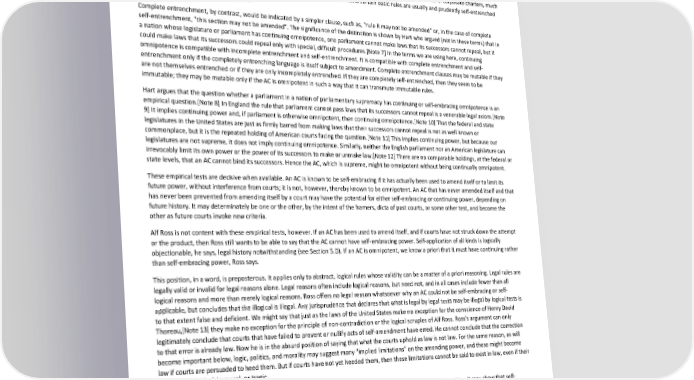 Paradox of Self-Amendment by Peter Suber We must also distinguish complete and incomplete entrenchment. Complete entrenchment protects a passage from amendment per se, while incomplete entrenchment only protects it from ordinary or routine amendment. Incomplete entrenchment may suspend the usual amendment procedures for the entrenched passage and require a special, more difficult procedure. Whether complete entrenchment protects rules from amendment immutably should not be prejudged from the word "complete". If an entrenchment clause said, "rule R can be amended only by convention" or "only by 90% supermajorities in each house and the concurrence of 80% of the states", then it would describe incomplete entrenchment. That, obviously, would do little good unless it entrenched itself to the same or greater degree of difficulty. For this reason entrenchment clauses are often thought to imply self-entrenchment. Hence in corporate charters, much more often than in constitutions, the articles requiring supermajority votes to amend certain basic rules are usually and prudently self-entrenched incompletely at the same supermajorities. Complete entrenchment, by contrast, would be indicated by a simpler clause, such as, "rule R may not be amended" or, in the case of complete self-entrenchment, "this section may not be amended". The significance of the distinction is shown by Hart who argued (not in these terms) that in a nation whose legislature or parliament has continuing omnipotence, one parliament cannot make laws that its successors cannot repeal, but it could make laws that its successors could repeal only with special, difficult procedures.[Note 7] In the terms we are using here, continuing omnipotence is compatible with incomplete entrenchment and self-entrenchment. It is compatible with complete entrenchment and self- entrenchment only if the completely entrenching language is itself subject to amendment. Complete entrenchment clauses may be mutable if they are not themselves entrenched or if they are only incompletely entrenched. If they are completely self-entrenched, then they seem to be immutable; they may be mutable only if the AC is omnipotent in such a way that it can transmute immutable rules. Hart argues that the question whether a parliament in a nation of parliamentary supremacy has continuing or self-embracing omnipotence is an empirical question.[Note 8] In England the rule that parliament cannot pass laws that its successors cannot repeal is a venerable legal axiom.[Note 9] It implies continuing power and, if parliament is otherwise omnipotent, then continuing omnipotence.[Note 10] That the federal and state legislatures in the United States are just as firmly barred from making laws that their successors cannot repeal is not as well known or commonplace, but it is the repeated holding of American courts facing the question.[Note 11] This implies continuing power, but because our legislatures are not supreme, it does not imply continuing omnipotence. Similarly, neither the English parliament nor an American legislature can irrevocably limit its own power or the power of its successors to make or unmake law.[Note 12] There are no comparable holdings, at the federal or state levels, that an AC cannot bind its successors. Hence the AC, which is supreme, might be omnipotent without being continually omnipotent. These empirical tests are decisive when available. An AC is known to be self-embracing if it has actually been used to amend itself or to limit its future power, without interference from courts; it is not, however, thereby known to be omnipotent. An AC that has never amended itself and that has never been prevented from amending itself by a court may have the potential for either self-embracing or continuing power, depending on future history. It may determinately be one or the other, by the intent of the framers, dicta of past courts, or some other test, and become the other as future courts invoke new criteria. Alf Ross is not content with these empirical tests, however. If an AC has been used to amend itself, and if courts have not struck down the attempt or the product, then Ross still wants to be able to say that the AC cannot have self-embracing power. Self-application of all kinds is logically objectionable, he says, legal history notwithstanding (see Section 5.D). If an AC is omnipotent, we know a priori that it must have continuing rather than self-embracing power, Ross says. This position, in a word, is preposterous. It applies only to abstract, logical rules whose validity can be a matter of a priori reasoning. Legal rules are legally valid or invalid for legal reasons alone. Legal reasons often include logical reasons, but need not, and in all cases include fewer than all logical reasons and more than merely logical reasons. Ross offers no legal reason whatsoever why an AC could not be self-embracing or self- applicable, but concludes that the illogical is illegal. Any jurisprudence that declares that what is legal by legal tests may be illegal by logical tests is to that extent false and deficient. We might say that just as the laws of the United States make no exception for the conscience of Henry David Thoreau,[Note 13] they make no exception for the principle of non-contradiction or the logical scruples of Alf Ross. Ross's argument can only legitimately conclude that courts that have failed to prevent or nullify acts of self-amendment have erred. He cannot conclude that the correction to that error is already law. Now he is in the absurd position of saying that what the courts uphold as law is not law. For the same reason, as will become important below, logic, politics, and morality may suggest many "implied limitations" on the amending power, and these might become law if courts are persuaded to heed them. But if courts have not yet heeded them, then these limitations cannot be said to exist in law, even if their omission is illogical, immoral, or tragic