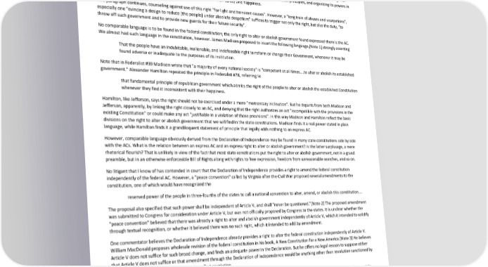 Paradox of Self-Amendment by Peter Suber Section 18: Amendment by "Inalienable Right to Alter or Abolish Government" A. Amending v. altering or abolishing The third sentence of the Declaration of Independence reads: That to secure these rights [to life, liberty, and the pursuit of happiness], governments are instituted among men, deriving their just powers from the consent of the governed; that, whenever any form of government becomes destructive of these ends, it is the right of the people to alter or abolish it, and to institute a new government, laying its foundations on such principles, and organizing its powers in such form, as to them shall seem most likely to effect their safety and happiness. This paragraph continues, counseling against use of this right "for light and transient causes". However, a "long train of abuses and usurpations", especially one "evincing a design to reduce [the people] under absolute despotism" suffices to trigger not only the right, but also the duty, "to throw off such government and to provide new guards for their future security". No comparable language is to be found in the federal constitution; the only right to alter or abolish government found expressed there is the AC. We almost had such language in the constitution, however. James Madison proposed to insert the following language,[Note 1] strongly asserting That the people have an indubitable, inalienable, and indefeasible right to reform or change their Government, whenever it may be found adverse or inadequate to the purposes of its institution. Note that in Federalist #39 Madison wrote that "a majority of every national society" is "competent at all times....to alter or abolish its established government." Alexander Hamilton repeated the principle in Federalist #78, referring to that fundamental principle of republican government which admits the right of the people to alter or abolish the established Constitution whenever they find it inconsistent with their happiness. Hamilton, like Jefferson, says the right should not be exercised under a mere "momentary inclination". But he departs from both Madison and Jefferson, apparently, by linking the right closely to an AC, and denying that the right authorizes an act "incompatible with the provisions in the existing Constitution" or could make any act "justifiable in a violation of those provisions". In this way Madison and Hamilton reflect the basic divisions on the right to alter or abolish government that we will find in the state constitutions. Madison finds it a real power stated in plain language, while Hamilton finds it a grandiloquent statement of principle that legally adds nothing to an express AC. However, comparable language obviously derived from the Declaration of Independence may be found in many state constitutions side by side with the ACs. What is the relation between an express AC and an express right to alter or abolish government? Is the latter surplusage, a mere rhetorical flourish? That is unlikely in view of the fact that most state constitutions put the right to alter or abolish government, not in a grand preamble, but in an otherwise enforceable Bill of Rights along with rights to free expression, freedom from unreasonable searches, and so on. No litigant that I know of has contended in court that the Declaration of Independence provides a right to amend the federal constitution independently of the federal AC. However, a "peace convention" called by Virginia after the Civil War proposed several amendments to the constitution, one of which would have recognized the reserved power of the people in three-fourths of the states to call a national convention to alter, amend, or abolish this constitution.... The proposal also specified that such power shall be independent of Article V, and shall "never be questioned."[Note 2] The proposed amendment was submitted to Congress for consideration under Article V, but was not officially proposed by Congress to the states. It is unclear whether the "peace convention" believed that there was already a right to alter and abolish government independently of Article V, which it intended to solidify through textual recognition, or whether it believed there was no such right, which it intended to add by amendment. One commentator believes the Declaration of Independence already provides a right to alter the federal constitution independently of Article V. William MacDonald proposes wholesale revision of the federal constitution in his book, A New Constitution for a New America.[Note 3] He believes Article V does not suffice for such broad change, and finds an adequate power in the Declaration. But he offers no legal reason to suppose either that Article V does not suffice or that amendment through the Declaration of Independence would be anything other than revolution sanctioned by the same moral principles that sanctioned our first revolution. The question of the relation of an AC to a right to alter or abolish government is raised most pointedly for state constitutions, which often contain both rights in equally explicit language in equally enforceable sections of the constitution. One difference should be noted at the outset. In the absence of entrenchment clauses, the power to amend through an AC is limited only by procedures —such as supermajority votes, limits on the number of amendments that may be submitted at one time, minimum time intervals between amendments, and so on. Clauses containing a right to alter and abolish government, on the other hand, are usually silent or extremely vague on procedure, but do not hesitate to outline substantive conditions that would justify exercising the right. 124