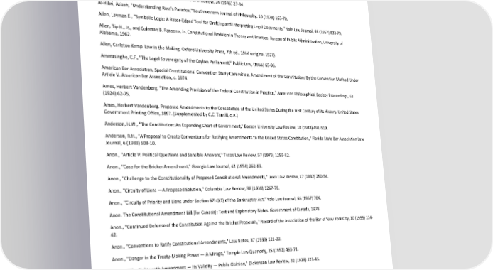 Paradox of Self-Amendment by Peter Suber Bibliography Aarnio, Aulis. On Legal Reasoning. Turku, Finland: Turun Yliopisto, 1977. Abbott, Everett V., "Inalienable Rights and the Eighteenth Amendment," Columbia Law Review, 20 (1920) 183-95. Alchourron, Carlos E., and Eugenio Bulygin. Normative Systems. Springer Verlag, 1971. Alexander, E.R., "Constitutional Strait Jacket for Canada," Canadian Bar Review, 43 (1965) 262-313. Alexander, J.P., "The Law Behind the Law," Texas Law Review, 24 (1946) 27-34. Al-Hibri, Azizah, "Understanding Ross's Paradox," Southwestern Journal of Philosophy, 10 (1979) 163-70. Allen, Layman E., "Symbolic Logic: A Razor-Edged Tool for Drafting and Interpreting Legal Documents," Yale Law Journal, 66 (1957) 833-79. Allen, Tip H., Jr., and Coleman B. Ransone, Jr. Constitutional Revision in Theory and Practice. Bureau of Public Administration, University of Alabama, 1962. Allen, Carleton Kemp. Law in the Making. Oxford University Press, 7th ed., 1964 (original 1927). Amerasinghe, C.F., "The Legal Sovereignty of the Ceylon Parliament," Public Law, (1966) 65-96. American Bar Association, Special Constitutional Convention Study Committee. Amendment of the Constitution: By the Convention Method Under Article V. American Bar Association, c. 1974. Ames, Herbert Vandenberg, "The Amending Provision of the Federal Constitution in Practice," American Philosophical Society Proceedings, 63 (1924) 62-75. Ames, Herbert Vandenberg. Proposed Amendments to the Constitution of the United States During the First Century of its History. United States Government Printing Office, 1897. (Supplemented by C.C. Tansill, q.v.) Anderson, H.W., "The Constitution: An Expanding Chart of Government," Boston University Law Review, 18 (1938) 491-510. Anderson, R.H., "A Proposal to Create Conventions for Ratifying Amendments to the United States Constitution," Florida State Bar Association Law Journal, 6 (1933) 508-10. Anon., "Article V: Political Questions and Sensible Answers," Texas Law Review, 57 (1979) 1259-82. Anon., "Case for the Bricker Amendment," Georgia Law Journal, 42 (1954) 262-89. Anon., "Challenge to the Constitutionality of Proposed Constitutional Amendments," Iowa Law Review, 17 (1932) 250-54. Anon., "Circuity of Liens —A Proposed Solution," Columbia Law Review, 38 (1938) 1267-78. Anon., "Circuity of Priority and Liens under Section 67(c)(1) of the Bankruptcy Act," Yale Law Journal, 66 (1957) 784. Anon. The Constitutional Amendment Bill [for Canada]: Text and Explanatory Notes. Government of Canada, 1978. Anon., "Continued Defense of the Constitution Against the Bricker Proposals," Record of the Association of the Bar of New York City, 10 (1955) 114- 42. Anon., "Conventions to Ratify Constitutional Amendments," Law Notes, 37 (1933) 121-22. Anon., "Danger in the Treaty-Making Power — A Mirage," Temple Law Quarterly, 25 (1952) 463-71. Anon., "The Eighteenth Amendment — Its Validity — Public Opinion," Dickenson Law Review, 32 (1928) 223-45. Anon., "The FBI's Show of Shows," Time Magazine, 116, 9 (September 1, 1980) 14ff. Anon., "Judicial Review and the Growth of the Treaty Power," Syracuse Law Review, 3 (1952) 315-22. Anon., [Note on circular liens], Virginia Law Review, 15 (1928) 90. Anon., [Note on circular liens], Harvard Law Review, 67 (1953) 358. Anon., "Our Constitution and the Dangers of the Bricker Proposals," Record of the Association of the Bar of New York City, 8 (1953) 454-85. 195