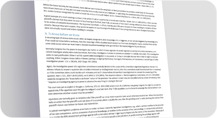 Paradox of Self-Amendment by Peter Suber broken in Griggs v. Duke Power Co., 401 U.S. 424 (1971). District lines that deprive voters of equally weighted votes lead to unrepresentative legislatures, which lead in turn to the perpetuation of such lines. This circle was broken in Wesberry v. Sims, 376 U.S. 1 (1964). Indigent criminal defendants who could not pay their fines formerly had to stay in jail until they could do so or else "work them out" in jail at a miserly rate. This not only prevented such defendants from earning the money to pay their fines, but also kept them poor. This circle was broken in Williams v. Illinois, 399 U.S. 235 (1970). The state of Idaho formerly favored men over women as administrators of estates. It argued that this decision was not arbitrary because it reduced the workload on probate courts in deciding who is most fit to serve as administrator, i.e. it is not arbitrary because there are some advantages to arbitrary preferences. This vicious circle would justify any kind of discrimination. (It saves court time to decide contract cases in favor of the richer party, and police time to arrest only black people.) This circle was broken when Idaho's preference was struck down in Reed v. Reed, 404 U.S. 71 (1971). Before the Social Security Act was passed, states did not want to tax the employers in their jurisdictions to provide a relief fund, for that would have driven them out; or they did not want to be the first or only state to tax employers. In upholding the constitutionality of the Social Security Act, Justice Cardozo recognized the need to break this vicious circle with federal action. Stewart Machine Co. v. Davis, 301 U.S. 548 (1937). A good example of a court creating a vicious circle when it had an opportunity to break one is Warth v. Seldin, 422 U.S. 490 (1975). In that case the plaintiffs claimed that they were too poor to buy housing in Penfield, New York, on account of that town's zoning ordinances; hence they claimed to be victims of unlawful discrimination. The Supreme Court held, in effect, that the plaintiffs were too poor to have standing to complain of their poverty. Because they were so poor, they would be unable to buy housing in Penfield even if the zoning ordinances were changed; hence they were not actually injured and lacked standing to complain. N. To know before we know A recurring type of vicious circle occurs when an inquiry designed to yield knowledge of x is triggered, or can only be triggered, by knowledge of x. If we could not know before we knew, then the mere logic of the situation would prevent us from ever starting the inquiry. Another form of the same circle occurs when we must make a decision based on knowledge to be gained from the inquiry triggered by our decision. Normally Congress has the power to investigate any matter on which it may legislate. It cannot legislate on wholly intra-state commerce, so it cannot investigate wholly intra-state businesses. But it may investigate a business to determine whether it is wholly intra-state. This investigation seeks its own justification. Either it will be a permissible investigation in any event, or it may in principle discover that it had no right to discover anything. Either Congress knows before it knows (perhaps corrigibly) that it may investigate that business, or it possesses a second type of valid investigative power. U.S. v. DiCarlo, 102 F.Supp. 597 (1951). Again, the investigative power of a legislative committee is normally limited to the scope of the committee's legitimate legislative interest. If a witness refuses to answer a question she considers irrelevant to that legitimate interest, then the committee could formerly hold her in contempt, as if the committee alone could decide such relevancy and as if it knew before it knew that it was legitimate to compel the answering of the question. Bart v. U.S., 203 F.2d 45 (1953), rev'd 349 U.S. 219 (1955). The dissent in Gibson v. Florida Legislation Committee, 371 U.S. 539 (1963) explicitly recognizes the "know before we know" nature of the problem: the witness' answer may be compelled only by a claim of relevancy that "requires an investigating agency to prove in advance the very thing it is trying to find out." The court was just as explicit in Douglas v. California, 372 U.S. 353 (1963) when it said of a California rule giving indigents the right to counsel on appeal only if the appellate court thought the indigent's case had merit, that "[t]he appellate court is forced to prejudge the merits before it can even determine whether counsel must be provided." Injunctions are normally given as remedies only if the plaintiff can show that irreparable harm would otherwise result to her. When the injunction halts an action that the plaintiff could sue about if it occurred, which is usually the case, then the granting court is really deciding the merits of the plaintiff's future case before the future case materializes. In judicial investigations problems arise that are similar to those created by legislative investigations, e.g., when a witness testifies to the grounds of her own competence, such as possession of personal knowledge, or testifies to the existence of her own privilege. In criminal trials witnesses may invoke the Fifth Amendment privilege against self-incrimination without triggering any inquiry into the merits of the invocation. Obviously if witnesses could be compelled to give evidence that certain testimony would incriminate them, to justify invoking the privilege against self- incrimination, then the privilege would be pointless. So the privilege in effect makes certain claims self-warranting, or self-insulating and unreviewable. This does not stop courts from denying a witness' claim of self-incrimination occasionally, e.g. if immunity has already been granted. But normally the privilege is the witness' virtually for the asking, as if we knew before we knew that it was due —or as if we had decided that it is