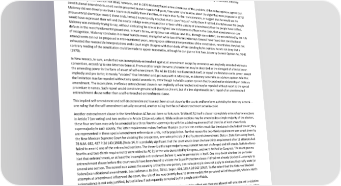 Paradox of Self-Amendment by Peter Suber Maloney contends that, in any event, no present amendment of the New Mexican constitution could endanger New Mexico's status as a state. The statehood issue clearly overwhelmed the self-disentrenchment issue, as well it might under New Mexico's unique circumstances: no other state was required by Congress to change its AC, or even to vote on changes, as a precondition of admission, even though many other states used the same two-thirds supermajority for ratification of state amendments.[Note 13] In Arizona where the required changes were quickly repealed, the changes had not been self-amendments nor the repeals self-disentrenchments. Later in the same year Maloney finally reached the self-disentrenchment question when he repeated his earlier ruling that AC §1 had not been amended by implication. This time he based his reasoning on the impermissibility of any amendment of AC §1 except by convention. Attorney General Opinion No. 69-151 (1969). The underlying issue was still not dead, however, and in 1970 Maloney faced a new dimension of the problem: if the earlier opinions agreed that constitutional amendments could not be proposed in even-numbered years, then what is to be done about the eight that were proposed in 1970? Maloney did not directly say that a court could nullify them if ratified, or enjoin their further consideration, or suggest that he would use his prosecutorial discretion toward these ends. Instead he personally doubted that a court "would" nullify them if ratified, if only because the people would have expressed their will and the courts indulge every presumption in favor of the validity of amendments that the people have ratified. Maloney was evidently trying to say, without abdicating his role as the highest law enforcement officer in the state, that acceptance can cure defects in the most fundamental procedures. In Hart's terms, acceptance can validate laws that, through some defect, are not validated by the rule of recognition. Maloney concludes in a most humble mood, saying that while two different Attorneys General have found that constitutional amendments cannot be proposed in even-numbered years, relying upon different interpretations of the constitution, nevertheless they had not exhausted the reasonable interpretations and a court might disagree with them both. While standing by his opinion, he will not deny that a contrary reading of the constitution could be made to appear reasonable, although he can give no hint how. Attorney General Opinion No. 70-81 (1970). In New Mexico, in sum, a rule that was incompletely entrenched against all amendment except by convention was impliedly amended without a convention, according to one Attorney General. From another angle the same phenomenon may be described as the disregard of a limitation on the amending power in the form of an act of self-amendment. The AC (in §1) did not disentrench itself, or repeal the limitation on its power, except impliedly and pro tanto; it merely "violated" that limitation and got away with it. Moreover, an Attorney General in an advisory opinion held that the limitation may be repealed without any special procedures, even though he held in a prior opinion that it could not be violated by an ordinary amendment. The incomplete, irreflexive entrenchment clause is not impliedly self-entrenched and may be repealed without resort to the special procedure it names. Such repeal would constitute genuine self-disentrenchment, but of a less objectionable sort: repeal of an unentrenched entrenchment clause rather than a self-entrenched entrenchment clause. This implied self-amendment and self-disentrenchment have not been struck down by the courts and have been upheld by the Attorney General — one ruling that the self-amendment actually occurred, another ruling that the self-disentrenchment actually could. Another entrenchment clause in the New Mexican AC has not been so fortunate. Within AC §1 itself a clause incompletely entrenches two sections in Article 7 (on voting) and two sections in Article 12 (on education). While ordinary sections may be amended by a simple majority of the electors, these four sections may only be amended by a three-fourths supermajority with the added requirement that there be at least a two-thirds supermajority in each county. The latter requirement makes the New Mexican counties into entities much like the states in the federal Senate; they are represented in these special amendment referenda as units, not by population. For that reason the two-thirds requirement was struck down by the New Mexican Supreme Court for violating the one-person, one-vote principle of the Fourteenth Amendment. State v. State Canvassing Board, 78 N.M. 682, 437 P.2d 143 (1968).[Note 14] It is probably significant that the court struck down the two-thirds requirement after 11 attempts had failed to amend one of the entrenched sections. The three-fourths supermajority requirement was not challenged and still stands. Both the three- fourths and two-thirds requirements were added to AC §1 in the vote demanded by Congress, and were drafted by Congress. The court gave no hint that entrenchment, or at least the incomplete entrenchment before it, was impermissible in itself. One may doubt whether the particular entrenchment clause before the court would have been found to violate the Equal Protection clause if it had not already blocked 11 attempts to amend one section. The normal rule across the country is that the one-person, one-vote principle does not apply to elections that ratify state (or federal) constitutional amendments. See Jackman v. Bodine, 78 N.J. Super. 414, 188 A.2d 642 (1963). To the extent that the history of blocked attempts at amendment influenced the court, the rule of law was covertly bent to accommodate the perceived will of the people, which in Hart's jurisprudence is not only justified, but valid law if subsequently accepted by the peo