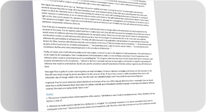 Paradox of Self-Amendment by Peter Suber subject of the sentence may be replaced by the name "Earth" without loss of meaning or truth-value. Let us call the sentence "this very statement is false" by the name "TVSIF", its acronym. By substituting the name of the subject for its description we get "TVSIF is false". But within the name "TVSIF" there is a reference to TVSIF that should be replaceable by "TVSIF", giving us "TVSIF-IF is false". But the subject of the latter sentence also contains a description that should be replaceable by a name, giving us "TVSIF-IF-IF is false", and so on ad infinitum. The referent of these sentences is not a thing but an infinite path to a thing which eternally eludes determination. As Ross says, "one is never told what proposition is subject to the qualification of being false."[Note 10] In a miracle of conciseness Hart calls the resulting infinite regress an "asymptotic stutter."[Note 11] We can certainly cavil with Ross's conclusion here. If "TVSIF" is a name, there is no reason to interpret its first three letters as another description requiring replacement by a name. But if we do, and meaning requires the subject of a sentence to be replaceable by a name (another contestable principle), then TVSIF is meaningless. The reason the very last sentence is meaningful, however, is that it refers irreflexively to meaning and to TVSIF, not directly to itself or solely to something (TVSIF) with no fixed name-replacement. Hart argues that sentences which say, e.g. "Nothing in this section shall be amended, including this section" are meaningful, even by Ross's standard, because they refer to things other than themselves as well as to themselves.[Note 12] By referring to something other than itself, with respect to which the referential series is finite and terminating, the sentence has made itself something determinate as opposed to an asymptotic stutter; because it is determinate, it can be referred to by an auxiliary self-reference that will therefore have a determinate referent. Hart is clearly right on this. Ross cannot answer him, and when he tries to respond to critics who urge the meaningfulness and harmlessness of sentences such as "this sentence is in English", Ross's response is to modify his flat ban on self-reference until it forbids only those self-referential sentences without additional, completeable references.[Note 13] Even if the ban on asymptotic stutters should stand, Ross's qualified prohibition no longer affects self-amendment and may be ignored for the purposes of this essay. If an AC explicitly said of itself that it could amend itself, that self-reference would be meaningful because the rest of the AC would consist of irreflexive references that would prevent the asymptotic stutter. This is true a fortiori when the AC is silent on self-applicability, and therefore contains no self-reference and is simply applied to itself. In this respect it is noteworthy that no AC I have ever seen explicitly addresses the permissibility of self-application. The only self-reference in ACs that could affect self-amendment is in entrenchment clauses (see Section 9). Other, harmless self-reference abounds, such as clauses on the lines of "this Constitution may be amended by...", "all amendments shall be parts of this Constitution for all intents and purposes...", "no convention called under this Article may be limited...", "no amendment to this Constitution shall be valid unless adopted pursuant to the procedures of this Article...." Finally, of course, even if self-reference makes an AC meaningless, it may still be used in the adoption of valid amendments. If the self-reference in an AC made the AC meaningless, then it would prevent self-amendment as well as normal irreflexive amendment. One of the premises in the inference which results in amendment would say something like, "The Congress, whenever two-thirds of both Houses shall deem it necessary, shall propose amendments to this Constitution..." (Article V). By Ross's standards that may be meaningless, and therefore incapable of grounding the inference that results in amended law. But ACs are used for amendment and self-amendment all the time without regard to any self-reference in them. Here again Ross is guilty of a priori reasoning about an empirical subject. As long as legislators and judges and citizens can find meaning in an AC, they will have found enough to permit amendment for the purposes of law. If courts never prevent or nullify amendments that rely on self- referential rules of change, which is the case, then the latter are undoubtedly legal, even if they shock the conscience of logicians. In general, if we let courts determine what is lawful and let scholars and lay users of the language determine what is meaningful, then we should never face a conflict between them. Even when the scholars and folk agree that judicially validated language is meaningless (probably for different reasons), the courts are saying merely "but it is law." Notes 1. This account is based on Ross's fullest exposition of the paradox, "Self-Reference and a Puzzle in Constitutional Law," Mind, 78 (1969) 1-24. See Section 1, note 17. 2. Inferences by modus ponens take the form, [(A B).A] B, or, in English, "if a conditional statement is true, and its antecedent is true, then its consequent is also true." Inferences by modus ponens are demonstrably valid. Therefore, when their premises are true, their conclusions must be true. 3. H.L.A. Hart, The Concept of Law, Oxford University Press, 1961, p. 146. 4. Quoted in Montaigne, "Apology for Raymond Sebond," The Complete Essays of Montaigne (Original 1580, 1588), trans. Donald M. Frame, Stanford University Press, 1958, at p. 393. 5. Richard II, Act IV, Scene 1, lines 203-210. David Hume uses a similar view of royal sovereignty as an analogy to the self-subversion of reason: 27