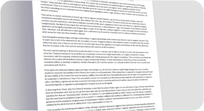 Paradox of Self-Amendment by Peter Suber I have argued that formal logic has very limited application in law, but not that a dissolution of the legal form of the paradox is strictly impossible by logical criteria. Hence I admit —without the same earnestness of hope— that there may well be a dissolution of the paradox satisfactory to formal logic. All I have argued is (1) that the obvious attempts at such dissolution fail, and (2) that in any case law can dispense with such a dissolution. The second point is the more important thesis, and stands (if it stands at all) even if a satisfactory logical dissolution should be discovered tomorrow. In this sense the state of self-amendment today is analogous to the state of calculus between Leibniz and Weierstrass. There may be a way to render it coherent and consistent, but so far we lack the theory to do so. Meantime we use it with good results. The difference is that a coherent theory of self-amendment is unnecessary for law, while a coherent theory of the calculus was vitally necessary for mathematics. If self-amendment would be logically impeccable if only certain niceties were observed in rewording the clause and in transacting its self-change, then a legal system may still ignore those niceties utterly. This remains the case whether the required changes are ingeniously simple or hideously complex. Today lawmakers listen to what logicians say they should do only to the extent that logicians form a weighty voting bloc in their constituencies. There is no reason to think that their lawmaking acts will cease to be valid if the logicians should one day become correct, any more than those lawmaking acts are invalidated when the weightier loyal opposition is correct. Legal validity is a matter of power and social practice, not abstract correctness. There will be no solution satisfactory to formal logic if formal logic bars all self-reference, say, by incorporating a theory of types, and if self- amendment unavoidably requires self-reference. Ross believes this is the case, but has been followed in this by only one commentator,[Note 3] and then only with reservations. Hart[Note 4] leads the opponents of this view in arguing that at least some self-reference is logically and legally unobjectionable. Raz[Note 5] even argues that self-reference is unnecessary in self-amendment. I argue that examples of self-reference and self- application can be legally acceptable, even if meaningless to some formal logicians, so long as legislators, voters, and judges find some meaning in them. Moreover, if all self-reference is meaningless, then a self-referential AC would be unavailable even for ordinary, irreflexive amendment, which proves far more than Ross intended or desired. Ross distinguishes between logical and legal contradictions. A logical contradiction exists between any statement and its negation. We don't have to assert one or both of the statements for the contradiction to exist. A legal contradiction exists between any two inconsistent laws that are both valid at the same time. If they are not both valid at the same time, they will be logically but not legally contradictory. Armed with this distinction, Ross has an answer to the most common attempt to dissolve the paradox of self-amendment. The most common attempt to dissolve the paradox has been to insure, or assume, that the old and new ACs are never valid and supreme at the same time. Temporal overlap can be prevented; but preventing it merely avoids a legal contradiction, not a logical contradiction. It keeps inconsistent rules from enjoying simultaneous legal validity, but thereby presupposes their logical inconsistency. That inconsistency invalidates the inference that models self-amendment because a logical contradiction between premise and conclusion (when the premises are internally consistent) suffices to invalidate a deduction. As Ross often puts it, the invalidity consists in our attempt to derive from one norm a second norm inconsistent with the first. If one rejects the distinction between logical and legal contradiction, but still holds the inference model of legal change, then one is no better situated to overcome the invalidity of the inference that models the self-amendment. If the contradiction is supposed to disappear because the old AC loses validity at the moment the new one acquires validity, then in the inference that models this process the assertion of a key premise must be suspended in mid-inference. Even if this successfully removes the inconsistency in the inference that models the self-amendment, it replaces it with a new fallacy. Logicians do not have a name for this fallacy because it cannot be performed in ordinary argument where the inference (conceived logically, as opposed to psychologically) is instantaneous or non-temporal. In discussing Ross's thesis, John Finnis[Note 6] introduces a term that helps here. If some legal rules are valid only as long as the laws that authorize them are themselves valid, then we can say that those legal rules are routinely validated; if some rules are valid even after their authorities are repealed, then they are "transtemporally" validated. For example, if a court holds its jurisdiction under a statute, and if the statute is repealed, then the court loses its jurisdiction (ceases to be a court) if it is routinely validated, but continues unaffected if it is transtemporally validated. In general we will be tempted to recognize cases of transtemporal validation wherever self-amendment seems to occur, e.g. when a new AC is validated by the old AC that lost its validity when it was superseded by the new one. I take no position the transtemporal validation of law, although superficial observation suggests that some laws are transtemporally validated and others are not. Ross argues that transtemporal validation is illogical, hence impossible, and yet is logically required for strict self-amendment. His reason for rejecting transtempo