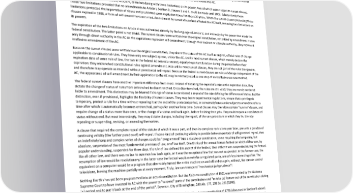 Paradox of Self-Amendment by Peter Suber Section 14: Amendment by Sunset Clause A. Sunset clauses in American constitutions A constitutional provision could say of itself that it automatically expires at a certain date. Because repeal is a form of amendment, such "sunset clauses" are effective rules of amendment. If an AC is used to adopt a new rule with a sunset clause, then the subsequent expiration (repeal) of the rule may be said to have been authorized by the AC. But I prefer to say that it was directly authorized by the sunset clause, a valid constitutional rule in its own right, and indirectly authorized by the AC. This usage is consistent with present practice, for we say that an existing constitutional amendment, for example, is authorized by the AC, not (except indirectly) by the authority that authorized the AC. The AC of the federal constitution, Article V, came into being with three limitations on its power, two of which were subject to sunset clauses. Those two limitations provided that no amendments to Article I, Section 9, clauses 1 and 4, could be made until 1808. Substantively these limitations protected the importation of slaves and prohibited some capitation taxes for about 20 years. When the sunset clauses protecting these clauses expired in 1808, a form of self-amendment occurred. Amendment by sunset clause had affected the AC itself, removing two limitations on its powers. The expiration of the two limitations on Article V was authorized directly by the language of Article V, and indirectly by the power that made the federal constitution. The latter point is not trivial. The sunset clauses were written into the original constitution, not added by amendment. Hence only through direct authority in the AC do the expirations represent self-amendment; through their indirect or ultimate authority, they represent irreflexive amendment of the AC. Because the sunset clauses were written into the original constitution, they share the status of the AC itself as original, official rules of change applicable to constitutional rules. They have only one subject apiece, unlike the AC. Unlike most sunset clauses, which merely declare the expiration date of some rule of law, the two in the federal AC served a second, equally important function during the period before their expiration: they entrenched constitutional rules against amendment. Also unlike most sunset clauses, they are not part of the rules they govern, and therefore may operate as intended without paradoxical self-repeal. Because the federal sunset clauses are rules of change independent of the AC, the appearance of self-amendment in their application to the AC may be reinterpreted as one step of an irreflexive see-saw method. The federal sunset clauses have another important difference from most: instead of dictating the repeal of a rule at the expiration date, they dictate the change of status of rules from entrenched to disentrenched. Once disentrenched, the rules are still valid; they are merely rendered liable to amendment. This distinction may be blurred if change of status is considered a repeal of the rule defining the difference of status. But the distinction, even if provisional, highlights the flexibility of sunset clauses. They may doom experimental regulations, ensure that a privilege is temporary, protect a rule for a time without repealing it at the end of the protected period, or conversely leave a rule subject to amendment for a time after which it automatically becomes entrenched, perhaps for another finite time. Sunset clauses may therefore contain "sunrise" clauses, and require change of a status more than once, or the change of a status and back again, before finishing their jobs. They could require an oscillation of status without end. But most interestingly, they may dictate changes, including the repeal, of the very provisions in which they lie, thereby repealing or suspending, reviving, or amending themselves. A clause that required the complete repeal of the statute of which it was a part, and then its complete revival one year later, presents a paradox of continuing validity (the further paradox of) self-repeal. If some kind of continuing validity is possible between periods of self-governed repeal, then an indefinitely long and complex series of changes could be "programmed" into a statute or constitution, some requiring the temporary, but absolute, suspension of the most fundamental premises of law, or of law itself. One thinks of the annual Roman festival on which all law was, by popular understanding, suspended for three days. If a rule of law defined this aspect of the festival, then either it was suspended during the festival like all other law, and there was no law to summon law back again, or it was the exceptional law that was not suspended. In the former case, the resumption of law would be revolutionary; in the latter case the festival would merely be a regulated party, a much less interesting affair. The equivalent on a computer would be a program that alternately turned the entire machine on and off and on again, without, like remote control televisions, leaving the machine partially on at every moment. Truly, law can transcend "mechanical jurisprudence"! Nothing like this has yet been programmed into an actual constitution. But the Alabama constitution of 1901 was interpreted by the Alabama Supreme Court to have invested its AC with the power to "suspend" parts of the constitution and "to take [a] feature out of the constitution during [a] period and to put it back at the end of the period". Downs v. City of Birmingham, 240 Ala. 177, 198 So. 231 (1940). The most comprehensive sort of reflexive sunset clause might be a clause of the New Jersey constitution of 1776 (discussed in Section 9 above) which conditionally nullified the entire constitution of which it was a part, if and when the colonies reconciled with England. Can we imagine an even more comprehensive clause —one that