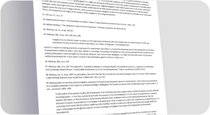 Paradox of Self-Amendment by Peter Suber 27. Uhl, op. cit., at p. 18. 28. Uhl, ibid., at p. 19. 29. Orfield's discussion is superior to Uhl's chiefly in its clarity on this question. Orfield unambiguously believes that the sovereign amending power is the power of the people's elected agents, not that of the people themselves or of the government. See Orfield, op. cit., at pp. 102, 124, 138, 141f, 143, 148. 30. Why this should be so is not often stated clearly. The Tenth Amendment does not assume that the delegated powers are limited or limitable, only that the undelegated powers will not be exercised or usurped. The ultimate rationale is probably that the federal government is limited and has only those powers expressly and impliedly given to it, unlike the state governments which have all the powers not expressly or impliedly denied to them. But even this rationale cannot explain why a power expressly or impliedly delegated to the federal government could not be unlimited or illimitable, unless we imagine that one unlimited power could make all the other powers unlimited. Another possible theory is that the people alegally retain the sources of all legal authority, which prevents any power delegated by them from being unlimited or illimitable, even state power. That is, the acceptance and usage, or the consent, of the people has continuing omnipotence. 31. Uhl, op. cit., at p. 17. 32. Edward Samuel Corwin, The Constitution and What It Means Today, Princeton University Press, third ed., 1924, p. 88. 33. William Marbury, "The Limitations Upon the Amending Power," Harvard Law Review, 33 (1919) 223-35. 34. Marbury, op. cit., at pp. 226-28. 35. Marbury, ibib., at pp. 224, 228. At p. 228: Congress has no inherent power to adopt, and the legislatures of three fourths of the States have no inherent power to ratify, any amendment to the Constitution of the United States, and make it binding upon nonassenting States. Article V is explicit in making unanimity unnecessary for amendment, and makes no provision for dissenting states to be exempted from the effect of amendments ratified by others. Here, then, Marbury is no longer interpreting the constitution, but only complaining from the standpoint of his political philosophy or what he might call natural law. However, even from his own standpoint, one might find that state assent to all properly ratified amendments lies in each state's consent to the constitution upon its admission to the union. 36. Marbury, ibid., at p. 229. 37. Marbury, ibid., at p. 229. This argument is repeated, including the conclusion that the Nineteenth Amendment is "legislative" and therefore void, by George Stewart Brown, "Irresponsible Government by Constitutional Amendment," Virginia Law Review, 8 (1922) 157-66. 38. Marbury, op. cit. at pp. 230f. He particularly notes that if the Civil War Amendments had been challenged closer to the times of their adoption, a right-thinking Supreme Court would have nullified them. Ibid. at p. 231. 39. Marbury does not say why state prerogatives supersede the federal amending power except to cite the framers' intent without documentation. He is probably vulnerable to this objection by Westell Woodbury Willoughby, The Constitutional Law of the United States, Baker, Voorhis and Co., 3 vols., second ed. 1929, I:599: To the author of the present treatise, the fundamental error of all those who have sought to place inherent limitations upon the [federal] amending power...is that they necessarily start with the assumption that the Constitution is in the nature of an agreement or compact between the States, or that it implies an understanding between them, or between them and the National Government, that the allocation of powers as provided for in the original instrument shall not be changed in any of its more important or essential features. It is surprising to this writer that this theory, which since the Civil War, has been so decisively rejected by the American people and by the courts, should again be brought to support a constitutional argument [against the validity of the Eighteenth and Nineteenth Amendments]. Note that the only court to strike down a ratified amendment to the federal constitution appealed to the view of the constitution as a pact or treaty among the states. U.S. v. Sprague, 44 F.2d 967 (1930) (striking down the Eighteenth (Prohibition) Amendment), reversed 282 U.S. 716 (1931). See Section 16 for more discussion of the Sprague case. 40. George B. Skinner also believes that some state powers, particularly the police powers, are inalienable and cannot be abolished or shifted to the federal government even with state consent. George B. Skinner, "Intrinsic Limitations on the Power of Constitutional Amendment," Michigan Law Review, 18 (1919) 213. Skinner bases his argument on the Ninth and Tenth Amendments, not the intent of the framers of Article V. He concludes that the Eighteenth (Prohibition) Amendment is void. See Section 16. 56