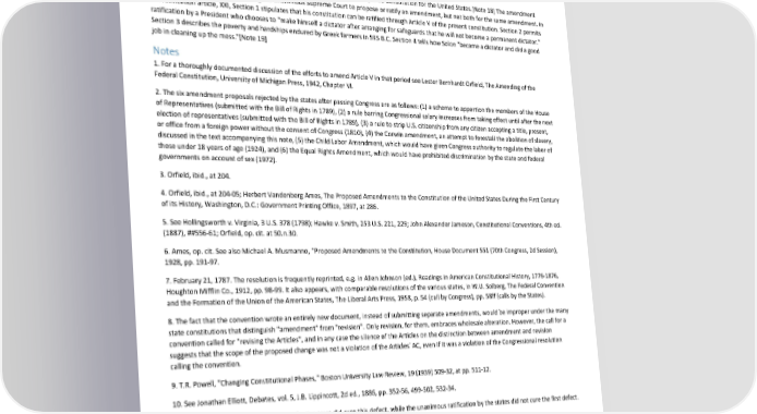 Paradox of Self-Amendment by Peter Suber Another well-considered alternative, presented as a series of criticisms and suggestions rather than as a proposed draft, is William MacDonald's A New Constitution for a New America.[Note 15] He proposes vast changes in the constitution, but no new amendment clause. However, he believes the present Article V is inadequate to accomplish the enormous task he contemplates, and breaks new ground by suggesting that the authority may be found in the Declaration of Independence for a "right of the people to abolish it [their form of government] and to institute a new government, laying its foundations on such principles and organizing its powers in such form as to them shall seem most likely to effect their safety and happiness."[Note 16] This right is not abstract or merely rhetorical, he believes, but may support a call for a constitutional convention, though the need for it is surely based on a misinterpretation of the power of the present Article V.[Note 17] An example of a less reflective work is provided by William Gardiner in A Proposed Constitution for the United States.[Note 18] The amendment clause, Article XX, is novel in allowing the unanimous Supreme Court to propose or ratify an amendment, but not both for the same amendment. In the ratification article, XXI, Section 1 stipulates that his constitution can be ratified through Article V of the present constitution. Section 2 permits ratification by a President who chooses to "make himself a dictator after arranging for safeguards that he will not become a permanent dictator." Section 3 describes the poverty and hardships endured by Greek farmers in 595 B.C. Section 4 tells how Solon "became a dictator and did a good job in cleaning up the mess."[Note 19] Notes 1. For a thoroughly documented discussion of the efforts to amend Article V in that period see Lester Bernhardt Orfield, The Amending of the Federal Constitution, University of Michigan Press, 1942, Chapter VI. 2. The six amendment proposals rejected by the states after passing Congress are as follows: (1) a scheme to apportion the members of the House of Representatives (submitted with the Bill of Rights in 1789), (2) a rule barring Congressional salary increases from taking effect until after the next election of representatives (submitted with the Bill of Rights in 1789), (3) a rule to strip U.S. citizenship from any citizen accepting a title, present, or office from a foreign power without the consent of Congress (1810), (4) the Corwin amendment, an attempt to forestall the abolition of slavery, discussed in the text accompanying this note, (5) the Child Labor Amendment, which would have given Congress authority to regulate the labor of those under 18 years of age (1924), and (6) the Equal Rights Amendment, which would have prohibited discrimination by the state and federal governments on account of sex (1972). 3. Orfield, ibid., at 204. 4. Orfield, ibid., at 204-05; Herbert Vandenberg Ames, The Proposed Amendments to the Constitution of the United States During the First Century of its History, Washington, D.C.: Government Printing Office, 1897, at 286. 5. See Hollingsworth v. Virginia, 3 U.S. 378 (1798); Hawke v. Smith, 253 U.S. 221, 229; John Alexander Jameson, Constitutional Conventions, 4th ed. (1887), ##556-61; Orfield, op. cit. at 50.n.30. 6. Ames, op. cit. See also Michael A. Musmanno, "Proposed Amendments to the Constitution, House Document 551 (70th Congress, 2d Session), 1928, pp. 191-97. 7. February 21, 1787. The resolution is frequently reprinted, e.g. in Allen Johnson (ed.), Readings in American Constitutional History, 1776-1876, Houghton Mifflin Co., 1912, pp. 98-99. It also appears, with comparable resolutions of the various states, in W.U. Solberg, The Federal Convention and the Formation of the Union of the American States, The Liberal Arts Press, 1958, p. 54 (call by Congress), pp. 58ff (calls by the States). 8. The fact that the convention wrote an entirely new document, instead of submitting separate amendments, would be improper under the many state constitutions that distinguish "amendment" from "revision". Only revision, for them, embraces wholesale alteration. However, the call for a convention called for "revising the Articles", and in any case the silence of the Articles on the distinction between amendment and revision suggests that the scope of the proposed change was not a violation of the Articles' AC, even if it was a violation of the Congressional resolution calling the convention. 9. T.R. Powell, "Changing Constitutional Phases," Boston University Law Review, 19 (1939) 509-32, at pp. 511-12. 10. See Jonathan Elliott, Debates, vol. 5, J.B. Lippincott, 2d ed., 1886, pp. 352-56, 499-502, 532-34. 11. Orfield believes that the ratification by Congress did cure this defect, while the unanimous ratification by the states did not cure the first defect. Op. cit., at 147. 12. John Alexander Jameson, Constitutional Conventions, Callahan and Co., 4th ed., 1887, #564, p. 596. 13. The best discussion of the suggestions by jurists up to 1942 is Orfield's Chapter VI, op. cit. 14. Her constitution first appeared in Woodhull and Claflin's Weekly for February 10, 1872, and has been reprinted in Philip S. Foner (ed.), We, The Other People, University of Illinois Press, 1976, pp. 180-201. 15. William MacDonald, A New Constitution for a New America, B.W. Huebsch, 1921. 176