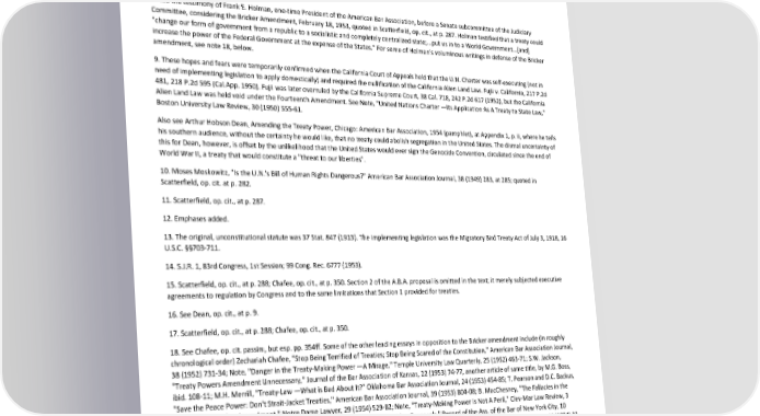 Paradox of Self-Amendment by Peter Suber into what Hart would call "open texture" —the uncertain fringe of determinate rules, where alternatives are left open by the generality of language or the paucity and ambiguity of preexisting authority. See H.L.A. Hart, The Concept of Law, Oxford University Press, 1961, at pp. 124ff. 5. On amendment by reinterpretation, see Section 13. See also Note, "Judicial Review and the Growth of the Treaty Power," Syracuse Law Review, 3 (1952) 315-33. 6. Chafee does not believe this is a case of a treaty violating or amending the constitution, but he says it is the closest case he has seen. Chafee, op. cit., at p. 354. 7. See Scatterfield, op. cit., at pp. 283-287. 8. See the testimony of Frank E. Holman, one-time President of the American Bar Association, before a Senate subcommittee of the Judiciary Committee, considering the Bricker Amendment, February 18, 1953, quoted in Scatterfield, op. cit., at p. 287. Holman testified that a treaty could "change our form of government from a republic to a socialistic and completely centralized state;...put us in to a World Government...[and] increase the power of the Federal Government at the expense of the States." For some of Holman's voluminous writings in defense of the Bricker amendment, see note 18, below. 9. These hopes and fears were temporarily confirmed when the California Court of Appeals held that the U.N. Charter was self-executing (not in need of implementing legislation to apply domestically) and required the nullification of the California Alien Land Law. Fujii v. California, 217 P.2d 481, 218 P.2d 595 (Cal.App. 1950). Fujii was later overruled by the California Supreme Court, 38 Cal. 718, 242 P.2d 617 (1952), but the California Alien Land Law was held void under the Fourteenth Amendment. See Note, "United Nations Charter —Its Application As A Treaty to State Law," Boston University Law Review, 30 (1950) 555-61. Also see Arthur Hobson Dean, Amending the Treaty Power, Chicago: American Bar Association, 1954 (pamphlet), at Appendix 1, p. ii, where he tells his southern audience, without the certainty he would like, that no treaty could abolish segregation in the United States. The dismal uncertainty of this for Dean, however, is offset by the unlikelihood that the United States would ever sign the Genocide Convention, circulated since the end of World War II, a treaty that would constitute a "threat to our liberties". 10. Moses Moskowitz, "Is the U.N.'s Bill of Human Rights Dangerous?" American Bar Association Journal, 38 (1949) 283, at 285; quoted in Scatterfield, op. cit. at p. 282. 11. Scatterfield, op. cit., at p. 287. 12. Emphases added. 13. The original, unconstitutional statute was 37 Stat. 847 (1913). The implementing legislation was the Migratory Bird Treaty Act of July 3, 1918, 16 U.S.C. §§703-711. 14. S.J.R. 1, 83rd Congress, 1st Session; 99 Cong. Rec. 6777 (1953). 15. Scatterfield, op. cit., at p. 288; Chafee, op. cit., at p. 350. Section 2 of the A.B.A. proposal is omitted in the text; it merely subjected executive agreements to regulation by Congress and to the same limitations that Section 1 provided for treaties. 16. See Dean, op. cit., at p. 9. 17. Scatterfield, op. cit., at p. 288; Chafee, op. cit., at p. 350. 18. See Chafee, op. cit. passim, but esp. pp. 354ff. Some of the other leading essays in opposition to the Bricker amendment include (in roughly chronological order) Zechariah Chafee, "Stop Being Terrified of Treaties; Stop Being Scared of the Constitution," American Bar Association Journal, 38 (1952) 731-34; Note, "Danger in the Treaty-Making Power —A Mirage," Temple University Law Quarterly, 25 (1952) 463-71; S.W. Jackson, "Treaty Powers Amendment Unnecessary," Journal of the Bar Association of Kansas, 22 (1953) 74-77, another article of same title, by M.G. Boss, ibid. 108-11; M.H. Merrill, "Treaty-Law —What is Bad About It?" Oklahoma Bar Association Journal, 24 (1953) 454-85; T. Pearson and D.C. Backus, "Save the Peace Power: Don't Strait-Jacket Treaties," American Bar Association Journal, 39 (1953) 804-08; B. MacChesney, "The Fallacies in the Case for the Bricker Amendment," Notre Dame Lawyer, 29 (1954) 529-82; Note, "Treaty-Making Power Is Not A Peril," Clev-Mar Law Review, 3 (1954) 74-84; Note, "Continued Defense of the Constitution Against the Bricker Proposals," Record of the Ass. of the Bar of New York City, 10 (1955) 114-42; and J.B. White and J.E. Fowler, "Bricker Amendment —Fallacies and Dangers," American Journal of International Law, 48 (1954) 23- 56. Some of the leading essays in support of the Bricker amendment include (in roughly chronological order) F.E. Holman, "Treaty Law-Making," American Bar Association Journal, 36 (1950) 707-10, 787; E.P. Deutsch, "The Peril in the Treaty-Making Clause," American Bar Association Journal, 37 (1951) 659; J.W. Bricker, "Amending the Treaty-Making Power: Pro and Con. Safeguarding the Treaty Power," Federal Bar Journal, 13 (1952) 77- 98; F.E. Holman, "Treaty Law —A Threat to American Rights," Journal of the Bar Ass. of Kansas, 20 (1952) 253-63; E.P. Deutsch, "Legislation By Treaty," Michigan State Bar Journal, 31 (1952) 19-25; G.A. Finch, "Treaty-Clause Amendment: The Case for the Association," American Bar Association Journal, 38 (1952) 467-70, 527-30; E.P. Deutsch, "Need for a Treaty Amendment, Restatement and Reply," American Bar Association 122
