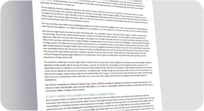 Paradox of Self-Amendment by Peter Suber law. All rules deducible from those premises would already be law, although perhaps tacitly, and no rules not so deducible could be made law. New enactments could only make explicit that which was already law implicitly. If a proposed rule were not a strict implication of existing rules, then it could not be inferred from them and therefore could not be enacted. From any initial position, therefore, all possible law is already actual, even if we do not know it yet, just as "Socrates is mortal" is already implied when we have asserted "All humans are mortal" and "Socrates is human". But this absurdity will be avoided by a strict inference model —in the name of a greater absurdity. Law is only changeless if there is law. But a strict inference model implies that there is no law. If legal validity requires that a law be the conclusion of a valid inference in which the premises are already existing valid laws, then we may say more briefly that every valid law is derived from prior valid law. We can take what appears to be present law and locate its authorizing antecedents, but those antecedents are only valid if they have their own valid premises, and so on in an infinite regress. If we allow no exceptions in the inference model, then no rule in the history of authority can be self-validating or validated by an alegal source. The only alternative is an infinite regress of authorities; every valid law requires an infinite genealogy. But no law has an infinite genealogy. Therefore there is no valid law. The exceptionless inference model must say either that there is no law, or if there is, that it is all immutable. It is no accident that this is what systems of formal logic must say about logical theorems, for Ross reduces legal validity to logical validity. If every step of every inference must be concluded from premises in a prior inference, then we cannot begin with axioms because they have no antecedent authority. Hence we fall into an infinite regress. But if we do begin with axioms, then once the rules of inference are specified, all permissible conclusions are instantly determined, even if human beings never finish discovering what they are. We may avoid these absurdities only by admitting exceptions in the inference model as applied to law. These may take the form of self-validation, which Ross directly opposes, or an alegal and alogical source of authority, such as acceptance, for at least some rules, which he indirectly opposes. Note that the alegal source of authority can be many things other than acceptance, such as moral law, military might, or divine command. But it cannot be logic. Ross and the legal formalists represent a new form of natural law theory: one that rests the validity of civic or positive law on logical law rather than moral law. But if formal logic is the alegal source of authority for law, then we encounter the dilemma that laws are only as valid as their premises, and these either recede infinitely or toward some exceptional premise that is self-validating or validated outside the logical and legal systems. This dilemma does not confront the moral version of natural law theory, or an acceptance theory, because these do not make legal validity depend on the logical validity of an inference; hence the pedigree of premises may stop at any point. Natural law theorists and others may nevertheless fall into the trap by searching for the authority of fundamental laws as if for premises of conclusions; but they need not do this. They may say that legal validity comes from moral law, period, or from acceptance, period. If they defend this claim with premises, they will confront the age-old epistemological dilemma of circularity versus infinite regress, but this affects only their theory, like any theory, not the phenomenon of legal validity itself. The acceptance model does not allow logical rules to interfere with processes determined by legal rules and supervised by mortal judges. Whatever legislators and the people make in the way of new law is new law, if it satisfies the mortal judges and the people themselves; whatever is not regarded by anyone as valid law is not valid law even if it follows infallibly from rules that are accepted as valid law.[Note 9] New law must conform to the rules of making new law, but this conformity is not determined in ideality by logicians reducing the rules to some core of univocal purity. It is determined by judges using a complex web of non-formal methods. While judges try to follow both prior law and their own notions of eternal logic, their errors are as authoritative as their other decisions, unless some other judges overturn them or acceptance wanes through neglect or disobedience. The inference model blurs the distinction between logic and law, while the acceptance model blurs the distinction between law and history. The inference model subtly identifies logical and with legal validity, or contradiction and illegality, while the acceptance model subtly identifies de jure and de facto validity, or legality and acceptance. B. Ross's solution: the invisible, immutable amendment clause Ross concludes that the contradiction of self-amendment means that valid amendments to ACs cannot derive their authority from the ACs themselves. Either they are merely accepted, which to Ross is to be legally unauthorized and invalid, or they derive their authority from a tacit rule transcending the constitution posited to validate precisely such changes. Logically Ross has no grounds to choose between these options, but he prefers the second, as if acknowledging that amendments to ACs do occur (which he never explicitly admits) and must be explained. Hence, attempts to amend an AC are not invalid exercises in futility, but neither when they succeed are they cases of self-amendment. Amendments to ACs derive their authority from a tacit rule, transcending the legal system, which states that the AC may be used 