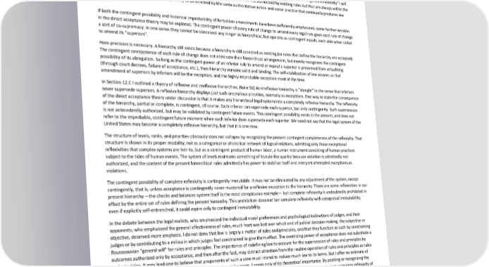 Paradox of Self-Amendment by Peter Suber indifferent or shaken, and where the content of law is unclear or vacillating. In the expansive range of ordinary cases the provisions and social support of present law reinforce the grip of present law and assure us that the wilder contingencies remain mere theoretical possibilities. A word on the ambiguity of "contingency" may be in order. I have been speaking of contingent absurdities; but of course even the most ordinary legal enactments and decisions are also contingent. The difference is that the former are not authorized by the existing rules, while the latter are. In the former case the alegal source of legal authority in social acceptance overrules or amends the existing rules, and in the latter case this is not necessary. So while it is "possible" that the law will be obeyed, and "possible" that it will be violated in a way that brings curing acceptance with it, these are two distinct senses of possibility (hence, of contingency). In the phrases "contingent omnipotence" and "contingent immutability" I will use the latter sense. These, then, are an omnipotence and an immutability that are not authorized by existing rules but that are always within the horizon of human, historical possibility, ready to be effected by the same authoritative action and social practice that continually produces law itself. If both the contingent possibility and historical improbability of forbidden amendments have been sufficiently emphasized, some further wrinkles in the direct acceptance theory may be explored. The contingent power of every rule of change to amend every legal rule gives each rule of change a sort of co-supremacy. In one sense they cannot be conceived any longer as hierarchical, but operate as contingent equals, each able when called to amend its "superiors". Here precision is necessary. A hierarchy still exists because a hierarchy is still accepted as existing (or rules that define the hierarchy are accepted). The contingent omnipotence of each rule of change does not eliminate their hierarchical arrangement, but merely recognizes the contingent possibility of its abrogation. So long as the contingent power of an inferior rule to amend or repeal a superior is prevented from actualizing (through court decrees, failure of acceptance, etc.), then hierarchy remains valid and binding. The self-stabilization of law assures us that amendment of superiors by inferiors will be the exception, and the highly improbable exception most of the time. In Section 12.C I outlined a theory of reflexive and irreflexive hierarchies.[Note 36] An irreflexive hierarchy is "straight" in the sense that inferiors never supersede superiors. A reflexive hierarchy displays just such anomalous priorities, normally as exceptions. One way to state the consequence of the direct acceptance theory under discussion is that it makes any hierarchical legal system into a completely reflexive hierarchy. The reflexivity of the hierarchy, partial or complete, is contingent, of course. Each inferior can supersede each superior, but only contingently. Such supersession is not antecedently authorized, but may be validated by contingent future events. This contingent possibility exists in the present, and does not refer to the improbable, contingent future moment when each inferior does supersede each superior. We need not say that the legal system of the United States may become a completely reflexive hierarchy, but that it is one now. The structure of levels, ranks, and priorities obviously does not collapse by recognizing the present contingent completeness of the reflexivity. That structure is shown in its proper modality, not as a categorical or ahistorical network of logical relations, admitting only those exceptional reflexivities that complex systems are heir to, but as a contingent product of human labor, a human instrument consisting of human practices subject to the tides of human events. The system of levels maintains something of its rule-like quality because violation is admittedly not authorized, and the content of the present hierarchical rules admittedly has power to stabilize itself and interpret attempted exceptions as violations. The contingent possibility of complete reflexivity is contingently immutable. It may not be eliminated by any adjustment of the system, except contingently, that is, unless acceptance is contingently never mustered for a reflexive exception to the hierarchy. There are some reflexivities in our present hierarchy —the checks and balances system itself is the most conspicuous example— but complete reflexivity is undoubtedly prohibited in effect by the entire set of rules defining the present hierarchy. This prohibition does not bar complete reflexivity with categorical immutability; even if explicitly self-entrenched, it could aspire only to contingent immutability. In the debate between the legal realists, who emphasized the individual moral preferences and psychological inclinations of judges, and their opponents, who emphasized the general effectiveness of rules, much heat was lost over which end of judicial decision-making, the subjective or objective, deserved more emphasis. I do not deny that law is largely a matter of rules and principles, and that they function as such by constraining judges or by contributing to a milieu in which judges feel constrained to give them effect. The overriding power of acceptance does not substitute a Rousseauvian "general will" for rules and principles. The importance of redefining law to account for the supersession of rules and principles by outcomes authorized only by acceptance, and then after the fact, may distract attention from the routine operation of rules and principles as rules and principles. It may lead one to believe that proponents of such a view must intend to reduce much law to its terms. But I offer no estimate of the frequency of such supersession except to say that it is not the nor