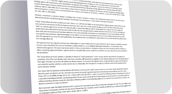 Paradox of Self-Amendment by Peter Suber Despite what Hoffman and Temple make perfectly clear, this rule about self-incrimination does not extend to a president's claim of "executive privilege". Richard Nixon lost his argument that executive privilege was his for the asking, and that no court could inquire into its propriety or use compulsory process to investigate its justification. Nixon v. Sirica, 487 F.2d 700, 708-16 (D.C.Cir. 1973). Witnesses may be required to testify to enough contextual information for the court to decide whether the invocation of the privilege against self- incrimination is justified. Judge Learned Hand noted the paradox of this in U.S. v. Weisman, 111 F.2d 260, 261-62 (2d Cir. 1940): "Logically, indeed, [the witness] is boxed in a paradox, for he must prove the criminatory character of what it is his privilege to protect because it it criminatory."[Note 33] In principle courts can limit the privilege to those questions which, if answered truthfully, could yield self-incriminating testimony. But in practice they rarely do so, for to make this a regular practice would encourage prosecutors and jurors to infer criminality from the invocation of the privilege against self-incrimination, which would defeat the purpose of the privilege. It is difficult to prevent the inference of criminality; at least counsel cannot argue to the jury that the witness has incriminated herself by invoking the privilege against self-incrimination.[Note 34] Griffin v. California, 380 U.S. 609 (1965). But if a man made a contract with his employer not to disgrace the company, and then invoked the privilege against self-incrimination in a court, a jury can decide whether the invocation was a breach of the contract. Loew's Inc. v. Cole, 185 F.2d 641 (9th Cir. 1950), cert. den. 340 U.S. 954 (1950). Similarly, a statement to a doctor or lawyer is privileged only if made to the doctor or lawyer in her professional capacity. But this can often not be determined without actually hearing the statement. Nevertheless, the determination is made without hearing the statement. A stark "know before we know" paradox occurred in Matz v. U.S., 158 F.2d 190 (1946). A man prosecuted for bigamy argued in defense that he was only married to one woman; his first marriage was defective, hence void, and only his second marriage was valid. The state offered the second "wife" as a witness against him, but the man objected under a statute disqualifying a wife to testify against her husband. The man's objection would have to be sustained if the woman were really his wife, but that was precisely the question at issue in the trial. For if his first marriage had been valid, then his second would have been defective. Hence the admissibility of evidence on a certain question could not be decided until that very question was answered, requiring the judge to know before he knew. His ruling evaded the vicious circle by substituting a less vicious circle that still required him to know the man's guilt before the trial determined it: he ruled that he, rather than the jury, had to decide the validity of the first marriage.[Note 35] The Supreme Court has original jurisdiction over ambassadors and cases in which states are parties (Article III, §2.2). Suppose a borderline example of such a case came before the Court as if entitled to original jurisdiction, e.g. an allegedly discharged ambassador, or a suit between state administrative agencies. The Court must decide whether it has jurisdiction before it decides the merits, but it can't decide jurisdiction without, in effect, conceding original jurisdiction. Logically similar but less politically dramatic problems can arise for any court, since every court's jurisdiction has boundaries. This "know before we know" problem is solved by the device of "special appearance" in which a court can hear arguments for and against its jurisdiction. Only if the court decides that it does have jurisdiction will the parties be required to make "general appearance" for the adjudication of their rights. This does not prevent all reflexive paradoxes, however. In the case of the Supreme Court's original jurisdiction again, if the borderline case raised the question whether a certain woman was an ambassador, then the question of original jurisdiction could not be decided until the merits had been decided. One reason why the bootstrap doctrine (Section 20.F above) is controversial is that if a person comes to court under special appearance solely to deny the court's jurisdiction over her, the court may convert the special to general appearance and assert general jurisdiction over her. York v. Texas, 137 U.S. 15 (1890); Chicago Life Ins. Co. v. Cherry, 244 U.S.25, 30 (1917). In short, to prevent the reflexivity problem of deciding the merits of a case before deciding jurisdiction, and knowing before it knows, courts use the device of special appearance. But use of it in conjunction with the reflexive bootstrap doctrine creates the alternative reflexivity problem of self-validating judgments of jurisdiction by courts that can, in effect, use dissent as consent to a court's jurisdiction. Bail is excessive under the Eighth Amendment if it is greater than necessary to assure that the defendant will appear for trial. The risk of flight is the major factor in setting bail, and that risk may not be inferred from the indictment, even if it specifies an offense (e.g. conspiracy) that suggests that the defendant is able and likely to flee. Stack v. Boyle, 342 U.S. 1 (1951). An interesting example of a reflexivity that was obviously enacted to avoid a "know before we know" paradox is Federal Rule of Evidence 104 (a). It provides that none of the Federal Rules of Evidence applies to the judge's determination whether offered evidence is sufficiently relevant to be admitted, or whether a witness is qualified or privileged. Without Rule 104 (a), evidence inadmissible under law would have to be admitted so that the 