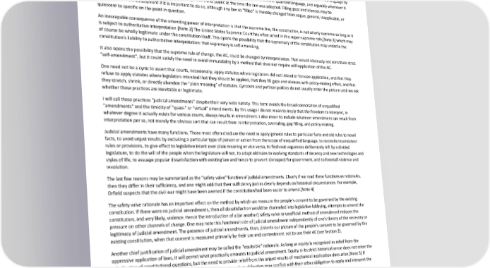 Paradox of Self-Amendment by Peter Suber Section 15: Amendment by Interpretation A. Judicial amendments "Nay, whoever hath an absolute authority to interpret any written or spoken laws", Bishop Hoadly remarked, "it is he who is truly the Law Giver to all intents and purposes, and not the persons who first spoke and wrote them."[Note 1] That interpretation has a law-making effect is indisputable, although many would not take the principle as far as Hoadly did, denying the name of Law Giver even to the legislator. Even more than making law, however, interpretation can amend law, insofar as we distinguish these. Interpretation amends law whenever it qualifies unqualified language by finding an "implied" exception or limitation of scope, whenever it softens or limits qualifications in qualified language, and arguably whenever it departs from the original understanding of the legislators and public at the time the law was adopted. Filling gaps and silences may be distinguished from amendment if it is important to do so, although any law so "filled" is thereby changed from vague, general, inapplicable, or quiescent to specific on the point in question. An inescapable consequence of the amending power of interpretation is that the supreme law, the constitution, is not utterly supreme so long as it is subject to authoritative interpretation.[Note 2] The United States Supreme Court has often acted in this super-supreme role,[Note 3] which may of course be wholly legitimate under the constitution itself. This opens the possibility that the supremacy of the constitution may underlie the constitution's liability to authoritative interpretation: that supremacy is self-amending. It also opens the possibility that the supreme rule of change, the AC, could be changed by interpretation. That would obviously not constitute strict "self-amendment", but it could satisfy the need to avoid immutability by a method that does not require self-application of the AC. One need not be a cynic to assert that courts, occasionally, apply statutes where legislators did not intend or foresee application, and that they refuse to apply statutes where legislators intended that they should be applied, that they fill gaps and silences with policy-making effect, and that they stretch, shrink, or directly abandon the "plain meaning" of statutes. Cynicism and partisan politics do not usually enter the picture until we ask whether these practices are inevitable or legitimate. I will call these practices "judicial amendments" despite their very wide variety. This term avoids the broad connotation of unqualified "amendments" and the timidity of "quasi-" or "virtual" amendments. By this usage I do not mean to imply that the freedom to interpret, in whatever degree it actually exists for various courts, always results in amendment. I also mean to include whatever amendment can result from interpretation per se, not merely the obvious sort that can result from reinterpretation, overruling, gap filling, and policy-making. Judicial amendments have many functions. Those most often cited are the need to apply general rules to particular facts and old rules to novel facts, to avoid unjust results by excluding a particular type of person or action from the scope of unqualified language, to reconcile inconsistent rules or provisions, to give effect to legislative intent over plain meaning or vice versa, to flesh out vagueness deliberately left by a divided legislature, to do the will of the people when the legislature will not, to adapt old rules to evolving standards of decency and new technologies and styles of life, to assuage popular dissatisfaction with existing law and hence to prevent disrespect for government, and to forestall violence and revolution. The last few reasons may be summarized as the "safety valve" function of judicial amendments. Clearly if we read these functions as rationales, then they differ in their sufficiency, and one might add that their sufficiency just as clearly depends on historical circumstances. For example, Orfield suspects that the civil war might have been averted if the constitution had been easier to amend.[Note 4] The safety valve rationale has an important effect on the method by which we measure the people's consent to be governed by the existing constitution. If there were no judicial amendments, then all dissatisfaction would be channeled into legislative lobbying, attempts to amend the constitution, and very likely, violence. Hence the introduction of a (or another) safety valve or unofficial method of amendment reduces the pressure on other channels of change. One may note this functional side of judicial amendment independently of one's theory of the necessity or legitimacy of judicial amendment. The presence of judicial amendments, then, distorts our picture of the people's consent to be governed by the existing constitution, when that consent is measured primarily by their use and contentment not to use their AC (see Section 2). Another chief justification of judicial amendment may be called the "equitable" rationale. As long as equity is recognized as relief from the oppressive application of laws, it will permit what practically amounts to judicial amendment. Equity in its strict historical sense does not enter the adjudication of constitutional questions, but the need to provide relief from the unjust results of mechanical application does arise.[Note 5] If courts at all levels have any responsibility to assure justice, then that obligation may conflict with their other obligation to apply and interpret the law. The longest period in United States history in which no amendment was adopted through the federal AC was 61 years: from 1804 to 1865, between the Twelfth and Thirteenth Amendments. The second longest period was 43 years: from 1870 to 1913, between the Fifteenth and Sixteenth Amendments. These two periods alone comprise over half our history under the constitution, and in 1913 com