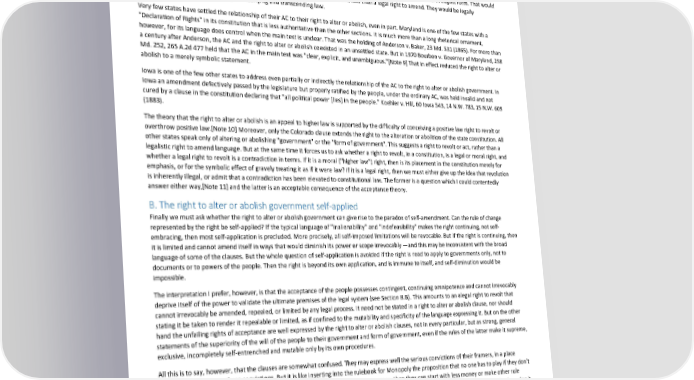 Paradox of Self-Amendment by Peter Suber could be accomplished in principle through an AC. Against this theory is the reflection that neither Thomas Jefferson nor the framers of the state clauses valued anarchy enough to recognize a right to create it. Every right to alter or abolish clause without exception declares that the right is "inalienable" or "indefeasible". That suggests that this particular type of amendment power is continuing, not self-embracing. It also suggests an appeal to higher law. Although inalienable rights may be guaranteed by ordinary positive law, the clauses may intend to secure positive law by moral law. They may be guarantees of the liberties by which the nation and its states came into being, including the right to revolt, without intending to be guarantees "in law". They may exist, even in otherwise enforceable sections of the constitution, as symbols of the state's principles and willingness to declare them in august form. That would make them more than rhetorical adornment and in different ways both more and less than a legal right to amend. They would be legally unenforceable declarations of a right underlying and transcending law. Very few states have settled the relationship of their AC to their right to alter or abolish, even in part. Maryland is one of the few states with a "Declaration of Rights" in its constitution that is less authoritative than the other sections. It is much more than a long rhetorical ornament, however, for its language does control when the main text is unclear. That was the holding of Anderson v. Baker, 23 Md. 531 (1865). For more than a century after Anderson, the AC and the right to alter or abolish coexisted in an unsettled state. But in 1970 Bourbon v. Governor of Maryland, 258 Md. 252, 265 A.2d 477 held that the AC in the main text was "clear, explicit, and unambiguous."[Note 9] That in effect reduced the right to alter or abolish to a merely symbolic statement. Iowa is one of the few other states to address even partially or indirectly the relationship of the AC to the right to alter or abolish government. In Iowa an amendment defectively passed by the legislature but properly ratified by the people, under the ordinary AC, was held invalid and not cured by a clause in the constitution declaring that "all political power [lies] in the people." Koehler v. Hill, 60 Iowa 543, 14 N.W. 783, 15 N.W. 609 (1883). The theory that the right to alter or abolish is an appeal to higher law is supported by the difficulty of conceiving a positive law right to revolt or overthrow positive law.[Note 10] Moreover, only the Colorado clause extends the right to the alteration or abolition of the state constitution. All other states speak only of altering or abolishing "government" or the "form of government". This suggests a right to revolt or act, rather than a legalistic right to amend language. But at the same time it forces us to ask whether a right to revolt, in a constitution, is a legal or moral right, and whether a legal right to revolt is a contradiction in terms. If it is a moral ("higher law") right, then is its placement in the constitution merely for emphasis, or for the symbolic effect of gravely treating it as if it were law? If it is a legal right, then we must either give up the idea that revolution is inherently illegal, or admit that a contradiction has been elevated to constitutional law. The former is a question which I could contentedly answer either way,[Note 11] and the latter is an acceptable consequence of the acceptance theory. B. The right to alter or abolish government self-applied Finally we must ask whether the right to alter or abolish government can give rise to the paradox of self-amendment. Can the rule of change represented by the right be self-applied? If the typical language of "inalienability" and "indefeasibility" makes the right continuing, not self- embracing, then most self-application is precluded. More precisely, all self-imposed limitations will be revocable. But if the right is continuing, then it is limited and cannot amend itself in ways that would diminish its power or scope irrevocably —and this may be inconsistent with the broad language of some of the clauses. But the whole question of self-application is avoided if the right is read to apply to governments only, not to documents or to powers of the people. Then the right is beyond its own application, and is immune to itself, and self-diminution would be impossible. The interpretation I prefer, however, is that the acceptance of the people possesses contingent, continuing omnipotence and cannot irrevocably deprive itself of the power to validate the ultimate premises of the legal system (see Section 8.B). This amounts to an alegal right to revolt that cannot irrevocably be amended, repealed, or limited by any legal process. It need not be stated in a right to alter or abolish clause, nor should stating it be taken to render it repealable or limited, as if confined to the mutability and specificity of the language expressing it. But on the other hand the unfailing rights of acceptance are well expressed by the right to alter or abolish clauses, not in every particular, but as strong, general statements of the superiority of the will of the people to their government and form of government, even if the rules of the latter make it supreme, exclusive, incompletely self-entrenched and mutable only by its own procedures. All this is to say, however, that the clauses are somewhat confused. They may express well the serious convictions of their framers, in a place somewhat germane to those convictions. But it is like inserting into the rulebook for Monopoly the proposition that no one has to play if they don't want to, and that if they begin, then they can quit, and that if everyone playing agrees, then they can start with less money or make other rule changes. It may not go without saying to some players, so the insertion may be an effective com
