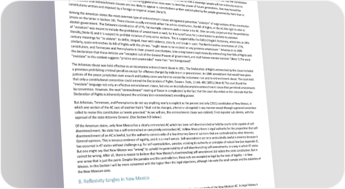 Paradox of Self-Amendment by Peter Suber Section 8 between complete and incomplete entrenchment, between original and self-imposed entrenchment, and between limitations on amendment by protection (or as contradiction) and limitations by incompetency (or as ultra vires). Each of these distinctions applies within irreflexive entrenchment as well as within self-entrenchment. "Disentrenchment" is the repeal of an entrenchment clause, and "self- disentrenchment" is the repeal of an entrenching clause on a rule of change by that very rule of change. If a clause said that the AC could not be amended at all, then the AC could repeal that clause only by self-disentrenchment. Complex variations and combinations of entrenching language are not to be expected in actual constitutions, for most drafters are not genuinely worried that their ACs (unlike many substantive provisions) will be amended in haste or carelessness, and most are concerned that the constitution ring with solemnity and elegance, not perplex like a brain-teaser. Another reason is certainly that a sovereign people will not ordinarily want to limit its power to make law, although often the founding generation does want to limit the power of future generations. One may hazard the generalization that entrenchment clauses are less likely to appear in constitutions written and adopted by the people governed by them than in constitutions written and imposed by a foreign or imperial power.[Note 5] Among the American states the most common type of entrenchment clause ambiguously proscribes "violation" of large sections of the constitution (more on the latter in Section 18). These clauses usually entrench either the whole constitution, the Bill of Rights, or the AC-like right to alter or abolish government. The Delaware constitution of 1776, for example, contains such a clause in its AC. One can only conjecture that the prohibition of "violation" was meant to include the prohibition of amendment as well, for it is superfluous for a constitution to prohibit its violation literally,[Note 6] and it is suspect to prohibit violation of only some sections. This is supported by the Oxford English Dictionary, which lists as 18th century meanings for "to violate": to defile, despoil, treat with violence, disturb, and break in upon. The North Carolina constitution of 1776, similarly, quasi-entrenches its Bill of Rights with the phrase, "ought never to be violated on any pretense whatsoever." Arkansas in its 1836 constitution, and Tennessee and Pennsylvania in their present constitutions, take a step toward explicitness by entrenching their Bills of Rights with the declaration that those Articles are "excepted out of the General Powers of government, and shall forever remain inviolate."[Note 7] The word "inviolate" in this context suggests "pristine and unamended" more than "not transgressed". The Arkansas clause was held effective as an incomplete entrenchment clause in 1851. The Declaration of Rights entrenched by the clause included a provision prohibiting criminal penalties except for offenses charged by indictment or presentment. An 1846 amendment that would have given justices of the peace jurisdiction over assault and battery cases was held to violate the indictment rule and its entrenchment clause. The court held that only a constitutional convention could amend the Declaration of Rights. Eason v. State, 11 Ark. 481 (1851).[Note 8] The court found the "inviolate" language not only an effective entrenchment clause, but also an impliedly incomplete entrenchment clause that permitted amendments by convention. However, the neat "entrenchment" reading of Eason is complicated by the fact that the court also relied on the rationale that the Declaration of Rights is inherently beyond the ordinary (non-conventional) amending power. But Arkansas, Tennessee, and Pennsylvania do not say anything nearly as explicit as the present and only (1911) constitution of New Mexico, in which one section of the AC says of another that it "shall not be changed, altered or abrogated in any manner except through a general convention called to revise this constitution as herein provided." As we will see, this entrenchment clause was violated, if not repealed sub silentio, with the approval of the state Attorney General. (See Section 9.B below.) Of the American states, only New Mexico has a clearly entrenched AC which has been self-disentrenched or held by courts to be capable of self- disentrenchment. No state has a self-entrenched or completely entrenched AC. In New Mexico there is legal authority for the proposition that self- disentrenchment of an AC is lawful, but the authority consists only of a few Attorney General opinions that are contradicted by other Attorney General opinions. This is tenuous evidence of legality, and it is a small sample. Self-amendment per se is undoubtedly lawful in America because it has occurred in 47 states without challenge e.g. for self-contradiction, paradox, violating its authority or principles of natural law (see Appendix 2). But one might say that New Mexico was "wrong" to uphold the permissibility of self-disentrenching self-amendments, in a way in which 47 states cannot be wrong. After all, there is reason to believe that New Mexico's disentrenching self-amendment did violate the state constitution. But in one sense that is just the point. Despite the paradox and the contradiction, these acts are accepted as legal by the tests of legality —in New Mexico. In this Section I will be more concerned with the logical than the legal objections, although I do note the small sample and the dubieties of the New Mexican case. B. Reflexivity tangles in New Mexico If the paradox of self-amendment were never raised by Alf Ross, it would be raised by the spectacle of the New Mexican AC. Its legal history is wonderfully complicated. The New Mexican AC contains five sections, the first of which contains a complete description of the non-conventio