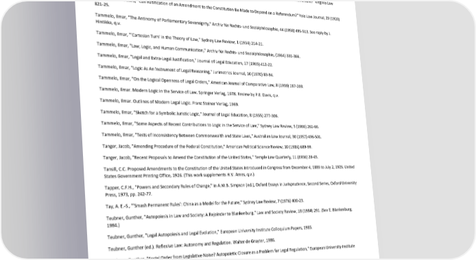 Paradox of Self-Amendment by Peter Suber Swift, H.H., "Adaptation of Law to Changing Social and Economic Conditions," Georgia Bar Association, (1925) 189-213. Swindler, William F. (ed.). Sources and Documents of United States Constitutions. Oceana Publications, 10 vols., 1973. Swineburne, Richard, "Omnipotence," American Philosophical Quarterly, 10 (1973) 231-37. Swisher, Carl Brent. American Constitutional Development. Houghton Mifflin Co., 2d ed. 1954. Taft, Henry W., "Amendment of the Federal Constitution: Is the Power Conferred by Article V Limited by the Tenth Amendment?" Virginia Law Review, 16 (1930) 647-58. Taft, William Howard, "Can Ratification of an Amendment to the Constitution Be Made to Depend on a Referendum?" Yale Law Journal, 29 (1920) 821-25. Tammelo, Ilmar, "The Antinomy of Parliamentary Sovereignty," Archiv für Rechts- und Sozialphilosophie, 44 (1958) 495-513. See reply by J. Hintikka, q.v. Tammelo, Ilmar, "'Cartesian Turn' in the Theory of Law," Sydney Law Review, 1 (1954) 214-21. Tammelo, Ilmar, "Law, Logic, and Human Communication," Archiv für Rechts- und Sozialphilosophie, (1964) 331-366. Tammelo, Ilmar, "Legal and Extra-Legal Justification," Journal of Legal Education, 17 (1965) 412-22. Tammelo, Ilmar, "Logic As An Instrument of Legal Reasoning," Jurimetrics Journal, 10 (1970) 89-94. Tammelo, Ilmar, "On the Logical Openness of Legal Orders," American Journal of Comparative Law, 8 (1959) 187-203. Tammelo, Ilmar. Modern Logic in the Service of Law. Springer Verlag, 1978. Review by P.E. Davis, q.v. Tammelo, Ilmar. Outlines of Modern Legal Logic. Franz Steiner Verlag, 1969. Tammelo, Ilmar, "Sketch for a Symbolic Juristic Logic," Journal of Legal Education, 8 (1955) 277-306. Tammelo, Ilmar, "Some Aspects of Recent Contributions to Logic in the Service of Law," Sydney Law Review, 5 (1966) 261-66. Tammelo, Ilmar, "Tests of Inconsistency Between Commonwealth and State Laws," Australian Law Journal, 30 (1957) 496-501. Tanger, Jacob, "Amending Procedure of the Federal Constitution," American Political Science Review, 10 (1916) 689-99. Tanger, Jacob, "Recent Proposals to Amend the Constitution of the United States," Temple Law Quarterly, 11 (1936) 28-45. Tansill, C.C. Proposed Amendments to the Constitution of the United States Introduced in Congress from December 4, 1889 to July 2, 1926. United States Government Printing Office, 1926. (This work supplements H.V. Ames, q.v.) Tapper, C.F.H., "Powers and Secondary Rules of Change," in A.W.B. Simpson (ed.), Oxford Essays in Jurisprudence, Second Series, Oxford University Press, 1973, pp. 242-77. Tay, A. E.-S., "'Smash Permanent Rules': China as a Model for the Future," Sydney Law Review, 7 (1976) 400-23. Teubner, Gunther, "Autopoiesis in Law and Society: A Rejoinder to Blankenburg," Law and Society Review, 18 (1984) 291. (See E. Blankenburg, 1984.) Teubner, Gunther, "Legal Autopoiesis and Legal Evolution," European University Institute Colloquium Papers, 1985. Teubner, Gunther (ed.). Reflexive Law: Autonomy and Regulation. Walter de Gruyter, 1986. Teubner, Gunther, "Social Order from Legislative Noise? Autopoietic Closure as a Problem for Legal Regulation," European University Institute Colloquium Papers, 1985. Teubner, Gunther, "Substantive and Reflexive Elements in Modern Law," Law and Society Review, 17 (1983) 239. Themaat, H.L. van, "The Equality of Status of the Dominions and the Sovereignty of the British Parliament," Journal of Comparative Legislation, 3d series, 15 (1953) 47-53. Thomas, David Y., "Amending a State Constitution by Custom," American Political Science Review, 23 (1929) 920-21. Thompson, J. David, "The Amendment of the Federal Constitution," Proceedings of the Academy of Political Science, 3 (1912) 65-77. 214