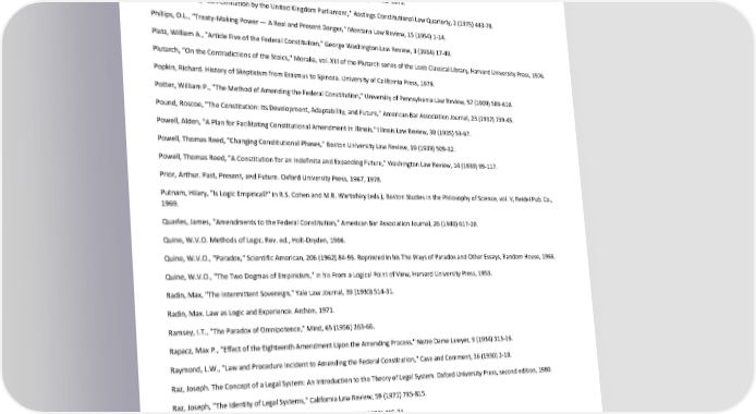 Paradox of Self-Amendment by Peter Suber Perry, T.D., "Judicial Method and the Concept of Reasoning," Buffalo Law Review, 19 (1970) 225-46. Perry, T.D., "Moral and Judicial Reasoning: A Structural Analogy," Buffalo Law Review, 22 (1973) 769-96. Philip, J.R., "Some Reflections on Desuetude," Juridical Review, 43 (1931) 260-67. Phillips, H.S., "Has the Congress the Power Under Article V of the Constitution to Call and Regulate the Holding of Ratifying Conventions Independent of State Legislatures?" Florida S.B.A.L. Journal, 6 (1933) 573-78. Phillips, O. Hood. Constitutional and Administrative Law. Sweet and Maxwell, 5th ed. 1973. Phillips, O. Hood, "Self-Limitation by the United Kingdom Parliament," Hastings Constitutional Law Quarterly, 2 (1975) 443-78. Phillips, O.L., "Treaty-Making Power — A Real and Present Danger," Montana Law Review, 15 (1954) 1-14. Platz, William A., "Article Five of the Federal Constitution," George Washington Law Review, 3 (1934) 17-49. Plutarch, "On the Contradictions of the Stoics," Moralia, vol. XIII of the Plutarch series of the Loeb Classical Library, Harvard University Press, 1976. Popkin, Richard. History of Skepticism from Erasmus to Spinoza. University of California Press, 1979. Potter, William P., "The Method of Amending the Federal Constitution," University of Pennsylvania Law Review, 57 (1909) 589-610. Pound, Roscoe, "The Constitution: Its Development, Adaptability, and Future," American Bar Association Journal, 23 (1937) 739-45. Powell, Alden, "A Plan for Facilitating Constitutional Amendment In Illinois," Illinois Law Review, 30 (1935) 59-67. Powell, Thomas Reed, "Changing Constitutional Phases," Boston University Law Review, 19 (1939) 509-32. Powell, Thomas Reed, "A Constitution for an Indefinite and Expanding Future," Washington Law Review, 14 (1939) 99-117. Prior, Arthur. Past, Present, and Future. Oxford University Press, 1967, 1978. Putnam, Hilary, "Is Logic Empirical?" in R.S. Cohen and M.R. Wartofsky (eds.), Boston Studies in the Philosophy of Science, vol. V, Reidel Pub. Co., 1969. Quarles, James, "Amendments to the Federal Constitution," American Bar Association Journal, 26 (1940) 617-20. Quine, W.V.O. Methods of Logic. Rev. ed., Holt-Dryden, 1966. Quine, W.V.O., "Paradox," Scientific American, 206 (1962) 84-96. Reprinted in his The Ways of Paradox and Other Essays, Random House, 1966. Quine, W.V.O., "The Two Dogmas of Empiricism," in his From a Logical Point of View, Harvard University Press, 1953. Radin, Max, "The Intermittent Sovereign," Yale Law Journal, 39 (1930) 514-31. Radin, Max. Law as Logic and Experience. Archon, 1971. Ramsey, I.T., "The Paradox of Omnipotence," Mind, 65 (1956) 263-66. Rapacz, Max P., "Effect of the Eighteenth Amendment Upon the Amending Process," Notre Dame Lawyer, 9 (1934) 313-16. Raymond, L.W., "Law and Procedure Incident to Amending the Federal Constitution," Case and Comment, 36 (1930) 2-10. Raz, Joseph. The Concept of a Legal System: An Introduction to the Theory of Legal System. Oxford University Press, second edition, 1980. Raz, Joseph, "The Identity of Legal Systems," California Law Review, 59 (1971) 795-815. Raz, Joseph, "Professor Ross and Some Legal Puzzles," Mind, 81 (1972) 415-21. Recasens-Siches, Luis, "The Logic of the Reasonable as Differentiated from the Logic of the Rational (Human Reason in the Making and Interpretation of Law)," in Ralph A. Newman (ed.), Essays in Jurisprudence in Honor of Roscoe Pound, Bobbs-Merrill, 1962, pp. 192-221. Rees, W.J., "The Theory of Sovereignty Restated," Mind, 59 (1950) 495-521. Reeves, J.E., and K.E. Vanlandingham, "Amending and Revising State Constitutions," Kentucky Law Journal, 35 (1947) 119-28. Regis, Ed. Who Got Einstein's Office? Addison-Wesley, 1987. 210
