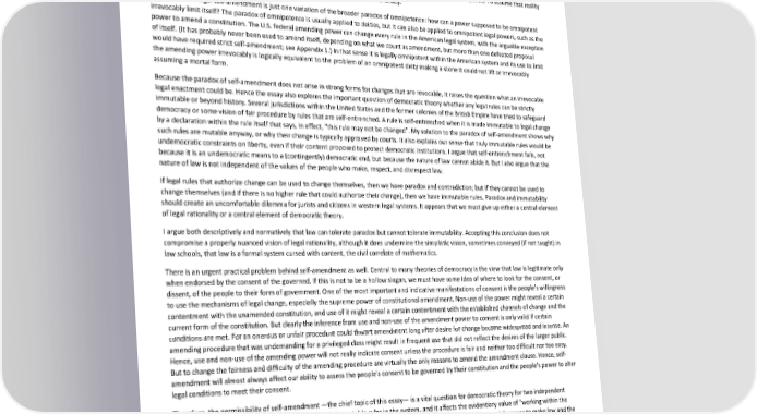 Paradox of Self-Amendment by Peter Suber Moreover, my quarrel with Ross's a priori prejudices about law do not reach the utility or universal application of formal logics. I object only to the view that formal models of law are prior to law in the sense that deviating legal practices can be branded unlawful. Other claims on behalf of the universal application of formal logics are both true and harmless. For example, I think it trivially true to say that law (like any reality) is susceptible to formal representations or abridgments whose varying degrees of accuracy and completeness make them useful for various purposes. Like polygons inscribed in a circle, whose ragged perimeters approach the continuous curvature of the circle as the number of their sides increases, formal models of realities may be accurate to an arbitrary degree, and may perhaps (outside human history) even reach the limiting case of perfect accuracy. But for us formal models are created precisely to be simplifications that are accurate only for a few salient points. To assume that reality is polygonal because one's model is elegant or intelligible is a natural, but comical fallacy. The paradox of legal self-amendment is just one variation of the broader paradox of omnipotence: how can a power supposed to be omnipotent irrevocably limit itself? The paradox of omnipotence is usually applied to deities, but it can also be applied to omnipotent legal powers, such as the power to amend a constitution. The U.S. federal amending power can change every rule in the American legal system, with the arguable exception of itself. (It has probably never been used to amend itself, depending on what we count as amendment, but more than one defeated proposal would have required strict self-amendment; see Appendix 1.) In that sense it is legally omnipotent within the American system and its use to limit the amending power irrevocably is logically equivalent to the problem of an omnipotent deity making a stone it could not lift or irrevocably assuming a mortal form. Because the paradox of self-amendment does not arise in strong forms for changes that are revocable, it raises the question what an irrevocable legal enactment could be. Hence the essay also explores the important question of democratic theory whether any legal rules can be strictly immutable or beyond history. Several jurisdictions within the United States and the former colonies of the British Empire have tried to safeguard democracy or some vision of fair procedure by rules that are self-entrenched. A rule is self-entrenched when it is made immutable to legal change by a declaration within the rule itself that says, in effect, "this rule may not be changed". My solution to the paradox of self-amendment shows why such rules are mutable anyway, or why their change is typically approved by courts. It also explains our sense that truly immutable rules would be undemocratic constraints on liberty, even if their content proposed to protect democratic institutions. I argue that self-entrenchment fails, not because it is an undemocratic means to a (contingently) democratic end, but because the nature of law cannot abide it. But I also argue that the nature of law is not independent of the values of the people who make, respect, and disrespect law. If legal rules that authorize change can be used to change themselves, then we have paradox and contradiction; but if they cannot be used to change themselves (and if there is no higher rule that could authorize their change), then we have immutable rules. Paradox and immutability should create an uncomfortable dilemma for jurists and citizens in western legal systems. It appears that we must give up either a central element of legal rationality or a central element of democratic theory. I argue both descriptively and normatively that law can tolerate paradox but cannot tolerate immutability. Accepting this conclusion does not compromise a properly nuanced vision of legal rationality, although it does undermine the simplistic vision, sometimes conveyed (if not taught) in law schools, that law is a formal system cursed with content, the civil correlate of mathematics. There is an urgent practical problem behind self-amendment as well. Central to many theories of democracy is the view that law is legitimate only when endorsed by the consent of the governed. If this is not to be a hollow slogan, we must have some idea of where to look for the consent, or dissent, of the people to their form of government. One of the most important and indicative manifestations of consent is the people's willingness to use the mechanisms of legal change, especially the supreme power of constitutional amendment. Non-use of the power might reveal a certain contentment with the unamended constitution, and use of it might reveal a certain contentment with the established channels of change and the current form of the constitution. But clearly the inference from use and non-use of the amendment power to consent is only valid if certain conditions are met. For an onerous or unfair procedure could thwart amendment long after desire for change became widespread and intense. An amending procedure that was undemanding for a privileged class might result in frequent use that did not reflect the desires of the larger public. Hence, use and non-use of the amending power will not really indicate consent unless the procedure is fair and neither too difficult nor too easy. But to change the fairness and difficulty of the amending procedure are virtually the only reasons to amend the amendment clause. Hence, self- amendment will almost always affect our ability to assess the people's consent to be governed by their constitution and the people's power to alter legal conditions to meet their consent. Therefore, the permissibility of self-amendment —the chief topic of this essay— is a vital question for democratic theory for two independent reasons. It determines whether th