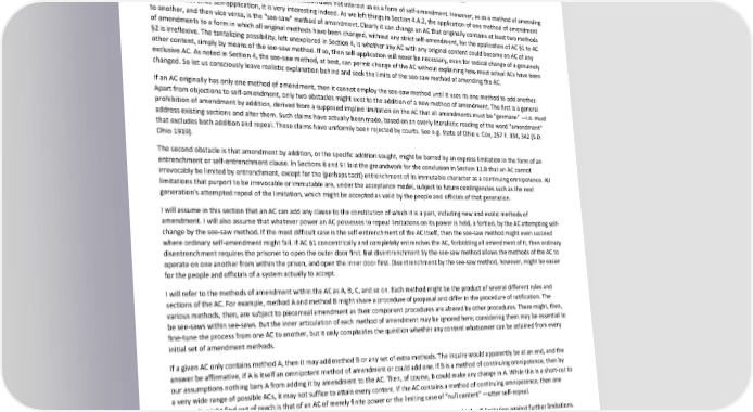 Paradox of Self-Amendment by Peter Suber Section 13: The See-Saw Method Self-amendment may loosely be said to occur whenever an AC has been applied to itself. As suggested in Section 2, for some purposes it would not be illegitimate to speak of self-amendment when an AC was applied to any section of the constitution, for any amendment might be thought to use the constitution's supremacy against itself. But the paradox is sharpest, and by properly rigorous standards perhaps only exists, when the very same section or clause or method is used to change itself, directly or indirectly. If AC §1 describes a complete method of amendment and AC §2 describes another, then no paradox arises when AC §1 is used to amend AC §2 or vice versa. Because both rules belong to an article called "the amendment clause", we might say that "self-amendment" has occurred, but that would mistake form for substance. The application of one section of an AC to another section does not interest us as a form of self-amendment. However, as as a method of amending the AC without strict self-application, it is very interesting indeed. As we left things in Section 4.A.2, the application of one method of amendment to another, and then vice versa, is the "see-saw" method of amendment. Clearly it can change an AC that originally contains at least two methods of amendments to a form in which all original methods have been changed, without any strict self-amendment, for the application of AC §1 to AC §2 is irreflexive. The tantalizing possibility, left unexplored in Section 4, is whether any AC with any original content could become an AC of any other content, simply by means of the see-saw method. If so, then self-application will never be necessary, even for radical change of a genuinely exclusive AC. As noted in Section 4, the see-saw method, at best, can permit change of the AC without explaining how most actual ACs have been changed. So let us consciously leave realistic explanation behind and seek the limits of the see-saw method of amending the AC. If an AC originally has only one method of amendment, then it cannot employ the see-saw method until it uses its one method to add another. Apart from objections to self-amendment, only two obstacles might exist to the addition of a new method of amendment. The first is a general prohibition of amendment by addition, derived from a supposed implied limitation on the AC that all amendments must be "germane" —i.e. must address existing sections and alter them. Such claims have actually been made, based on an overly literalistic reading of the word "amendment" that excludes both addition and repeal. These claims have uniformly been rejected by courts. See e.g. State of Ohio v. Cox, 257 F. 334, 342 (S.D. Ohio 1919). The second obstacle is that amendment by addition, or the specific addition sought, might be barred by an express limitation in the form of an entrenchment or self-entrenchment clause. In Sections 8 and 9 I laid the groundwork for the conclusion in Section 11.B that an AC cannot irrevocably be limited by entrenchment, except for the (perhaps tacit) entrenchment of its immutable character as a continuing omnipotence. All limitations that purport to be irrevocable or immutable are, under the acceptance model, subject to future contingencies such as the next generation's attempted repeal of the limitation, which might be accepted as valid by the people and officials of that generation. I will assume in this section that an AC can add any clause to the constitution of which it is a part, including new and exotic methods of amendment. I will also assume that whatever power an AC possesses to repeal limitations on its power is held, a fortiori, by the AC attempting self- change by the see-saw method. If the most difficult case is the self-entrenchment of the AC itself, then the see-saw method might even succeed where ordinary self-amendment might fail. If AC §1 concentrically and completely entrenches the AC, forbidding all amendment of it, then ordinary disentrenchment requires the prisoner to open the outer door first. But disentrenchment by the see-saw method allows the methods of the AC to operate on one another from within the prison, and open the inner door first. Disentrenchment by the see-saw method, however, might be easier for the people and officials of a system actually to accept. I will refer to the methods of amendment within the AC as A, B, C, and so on. Each method might be the product of several different rules and sections of the AC. For example, method A and method B might share a procedure of proposal and differ in the procedure of ratification. The various methods, then, are subject to piecemeal amendment as their component procedures are altered by other procedures. There might, then, be see-saws within see-saws. But the inner articulation of each method of amendment may be ignored here; considering them may be essential to fine-tune the process from one AC to another, but it only complicates the question whether any content whatsoever can be attained from every initial set of amendment methods. If a given AC only contains method A, then it may add method B or any set of extra methods. The inquiry would apparently be at an end, and the answer be affirmative, if A is itself an omnipotent method of amendment or could add one. If B is a method of continuing omnipotence, then by our assumptions nothing bars A from adding it by amendment to the AC. Then, of course, B could make any change in A. While this is a short-cut to a very wide range of possible ACs, it may not suffice to attain every content. If the AC contains a method of continuing omnipotence, then one content it might find out of reach is that of an AC of merely finite power or the limiting case of "null content" —utter self-repeal. By my general arguments in Sections 8 and 9, an AC of continuing omnipotence contains an "immutable" self-limitation against further limitations. If B is t