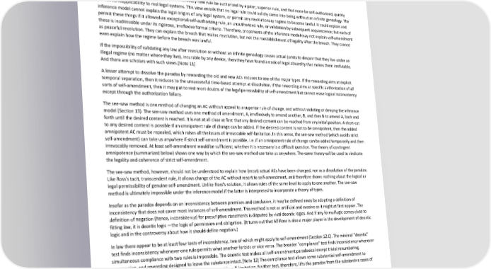 Paradox of Self-Amendment by Peter Suber AC to become valid could permissibly appeal to, or invent, such a rule. Ross's tacit rule, however, does not dissolve the paradox even if taken at face value. It neither removes the contradiction of self-amendment, nor admits and domesticates it. His strategy avoids self-amendment altogether and finds another way to effect the change of constitutional ACs. The price for making strict self-amendment unnecessary is to admit an absolutely immutable rule —namely, the tacit, transcendent rule authorizing the change of the AC. For Ross all rules of change but one can be changed; the exception, by the nature of the case, is the supreme rule of change. Because self-amendment is ruled out, the supreme rule of change cannot change itself and, because it is supreme, there is no higher rule to authorize its change.[Note 10] This particular result reflects his more general principle that all legal change is authorized only by prior, higher rules of change. This principle in effect incorporates a theory of types into his version of the inference model. The requirements of the inference model that every new rule be authorized by a prior, superior rule, and that none be self-authorized, quickly proves its inapplicability to real legal systems. This view entails that no legal rule could validly come into being without an infinite genealogy. The inference model cannot explain the legal origins of any legal system, or permit any revolutionary regime to become lawful. It could explain and permit these things if it allowed an exceptional self-authorizing rule, an unauthorized rule, or validation by subsequent acquiescence; but each of these is inadmissible under its rigorous, irreflexive formal criteria. Therefore, proponents of the inference model may not explain self-amendment as peaceful revolution. They can explain the breach that makes revolution, but not the reestablishment of legality after the breach. They cannot even explain how the regime before the breach was lawful. If the impossibility of validating any law after revolution or without an infinite genealogy causes actual jurists to despair that they live under an illegal regime (no matter where they live), incurable by any device, then they have found a nook of legal absurdity that makes them irrefutable. And there are scholars with such views.[Note 11] A lesser attempt to dissolve the paradox by rewording the old and new ACs reduces to one of the major types. If the rewording aims at explicit temporal separation, then it reduces to the unsuccessful time-based attempt at dissolution. If the rewording aims at specific authorization of all sorts of self-amendment, then it may put to rest most doubts of the legal permissibility of self-amendment but cannot erase logical inconsistency except through the authorization fallacy. The see-saw method is one method of changing an AC without appeal to a superior rule of change, and without violating or denying the inference model (Section 13). The see-saw method uses one method of amendment, A, irreflexively to amend another, B, and then B to amend A, back and forth until the desired content is reached. It is not at all clear at first that any desired content can be reached from any initial position. A short-cut to any desired content is possible if an omnipotent rule of change can be added. If the desired content is not to be omnipotent, then the added omnipotent AC must be repealed, which raises all the issues of irrevocable self-limitation. In this sense, the see-saw method (which avoids strict self-amendment) can take us anywhere if strict self-amendment is possible, i.e. if an omnipotent rule of change can be added temporarily and then irrevocably removed. At least self-amendment would be sufficient; whether it is necessary is a difficult question. The theory of contingent omnipotence (summarized below) shows one way by which the see-saw method can take us anywhere. The same theory will be used to vindicate the legality and coherence of strict self-amendment. The see-saw method, however, should not be understood to explain how (most) actual ACs have been changed, nor as a dissolution of the paradox. Like Ross's tacit, transcendent rule, it allows change of the AC without resort to self-amendment, and therefore shows nothing about the logical or legal permissibility of genuine self-amendment. Unlike Ross's solution, it allows rules of the same level to apply to one another. The see-saw method is ultimately impossible under the inference model if the latter is interpreted to incorporate a theory of types. Insofar as the paradox depends on an inconsistency between premises and conclusion, it may be defined away by adopting a definition of inconsistency that does not cover most instances of self-amendment. This method is not as artificial and evasive as it might at first appear. The definition of negation (hence, inconsistency) for prescriptive statements is disputed by rival deontic logics. And if any formal logic comes close to fitting law, it is deontic logic —the logic of permission and obligation. (It turns out that Alf Ross is also a major player in the development of deontic logic and in the controversy about how it should define negation.) In law there appear to be at least four tests of inconsistency, two of which might apply to self-amendment (Section 12.C). The minimal "deontic" test finds inconsistency whenever one rule permits what another forbids or vice versa. The broader "compliance" test finds inconsistency whenever simultaneous compliance with two rules is impossible. The deontic test makes all self-amendment paradoxical except trivial renumbering, rearranging, and rewording designed to leave the substance intact.[Note 12] The compliance test allows some substantial self-amendment to escape contradiction and paradox, but not most irrevocable self-limitation. Neither test, therefore, lifts the paradox from the substantive cases of self-amendment 