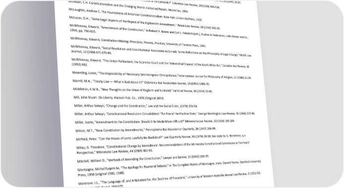 Paradox of Self-Amendment by Peter Suber McBain, Howard Lee. Prohibition, Legal and Illegal. Macmillan, 1928. McCarty, L. Thorne, "Permissions and Obligations: An Informal Introduction," forthcoming, North-Holland. McCloskey, Clifton, "Along the Midway: Some Thoughts on Democratic Constitution-Amending," Michigan Law Review, 66 (1968) 1001-16. McCoy, Thomas R., "Logic vs. Value Judgment in Legal and Ethical Thought," Vanderbilt Law Review, 23 (1971) 1277-96. McGechan, R.O., "The Statute of Westminster: Legislative Powers of the New Zealand Parliament," New Zealand Law Journal, 20 (1944) 18-20. McGovney, D.O., "Is the Eighteenth Amendment Void Because of its Contents?" Columbia Law Review, 20 (1920) 499-518. McIlwain, C.H. Constitutionalism and the Changing World: Collected Papers. Macmillan, 1939. McLaughlin, Andrew C. The Foundations of American Constitutionalism. New York University Press, 1932. McLucas, D.H., "Some Legal Aspects of the Repeal of the Eighteenth Amendment," Illinois Law Review, 28 (1934) 950-58. McWhinney, Edward, "Amendment of the Constitution," in Robert R. Bowie and Carl J. Friedrich (eds.), Studies in Federalism, Little Brown and Co., 1954, pp. 790-815. McWhinney, Edward, Constitution-Making: Principles, Process, Practice, University of Toronto Press, 1981. McWhinney, Edward, "Social Revolution and Constitutional Revolution in Canada: Some Reflections on the Philosophy of Legal Change," McGill Law Journal, 12 (1966-67) 479-84. McWhinney, Edward, "The Union Parliament, the Supreme Court and the 'Entrenched Clauses' of the South Africa Act," Canadian Bar Review, 30 (1952) 692. Meierding, Loren, "The Impossibility of Necessary Omnitemporal Omnipotence," International Journal for Philosophy of Religion, 11 (1980) 21-26. Merrill, M.H., "Treaty-Law — What Is Bad About It?" Oklahoma Bar Association Journal, 24 (1953) 1465-70. Middleton, K.W.B., "New Thoughts on the Union of England and Scotland," Juridical Review, 66 (1954) 37-60. Mill, John Stuart. On Liberty. Hackett Pub. Co., 1978 (Original 1859). Miller, Arthur Selwyn, "Change and the Constitution," Law and the Social Order, (1970) 231-54. Miller, Arthur Selwyn, "Constitutional Revolution Consolidated: The Rise of the Positive State," George Washington Law Review, 35 (1966) 172-90. Miller, Justin, "Amendment to the Constitution: Should It Be Made More difficult?" Minnesota Law Review, 10 (1926) 185-206. Milnor, M.T., "New Constitution by Amendments," Pennsylvania Bar Association Quarterly, 28 (1957) 296-99. Mirfield, Peter, "Can the House of Lords Lawfully Be Abolished?" Law Quarterly Review, 95 (1979) 36-58. See reply by G. Winterton, q.v. Mitau, G. Theodore, "Constitutional Change by Amendment: Recommendations of the Minnesota Constitutional Commission in Ten Years' Perspective," Minnesota Law Review, 44 (1960) 461-81. Mitchell, William D., "Methods of Amending the Constitution," Lawyer and Banker, 25 (1932) 265-70. Montaigne, Michel Eyqem de, "The Apology for Raymond Sebond," in The Complete Works of Montaigne, trans. Donald Frame, Stanford University Press, 1958 (original 1580, 1588). Montrose. J.L., "The Language of, and A Notation for, the Doctrine of Precedent," University of Western Australia Annual Law Review, 2 (1951-53) Part I, 301-329; Part II, 504-525. Moore, Ronald, "Legal Permission," Archiv für Rechts- und Sozialphilosophie, 59 (1973) 327-46. Morse, Howard Newcomb, "Amendments to the Constitution: A Study in the Problems Presented by the Integration into the Constitution of Certain Amendatory Articles," New Jersey Law Journal, 71 (1948) 365, 367, 371. Morse, Howard Newcomb, "May an Amendment to the U.S. Constitution Be Unconstitutional?" Dickenson Law Review, 10 (1949) 199-200. Moschzisker, Robert von, "Dangers in Disregarding Fundamental Conceptions When Amending the Federal Constitution," Cornell Law Quarterly, 11 (1925) 1-19. 208