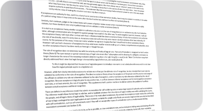 Paradox of Self-Amendment by Peter Suber The formalist theory that legal rules are validated only by other legal rules requires either an infinite regress, an exceptional rule that is validated either by itself or by an extra-legal source of authority such as acceptance. On the simpler reading of Hart, he has chosen the latter path (validation by an extra-legal source of authority), and to that extent differs from Ross only on the permissibility of exceptions and on the authority of the ultimate rule of recognition. But in fact Hart does not adhere to a one-exception inference model of legal change. First, he denies that the rule of recognition is the only rule authorized directly by acceptance, and he gives other examples. For instance, the holdings, and even the jurisdictional basis, of some cases of first impression, and cases in which judges must exercise discretion are not validated by prior law but only (and contingently) by the acceptance they inspire. On this point Hart says,[Note 3] The truth may be that, when courts settle previously unenvisioned questions concerning the most fundamental constitutional rules, they get their authority to decide them accepted after the questions have arisen and the decision has been given. Here all that succeeds is success....[I]t will often in retrospect be said, and may genuinely appear, that there always was an 'inherent' power in the courts to do what they have done. Yet this may be a pious fiction, if the only evidence for it is the success of what has been done....Here the power acquires authority ex post facto from success....The statement that the court always had an inherent power to rule in this way would surely only be a way of making the situation look more tidy than it really is. If acceptance is an authority for law, and if it is a fact of social practice more than normative ideality, then it may be created in a society in the wake of a judicial ruling; hence it may come on the scene after the law it authorizes and have its effect retroactively.[Note 4] Similarly, Hart continues, judges in the United States with powers of judicial review accept certain standards limiting their discretion to nullify statutes, but these standards exist only in judicial usage and are validated only by acceptance.[Note 5] It is vital to an acceptance theory whether acceptance authorizes only one rule (the rule of recognition) or can authorize any rule. Hart holds the latter, although commentators who disregard the quoted passage have read him the other way. To avoid exegetical quarrels, however, I will call the acceptance theory I will most often contrast with Ross's inference model the direct acceptance theory. It holds that acceptance can authorize any rule of law directly, even if it rarely does so. Acceptance does not authorize only some master rule that validates other laws indirectly. Of course, for the purposes of this essay, it does not matter whether we agree or disagree that Hart himself held the direct acceptance theory. However I will use Hart's discussion of acceptance to show what issues must be raised in making such a theory comprehensive and plausible, since no other acceptance theorist has done nearly so thorough or thoughtful a job. The rule of recognition does not determine law with the certainty and finality of logical rules. That sort of formalism is repugnant to Hart's entire theory.[Note 6] The open texture or partial indeterminacy of legal rules means that "subsumption and the drawing of a syllogistic conclusion no longer characterize the nerve of the reasoning involved in determining what is the right thing [for a court] to do."[Note 7] In his later essay Hart directly addressed Ross's view that legal change is transacted by logical inferences, and replied,[Note 8] To this it might be objected that the exercise of legislative powers to introduce new norms is not a deductive inference and it is not clear how this logical principle applies to a legislative act. However, while Hart clearly intended acceptance to validate more than just the ultimate rule of recognition, he also intended that most rules be validated by conformity to the rules of recognition. The direct acceptance theory allows the acceptance of the people and the practice and usage of the officials to validate any rule not otherwise validated by the rule of recognition, and to invalidate any rule otherwise validated by the rule of recognition. Because acceptance is logically prior to any positive law, in conflicts between informal acceptance and formal recognition acceptance overrules, or at least amends, the rule of recognition. This supplements Hart's position insofar as he did not address the problem of conflicts between actual acceptance and literal recognition. There are defects in any inference model that admits no exceptions for self-validating rules or some alegal source of authority such as acceptance. The inference model allows formal logic to rule law, and to invalidate whatever fails the criteria of logical validity even while satisfying the courts, the people, and all legal criteria of legal validity. This is one of its most salient weaknesses. By contrast the acceptance model makes the conformity of law to logic contingent for each legal system at each moment; certainly the people and officials can accept a legal act that can only be described with self-contradiction, such as self-amendment, even if they will not accept other types of contradiction such as simultaneously binding inconsistent commands (see Section 21.B). The inference model conceives legal rules to be, as far as possible, as clean and determinate, and as immune to fading away and shading off as the rules of mathematics. Legal rules do differ from mathematical rules, in their origin at certain moments in time by human will, their mutability according to certain procedures and human will, and the spatial limitations on their validity. Sometimes reading Ross one detects a note of wistful re