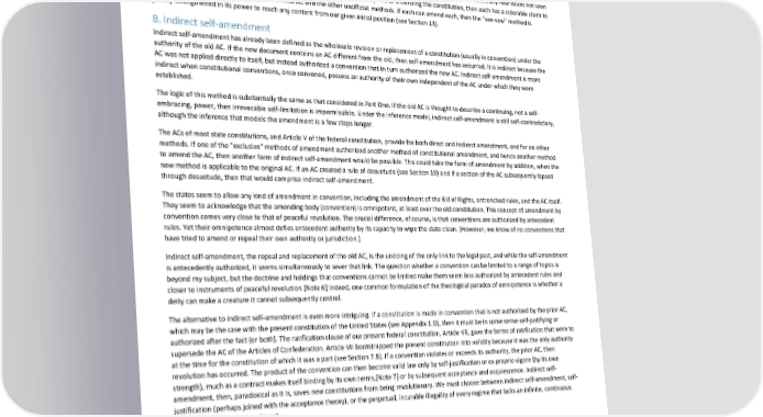 Paradox of Self-Amendment by Peter Suber The "unofficial" methods of amendment affect the problem of self-amendment in two ways. First, they may in principle amend the "exclusive" AC and prevent its immutability even if self-amendment is not allowed. In this sense they decrease the chance that any legal rule will be found immutable. Similarly, they increase the chance that the utter self-repeal of the AC will not entirely extinguish the amending power. Or, from another standpoint, they make it easier for a judge to find an inherent or residual power to amend, if a constitution lacks an AC from inadvertence or self-repeal. Second, as rules of change in their own right, they may be self-applied. For each of the six methods I will ask how it might be self-applicable, whether our legal history shows anything that might be a case of its self-application, and whether its self-application raises any new issues not seen in the self-application of an offical AC. If the unofficial methods are indeed capable of amending the constitution, then each has a colorable claim to supremacy that conflicts with that of the official AC and the other unofficial methods. If each can amend each, then the "see-saw" method is greatly strengthened in its power to reach any content from our given initial position (see Section 13). B. Indirect self-amendment Indirect self-amendment has already been defined as the wholesale revision or replacement of a constitution (usually in convention) under the authority of the old AC. If the new document contains an AC different from the old, then self-amendment has occurred. It is indirect because the AC was not applied directly to itself, but instead authorized a convention that in turn authorized the new AC. Indirect self-amendment is more indirect when constitutional conventions, once convened, possess an authority of their own independent of the AC under which they were established. The logic of this method is substantially the same as that considered in Part One. If the old AC is thought to describe a continuing, not a self- embracing, power, then irrevocable self-limitation is impermissible. Under the inference model, indirect self-amendment is still self-contradictory, although the inference that models the amendment is a few steps longer. The ACs of most state constitutions, and Article V of the federal constitution, provide for both direct and indirect amendment, and for no other methods. If one of the "exclusive" methods of amendment authorized another method of constitutional amendment, and hence another method to amend the AC, then another form of indirect self-amendment would be possible. This could take the form of amendment by addition, when the new method is applicable to the original AC. If an AC created a rule of desuetude (see Section 19) and if a section of the AC subsequently lapsed through desuetude, then that would comprise indirect self-amendment. The states seem to allow any kind of amendment in convention, including the amendment of the Bill of Rights, entrenched rules, and the AC itself. They seem to acknowledge that the amending body (convention) is omnipotent, at least over the old constitution. This concept of amendment by convention comes very close to that of peaceful revolution. The crucial difference, of course, is that conventions are authorized by antecedent rules. Yet their omnipotence almost defies antecedent authority by its capacity to wipe the slate clean. (However, we know of no conventions that have tried to amend or repeal their own authority or jurisdiction.) Indirect self-amendment, the repeal and replacement of the old AC, is the undoing of the only link to the legal past, and while the self-amendment is antecedently authorized, it seems simultaneously to sever that link. The question whether a convention can be limited to a range of topics is beyond my subject, but the doctrine and holdings that conventions cannot be limited make them seem less authorized by antecedent rules and closer to instruments of peaceful revolution.[Note 6] Indeed, one common formulation of the theological paradox of omnipotence is whether a deity can make a creature it cannot subsequently control. The alternative to indirect self-amendment is even more intriguing. If a constitution is made in convention that is not authorized by the prior AC, which may be the case with the present constitution of the United States (see Appendix 1.D), then it must be in some sense self-justifying or authorized after the fact (or both). The ratification clause of our present federal constitution, Article VII, gave the terms of ratification that were to supersede the AC of the Articles of Confederation. Article VII bootstrapped the present constitution into validity because it was the only authority at the time for the constitution of which it was a part (see Section 7.B). If a convention violates or exceeds its authority, the prior AC, then revolution has occurred. The product of the convention can then become valid law only by self-justification or ex proprio vigore (by its own strength), much as a contract makes itself binding by its own terms,[Note 7] or by subsequent acceptance and acquiescence. Indirect self- amendment, then, paradoxical as it is, saves new constitutions from being revolutionary. We must choose between indirect self-amendment, self- justification (perhaps joined with the acceptance theory), or the perpetual, incurable illegality of every regime that lacks an infinite, continuous history of piecemeal amendment. C. Self-amendment without inconsistency If an AC authorizes its own change into a form not inconsistent with its original form, then even under the inference model there is no paradox. Ross would still object to the extent that self-reference was necessarily involved, but his chief argument would be disarmed. In the inference that models the amendment, the conclusion would not contradict a premise. However, finding an example of such an innocuous 