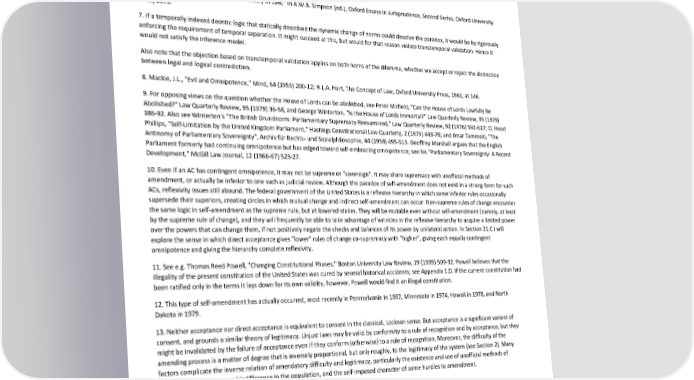 Paradox of Self-Amendment by Peter Suber such a logic looks like, see L. Thorne McCarty, "Permissions and Obligations: An Informal Introduction," forthcoming, North-Holland. For reasons that will appear, even if temporally indexed deontic logic dissolves the paradox, it cannot do so for the inference model. 3. Hicks, J.C., "The Liar Paradox in Legal Reasoning," Cambridge Law Journal, 29 (1971) 275-91. 4. Hart, H.L.A., "Self-Referring Laws," in Festskrift Tillägnad Karl Olivecrona, Stockholm: Kunglia Boktryckeriet, P.A. Norstedt and Söner, 1964, pp. 307-16; reprinted in his Essays in Jurisprudence and Philosophy, Oxford University Press, pp. 170-78. 5. Raz, Joseph, "Professor Ross and Some Legal Puzzles," Mind, 81 (1972) 415-21. 6. Finnis, John M., "Revolutions and Continuity of Law," in A.W.B. Simpson (ed.), Oxford Essays in Jurisprudence, Second Series, Oxford University Press, 1973. 7. If a temporally indexed deontic logic that statically described the dynamic change of norms could dissolve the paradox, it would be by rigorously enforcing the requirement of temporal separation. It might succeed at this, but would for that reason violate transtemporal validation. Hence it would not satisfy the inference model. Also note that the objection based on transtemporal validation applies on both horns of the dilemma, whether we accept or reject the distinction between legal and logical contradiction. 8. Mackie, J.L., "Evil and Omnipotence," Mind, 64 (1955) 200-12; H.L.A. Hart, The Concept of Law, Oxford University Press, 1961, at 146. 9. For opposing views on the question whether the House of Lords can be abolished, see Peter Mirfield, "Can the House of Lords Lawfully Be Abolished?" Law Quarterly Review, 95 (1979) 36-58, and George Winterton, "Is the House of Lords Immortal?" Law Quarterly Review, 95 (1979) 386-92. Also see Winterton's "The British Grundnorm: Parliamentary Supremacy Reexamined," Law Quarterly Review, 92 (1976) 591-617; O. Hood Phillips, "Self-Limitation by the United Kingdom Parliament," Hastings Constitutional Law Quarterly, 2 (1975) 443-78; and Ilmar Tammelo, "The Antinomy of Parliamentary Sovereignty", Archiv für Rechts- und Sozialphilosophie, 44 (1958) 495-513. Geoffrey Marshall argues that the English Parliament formerly had continuing omnipotence but has edged toward self-embracing omnipotence; see his "Parliamentary Sovereignty: A Recent Development," McGill Law Journal, 12 (1966-67) 523-27. 10. Even if an AC has contingent omnipotence, it may not be supreme or "sovereign". It may share supremacy with unofficial methods of amendment, or actually be inferior to one such as judicial review. Although the paradox of self-amendment does not exist in a strong form for such ACs, reflexivity issues still abound. The federal government of the United States is a reflexive hierarchy in which some inferior rules occasionally supersede their superiors, creating circles in which mutual change and indirect self-amendment can occur. Non-supreme rules of change encounter the same logic in self-amendment as the supreme rule, but at lowered stakes. They will be mutable even without self-amendment (namely, at least by the supreme rule of change), and they will frequently be able to take advantage of wrinkles in the reflexive hierarchy to acquire a limited power over the powers that can change them, if not positively negate the checks and balances of its power by unilateral action. In Section 21.C I will explore the sense in which direct acceptance gives "lower" rules of change co-supremacy with "higher", giving each equally contingent omnipotence and giving the hierarchy complete reflexivity. 11. See e.g. Thomas Reed Powell, "Changing Constitutional Phases," Boston University Law Review, 19 (1939) 509-32. Powell believes that the illegality of the present constitution of the United States was cured by several historical accidents; see Appendix 1.D. If the current constitution had been ratified only in the terms it lays down for its own validity, however, Powell would find it an illegal constitution. 12. This type of self-amendment has actually occurred, most recently in Pennsylvania in 1967, Minnesota in 1974, Hawaii in 1978, and North Dakota in 1979. 13. Neither acceptance nor direct acceptance is equivalent to consent in the classical, Lockean sense. But acceptance is a significant variant of consent, and grounds a similar theory of legitimacy. Unjust laws may be valid by conformity to a rule of recognition and by acceptance, but they might be invalidated by the failure of acceptance even if they conform (otherwise) to a rule of recognition. Moreover, the difficulty of the amending process is a matter of degree that is inversely proportional, but only roughly, to the legitimacy of the system (see Section 2). Many factors complicate the inverse relation of amendatory difficulty and legitimacy, particularly the existence and use of unofficial methods of amendment, ignorance and indifference in the population, and the self-imposed character of some hurdles to amendment. 14. This is essentially the position that Hart takes in the essay cited in note 4 above. 15. Terminologically, a rule of law that is contingently unamended forever, but continually subject to amendment, should not be called "immutable", at least not without serious qualification. By calling it "contingently immutable" I intend to capture this qualification. It turns out that contingent immutability is equivalent to contingent mutability. 16. This is not to say that victims of oppressive laws are to blame for their condition. Any acceptance theory of legal authority and change, when fully worked out, must have a place for (1) ideological acceptance, which lacks the cognitive element of free consent, and (2) involuntary acceptance, which lacks the volitional element. The former is unfeigned, perhaps wholehearted and enthusiastic, but ignorant or delusional, and 167